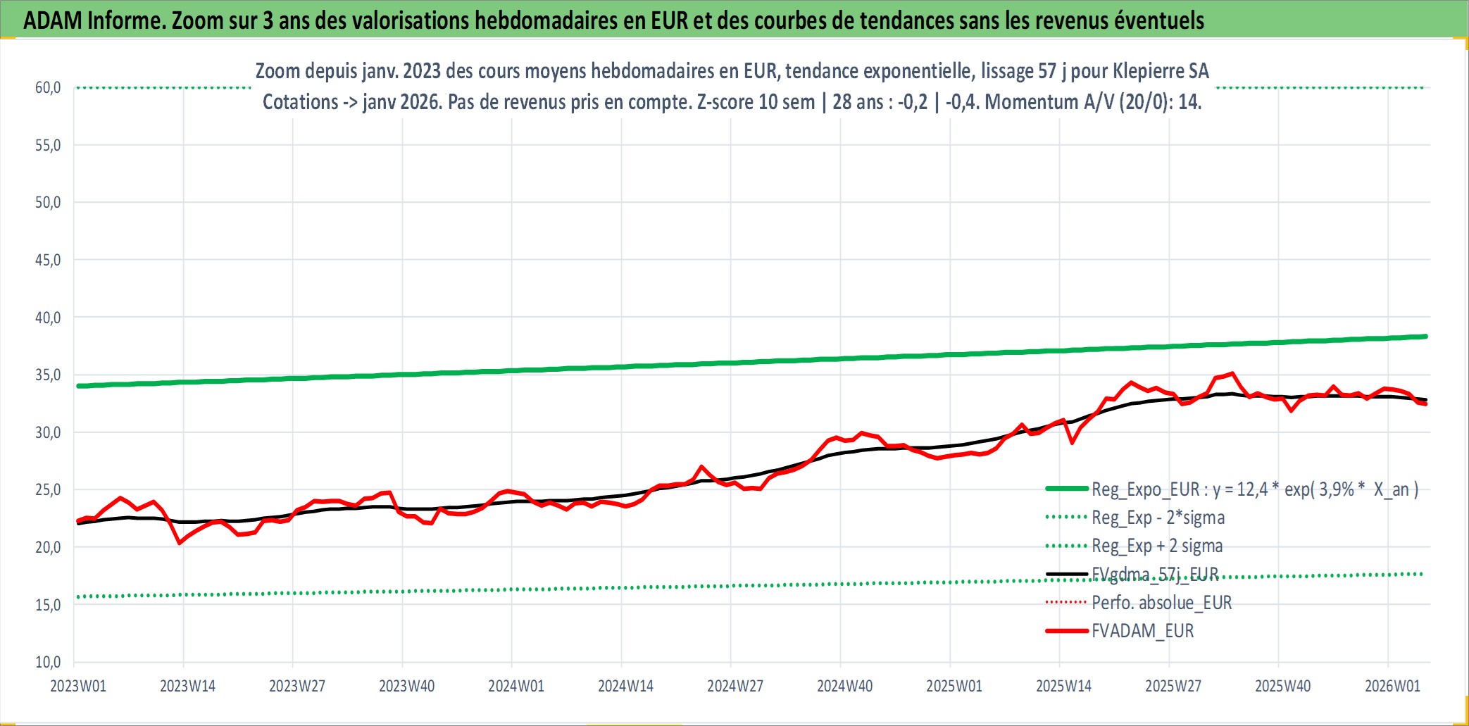 Site dédié aux investisseursPage dédiée sur site financeAnalyse des valorisations hebdomadaires de l'action Klepierre SA. Cet actif est cote en EUR. Les valorisations couvrent les semaines 1997W01 a 2026W05. Les revenus de cet actif financier sont pris en compte depuis la semaine 1997W14. La note globale ESG de cet actif est estimee a 15.0 (apres rebasage entre 0 et 20).