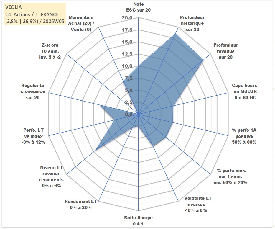 Site dédié aux investisseursPage dédiée sur site financeAnalyse des valorisations hebdomadaires de l'action VEOLIA. Cet actif est cote en EUR. Les valorisations couvrent les semaines 2000W29 a 2026W05. Les revenus de cet actif financier sont pris en compte depuis la semaine 2001W19. La note globale ESG de cet actif est estimee a 10.0 (apres rebasage entre 0 et 20).