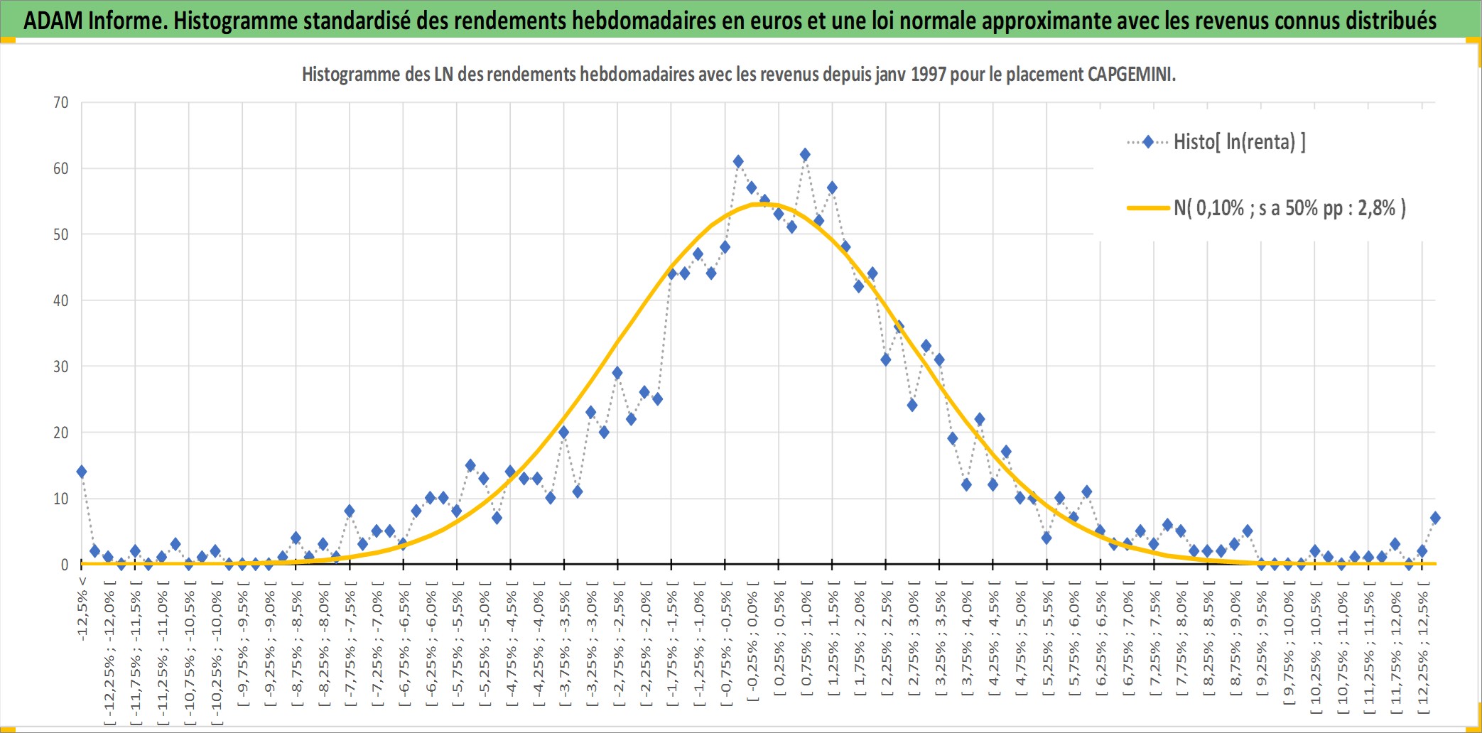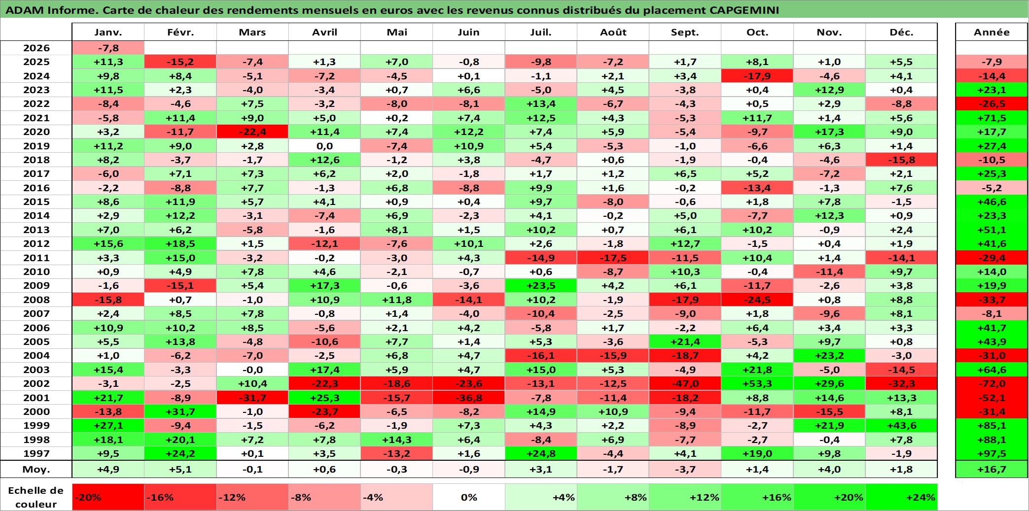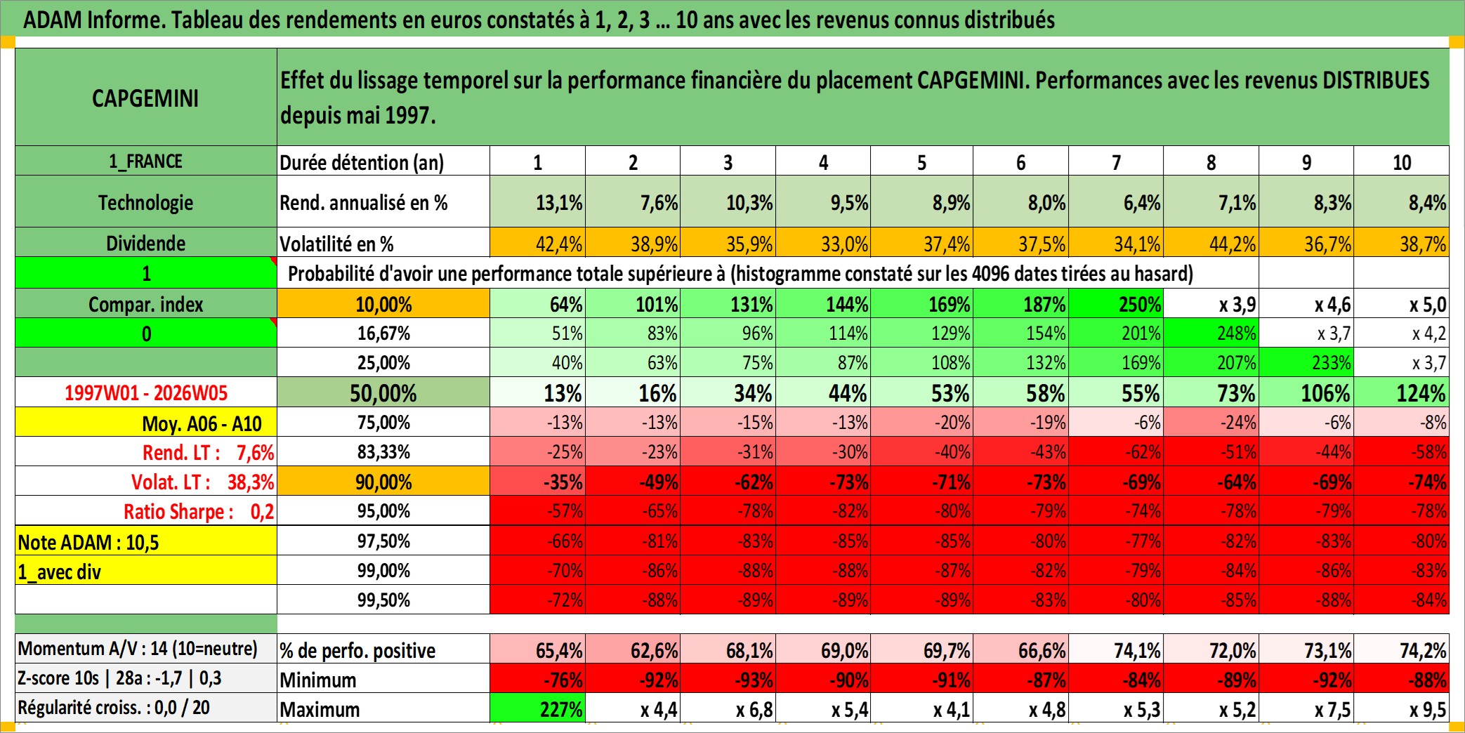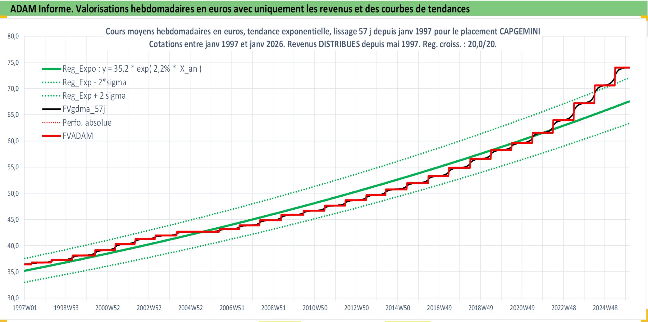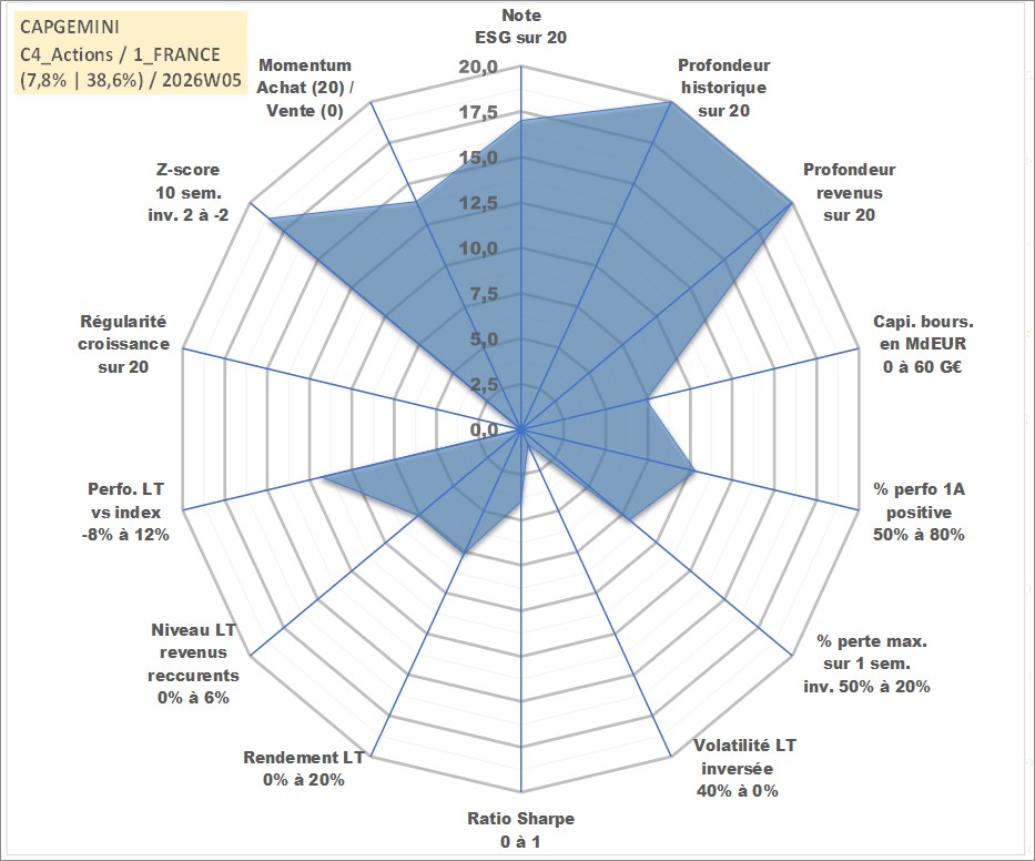 Site dédié aux investisseursPage dédiée sur site financeAnalyse des valorisations hebdomadaires de l'action CAPGEMINI. Cet actif est cote en EUR. Les valorisations couvrent les semaines 1997W01 a 2026W05. Les revenus de cet actif financier sont pris en compte depuis la semaine 1997W19. La note globale ESG de cet actif est estimee a 17.0 (apres rebasage entre 0 et 20).