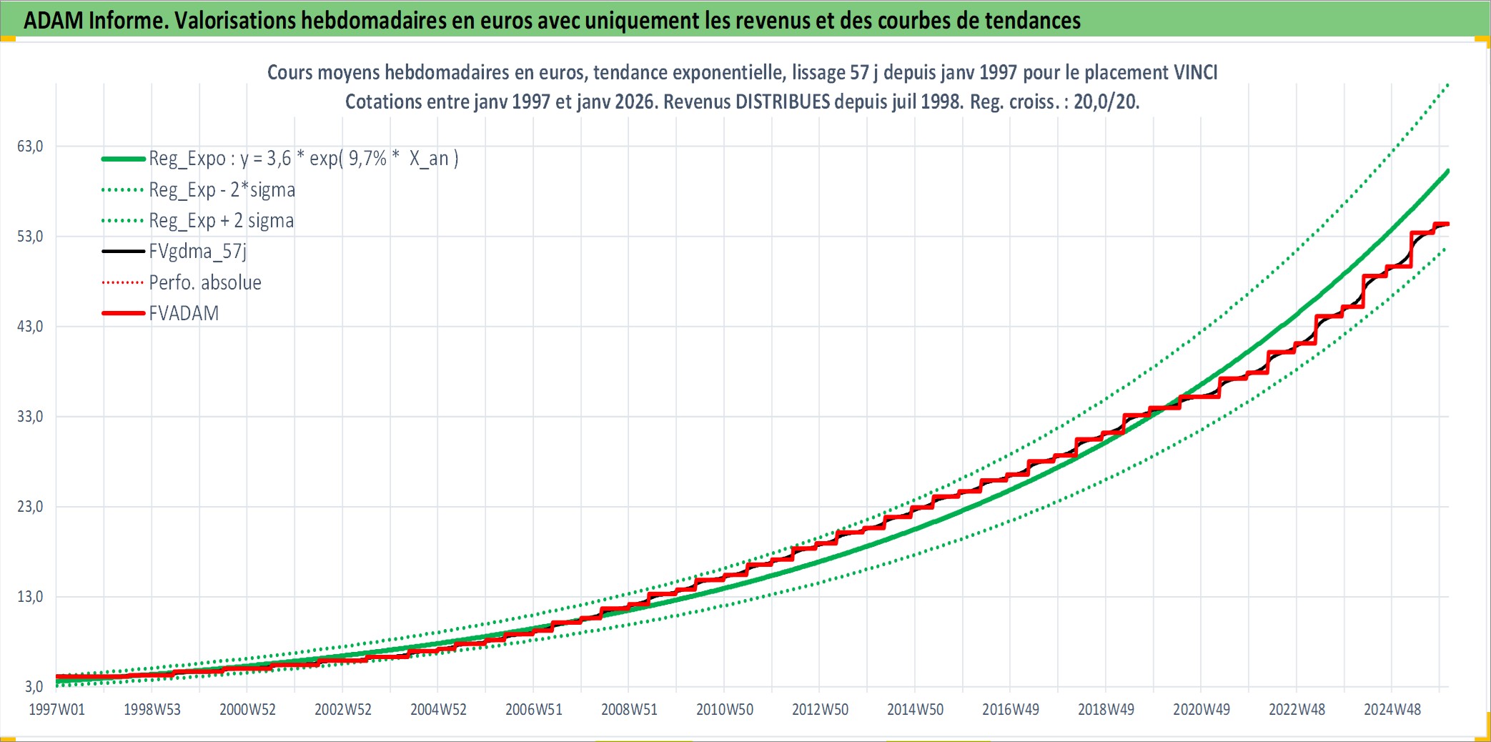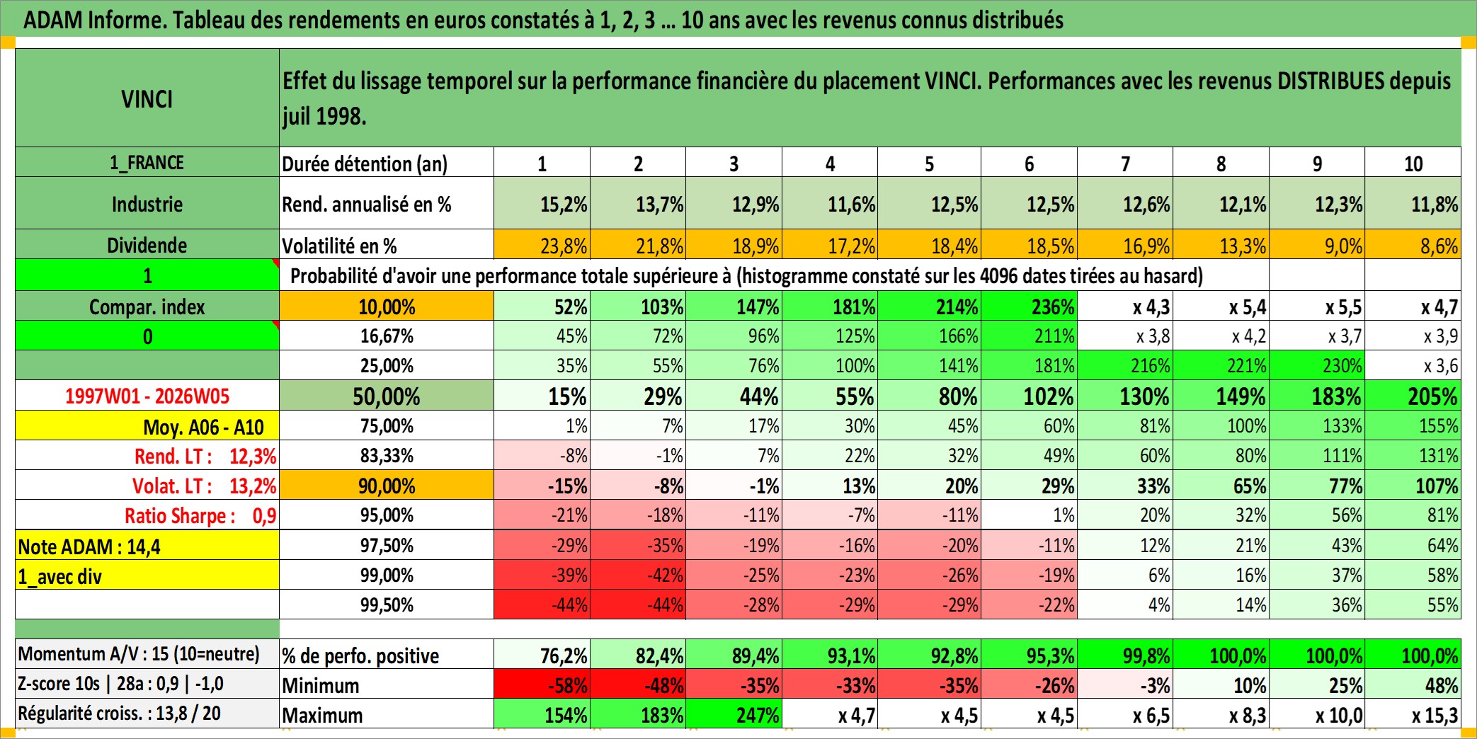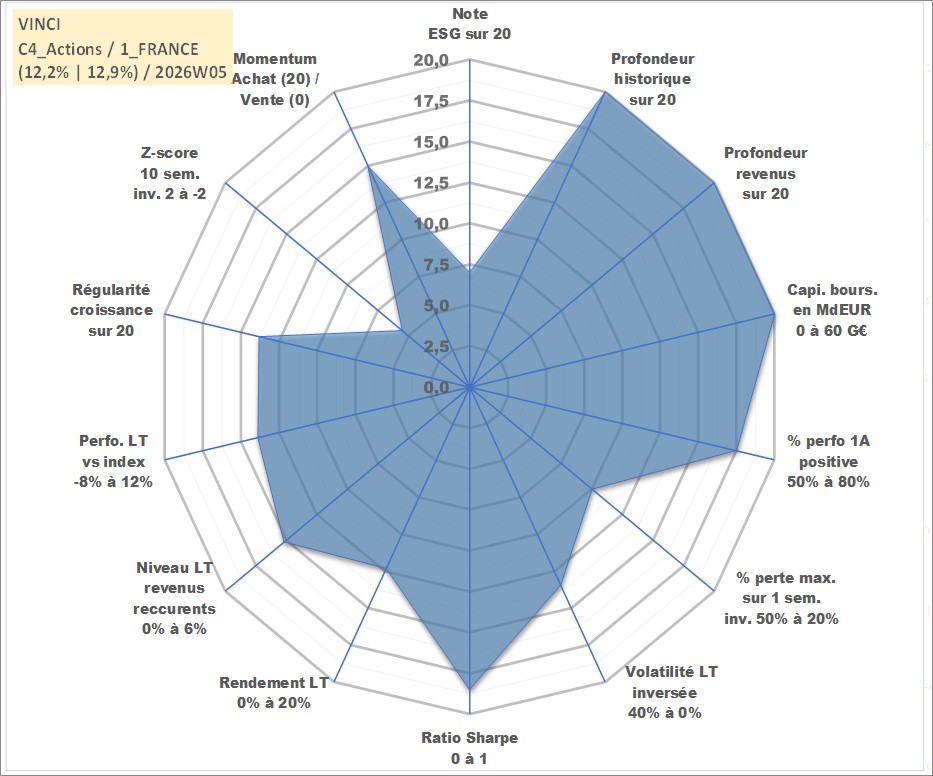 Site dédié aux investisseursPage dédiée sur site financeAnalyse des valorisations hebdomadaires de l'action VINCI. Cet actif est cote en EUR. Les valorisations couvrent les semaines 1997W01 a 2026W05. Les revenus de cet actif financier sont pris en compte depuis la semaine 1998W28. La note globale ESG de cet actif est estimee a 7.0 (apres rebasage entre 0 et 20).
