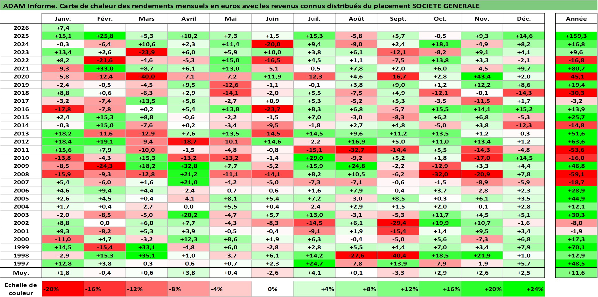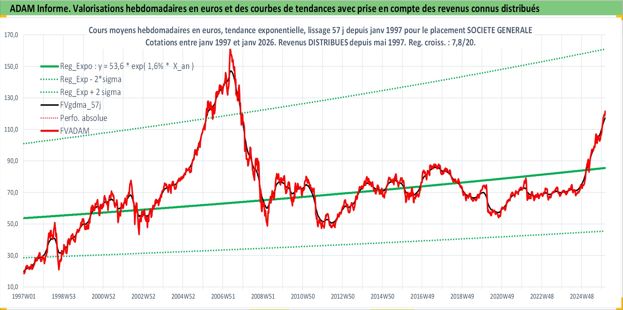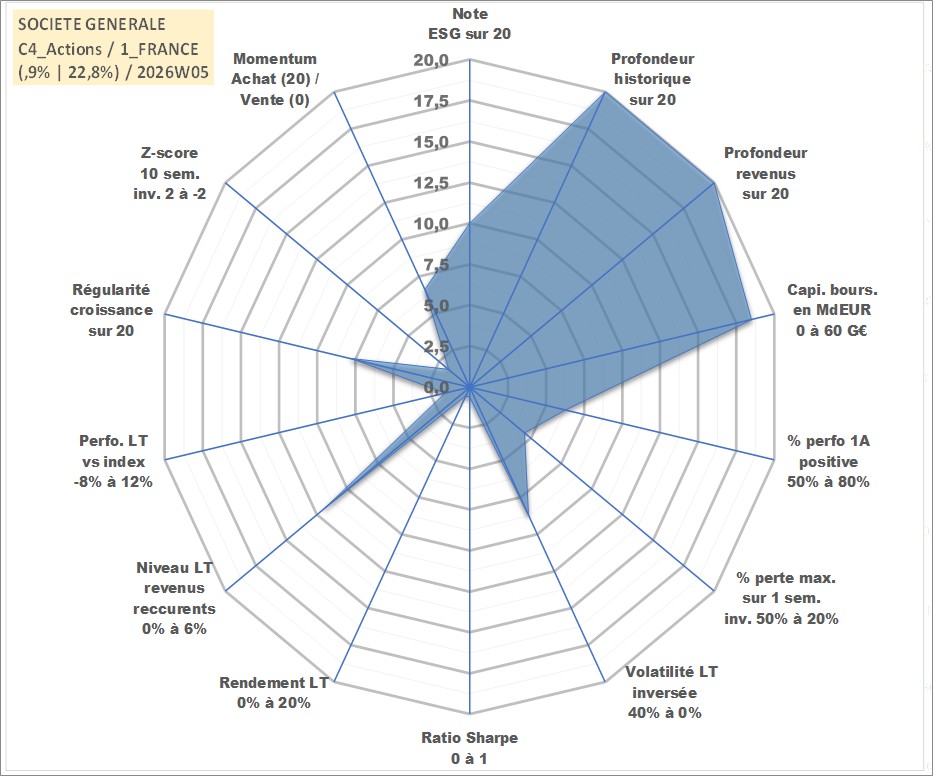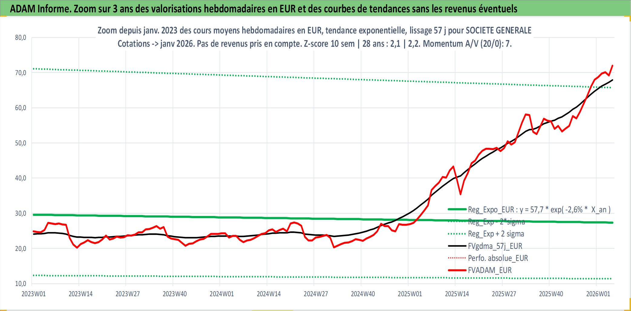 Site dédié aux investisseursPage dédiée sur site financeAnalyse des valorisations hebdomadaires de l'action SOCIETE GENERALE. Cet actif est cote en EUR. Les valorisations couvrent les semaines 1997W01 a 2026W05. Les revenus de cet actif financier sont pris en compte depuis la semaine 1997W21. La note globale ESG de cet actif est estimee a 10.0 (apres rebasage entre 0 et 20).