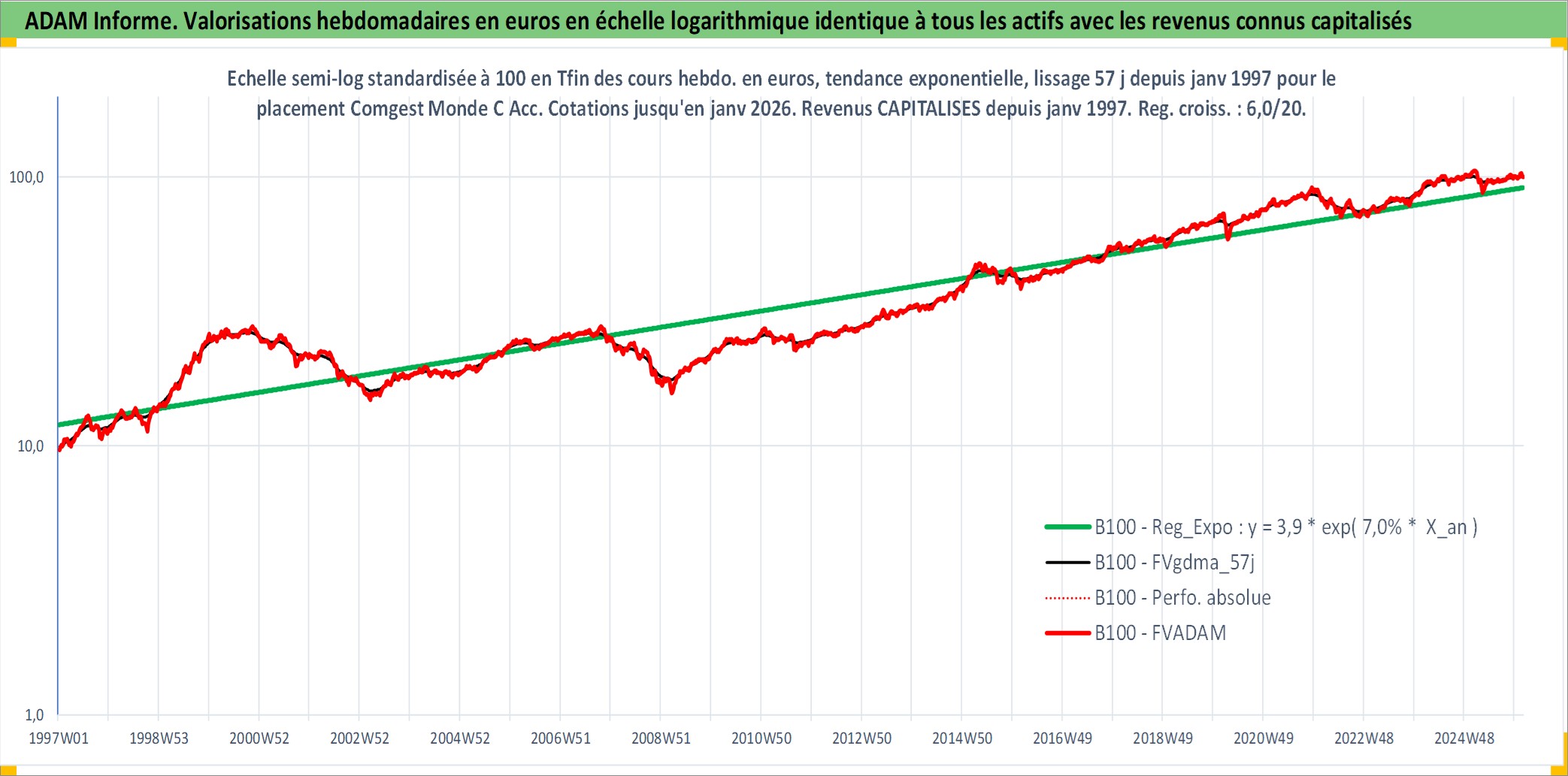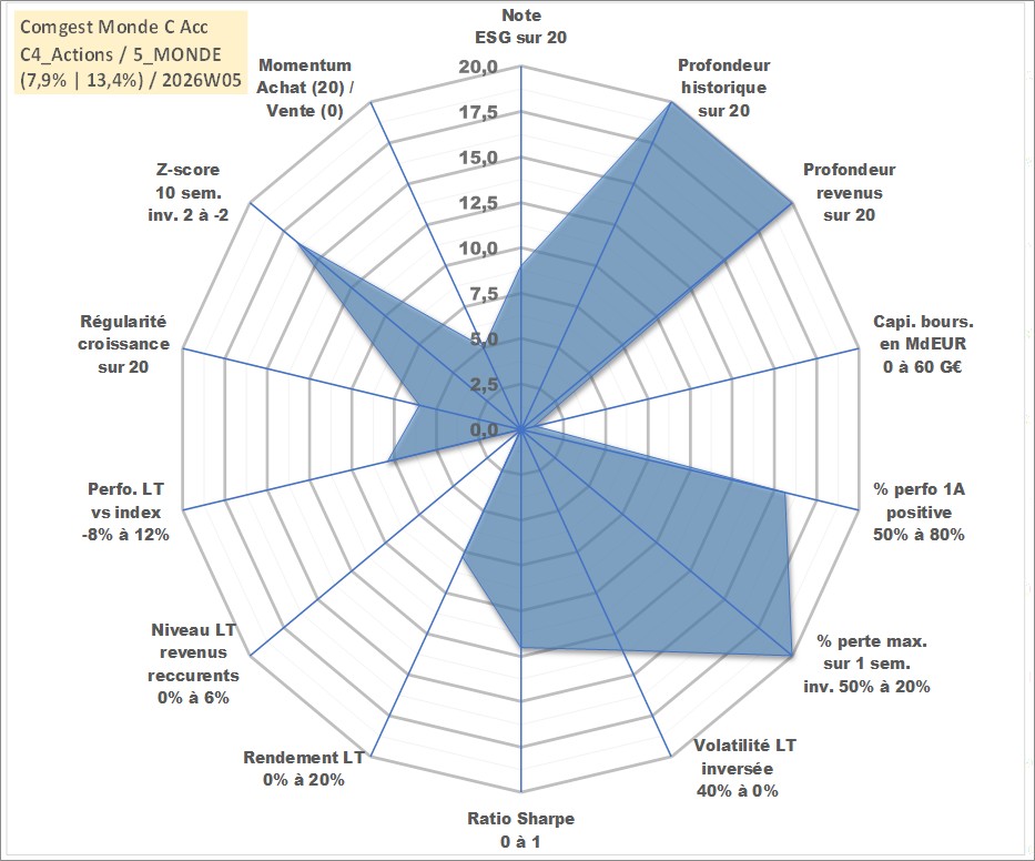 Site dédié aux investisseursPage dédiée sur site financeAnalyse des valorisations hebdomadaires du fonds Comgest Monde C Acc. Cet actif est cote en EUR. Les valorisations couvrent les semaines 1997W01 a 2026W05. Les revenus de cet actif financier sont pris en compte depuis la semaine 1997W01. La note globale ESG de cet actif est estimee a 9.0 (apres rebasage entre 0 et 20).