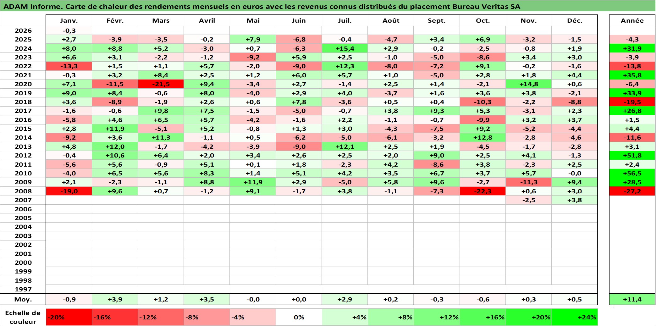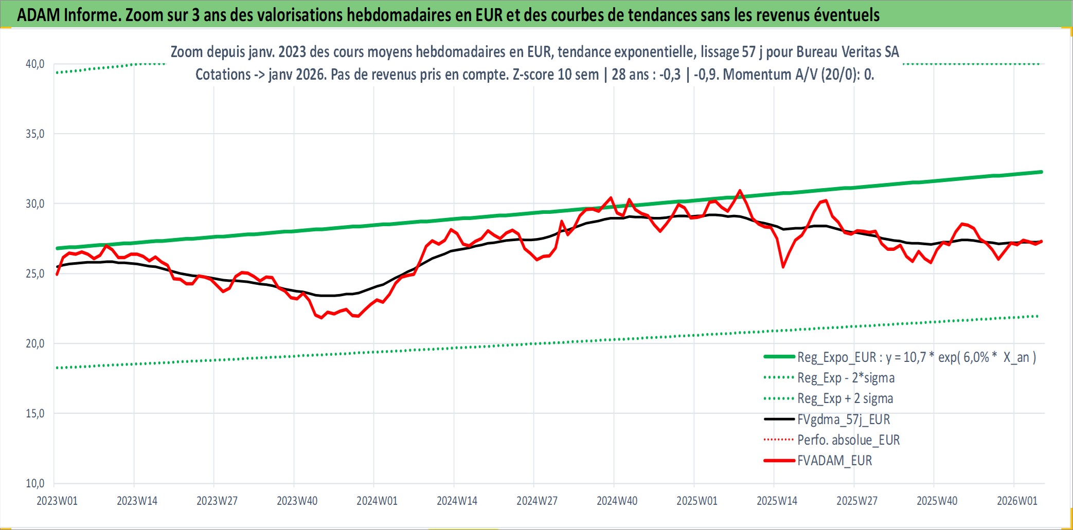 Site dédié aux investisseursPage dédiée sur site financeAnalyse des valorisations hebdomadaires de l'action Bureau Veritas SA. Cet actif est cote en EUR. Les valorisations couvrent les semaines 2007W43 a 2026W05. Les revenus de cet actif financier sont pris en compte depuis la semaine 2008W24. La note globale ESG de cet actif est estimee a 17.0 (apres rebasage entre 0 et 20).