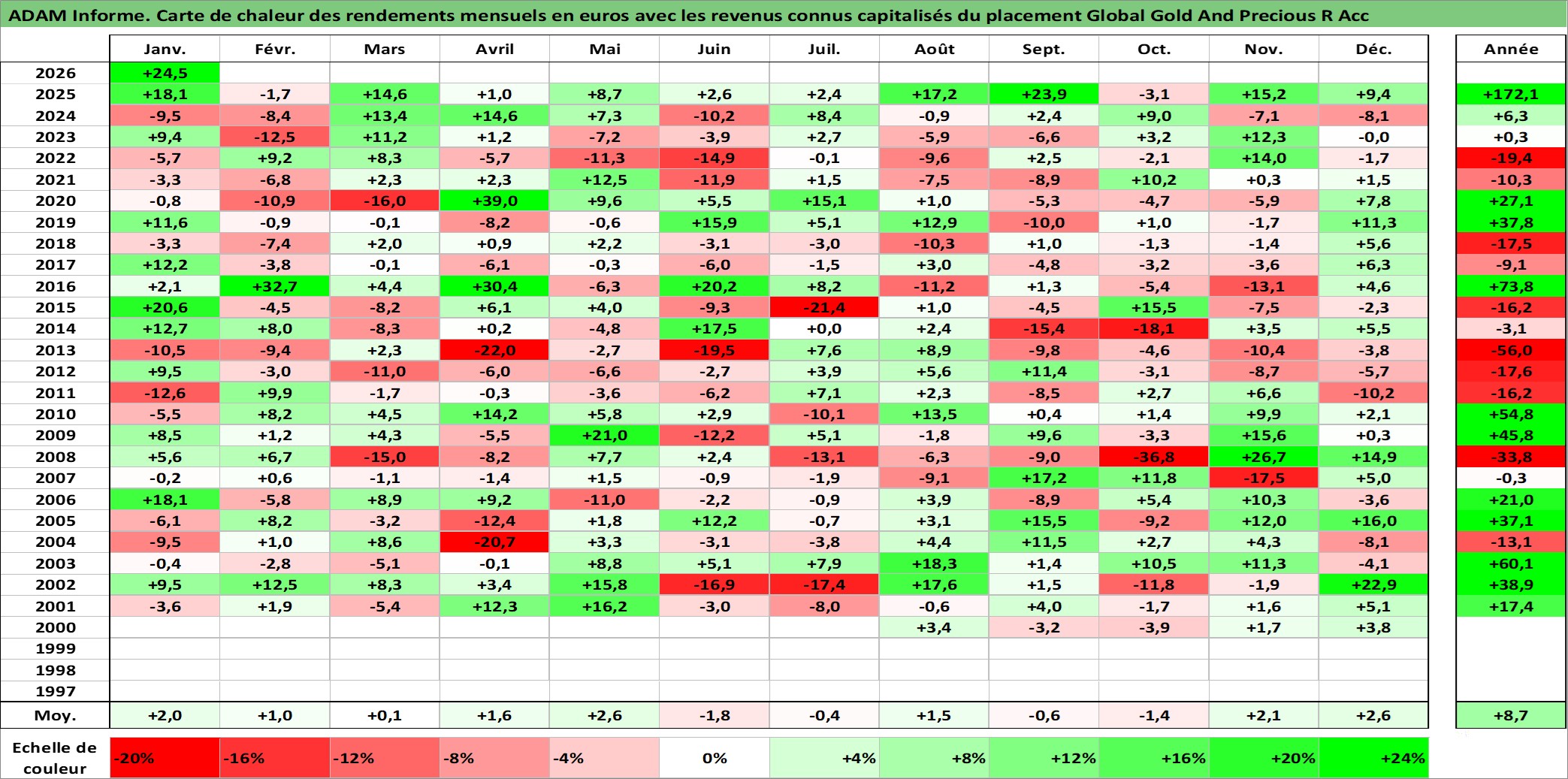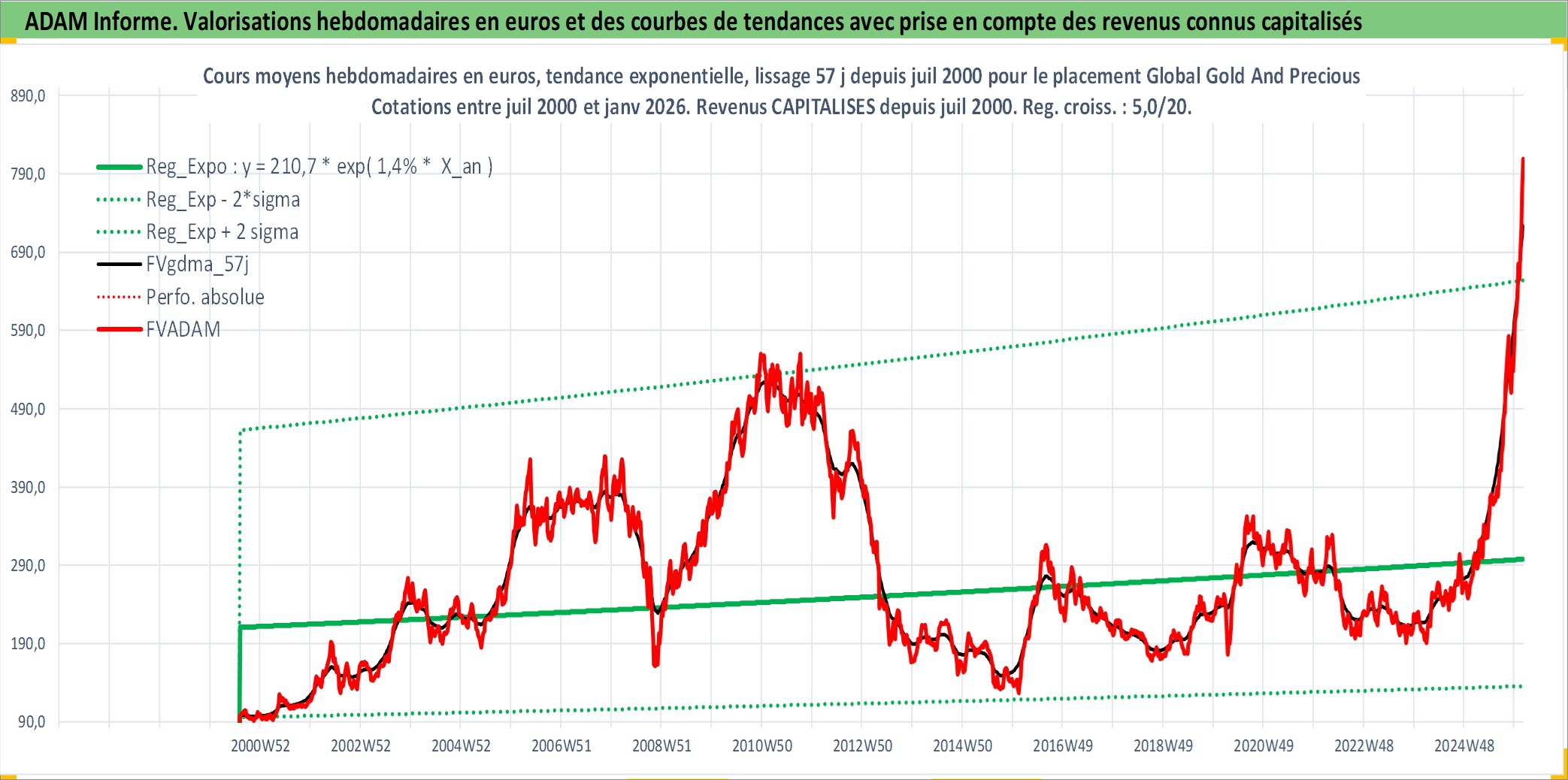 Site dédié aux investisseursPage dédiée sur site financeAnalyse des valorisations hebdomadaires du fonds Global Gold And Precious R Acc. Cet actif est cote en EUR. Les valorisations couvrent les semaines 2000W31 a 2026W05. Les revenus de cet actif financier sont pris en compte depuis la semaine 2000W31. La note globale ESG de cet actif est estimee a 3.0 (apres rebasage entre 0 et 20).