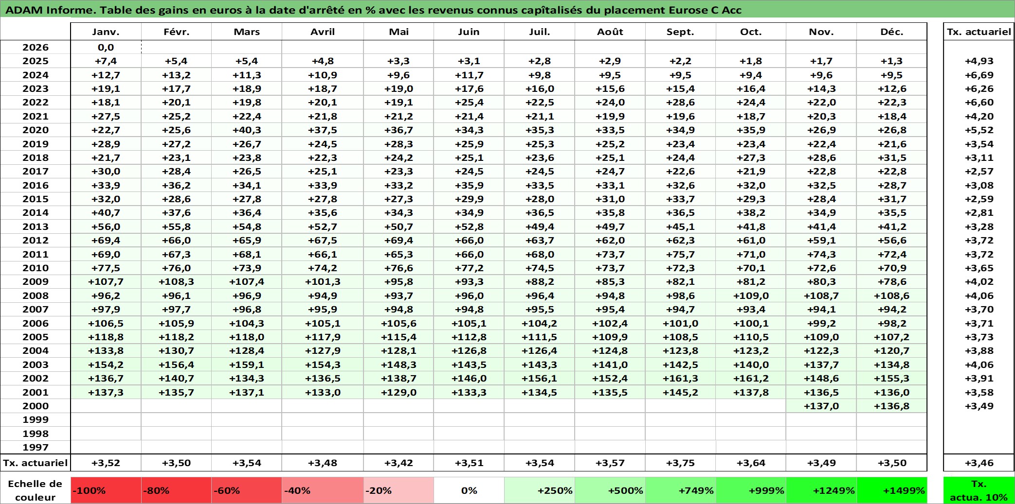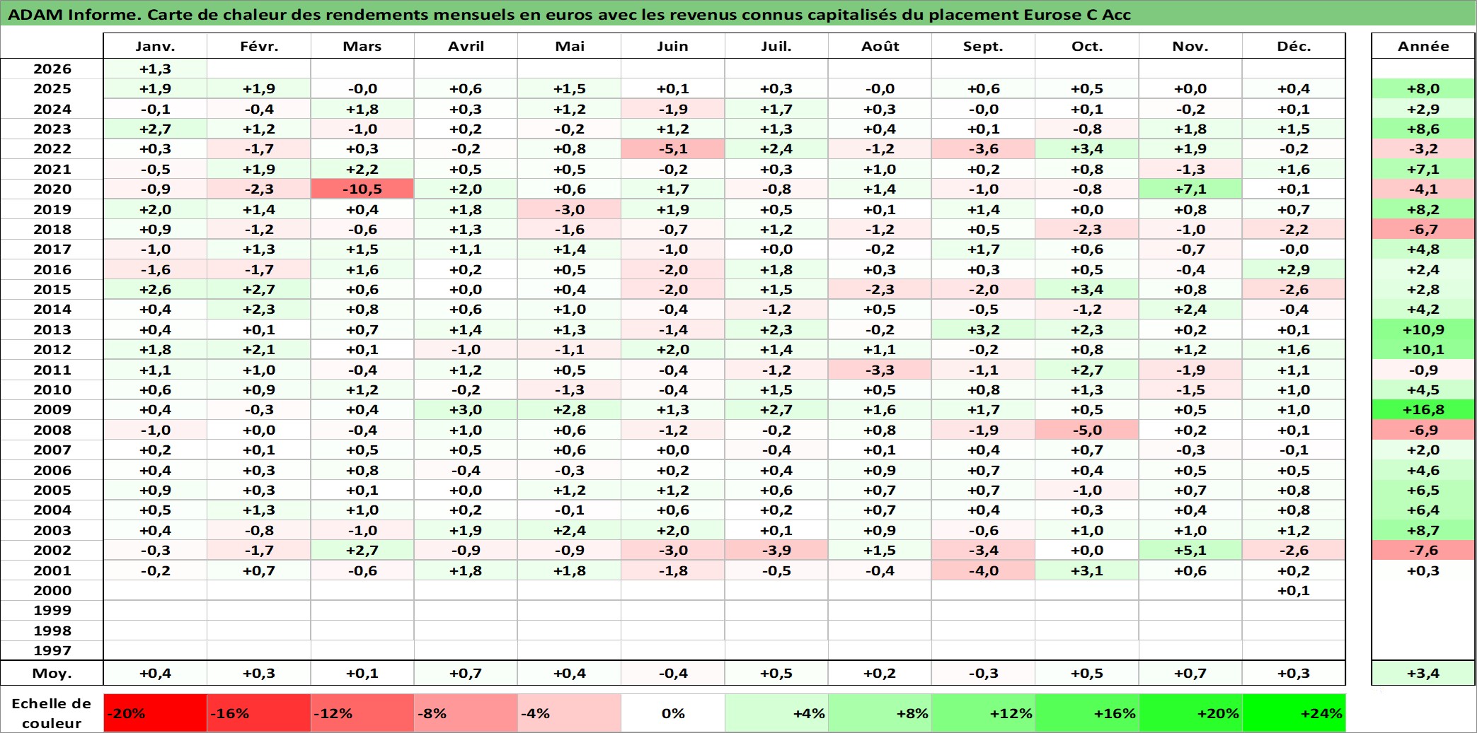Site dédié aux investisseursPage dédiée sur site financeAnalyse des valorisations hebdomadaires du fonds Eurose C Acc. Cet actif est cote en EUR. Les valorisations couvrent les semaines 2000W48 a 2026W05. Les revenus de cet actif financier sont pris en compte depuis la semaine 2000W48. La note globale ESG de cet actif est estimee a 9.0 (apres rebasage entre 0 et 20).
