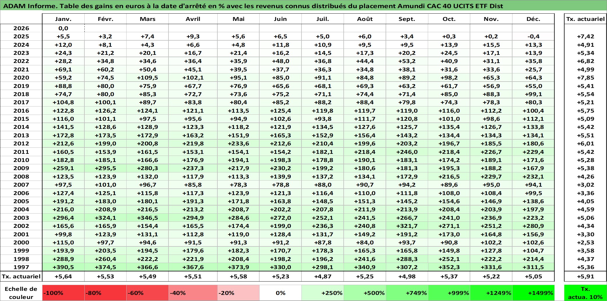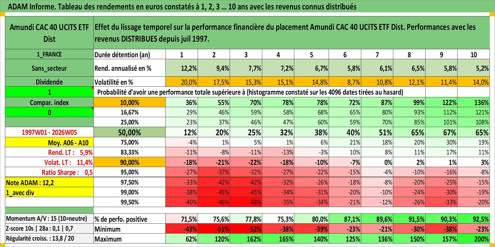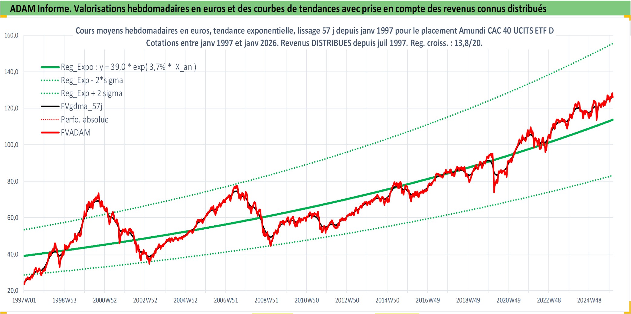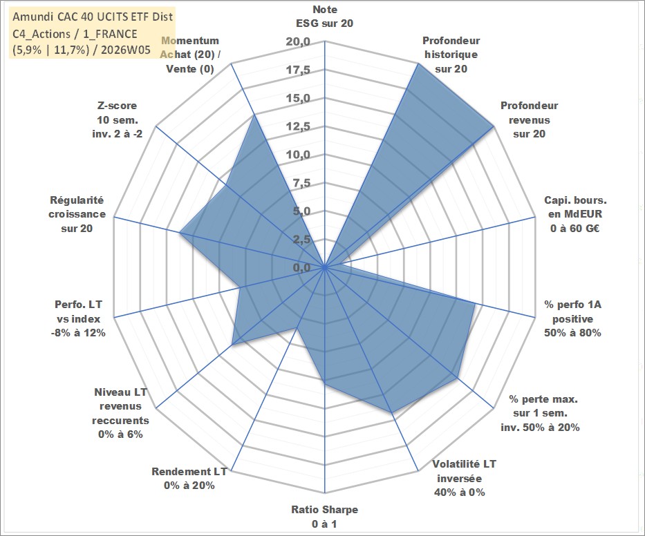 Site dédié aux investisseursPage dédiée sur site financeAnalyse des valorisations hebdomadaires du fonds Amundi CAC 40 UCITS ETF Dist. Cet actif est cote en EUR. Les valorisations couvrent les semaines 1997W01 a 2026W05. Les revenus de cet actif financier sont pris en compte depuis la semaine 1997W28. La note ESG de cet actif n'est pas connue.