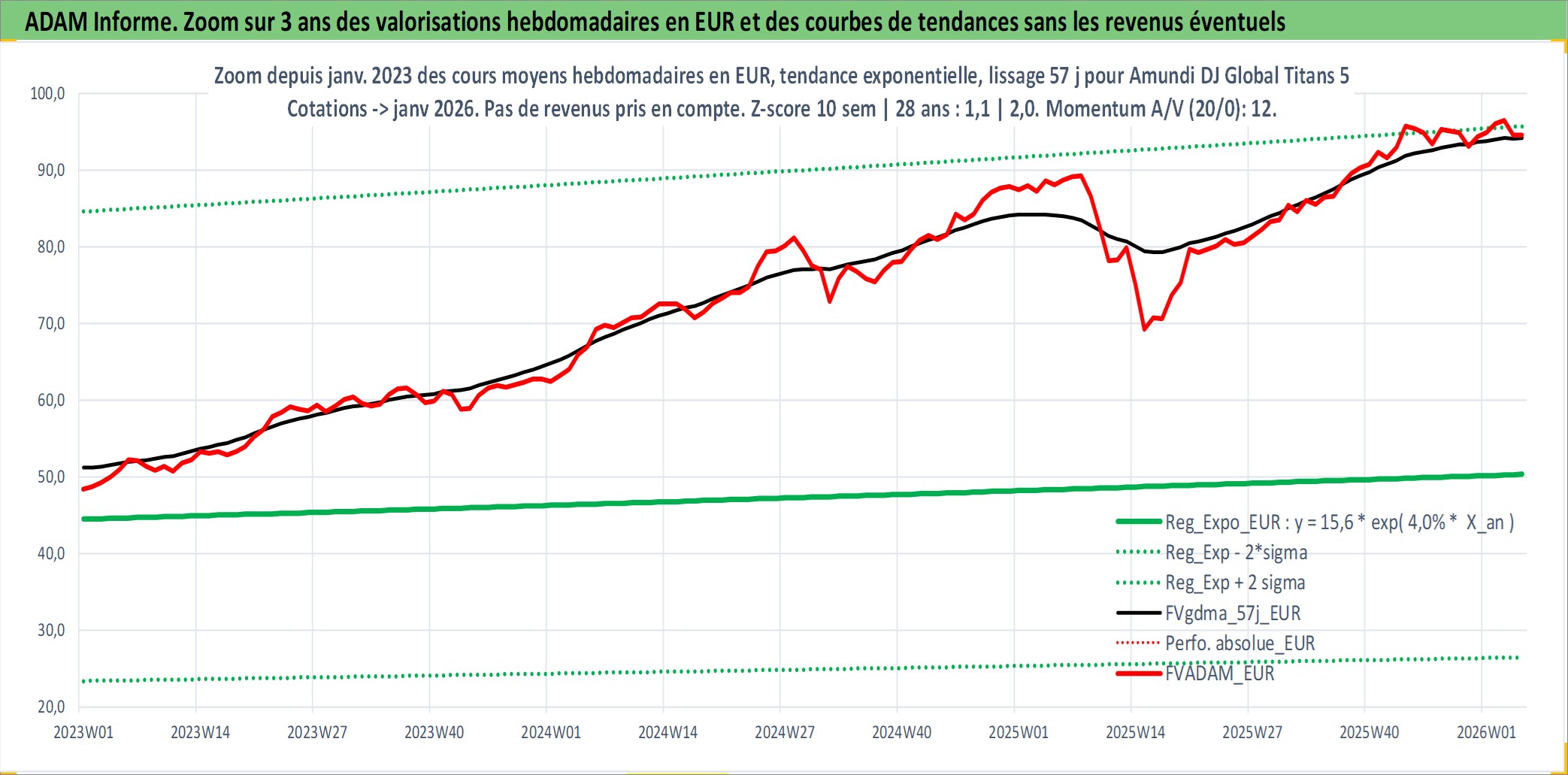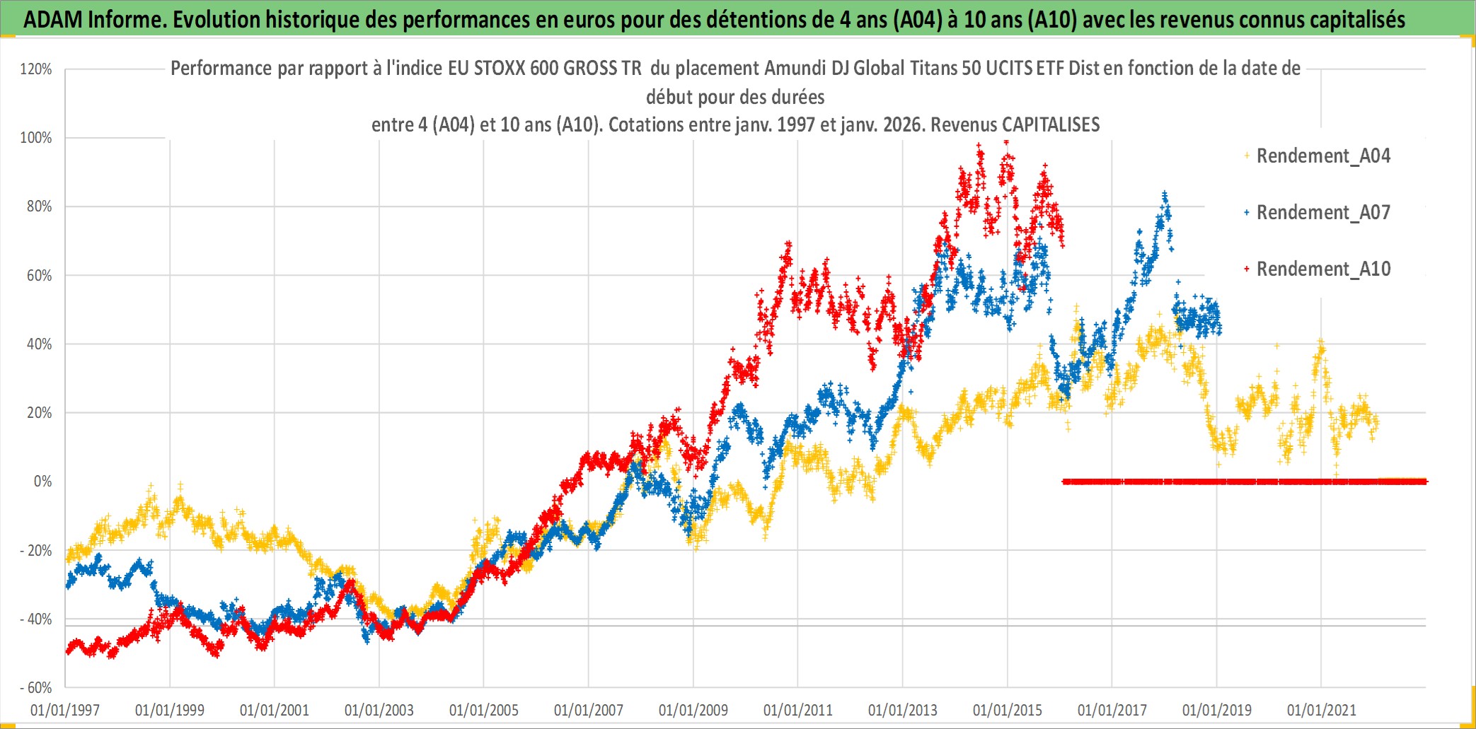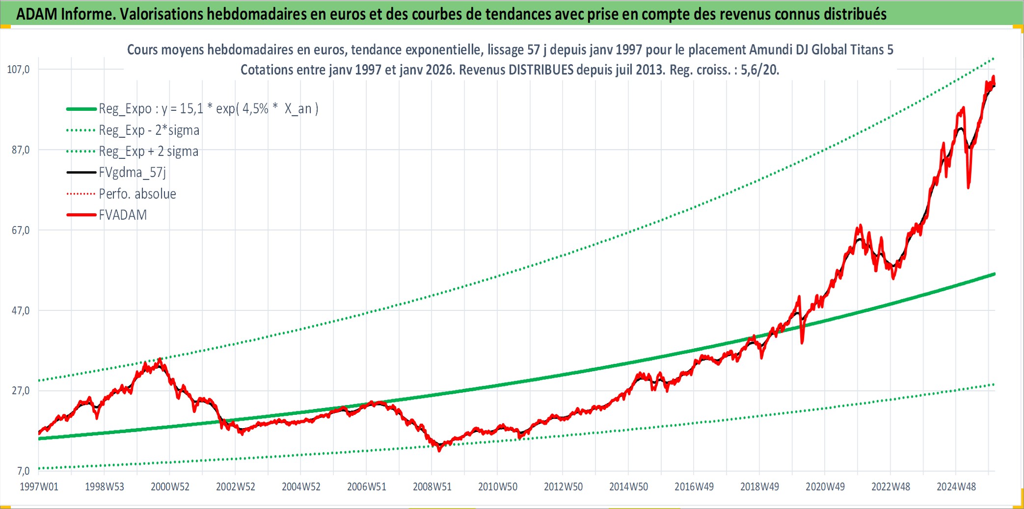 Site dédié aux investisseursPage dédiée sur site financeAnalyse des valorisations hebdomadaires du fonds Amundi DJ Global Titans 50 UCITS ETF Dist. Cet actif est cote en EUR. Les valorisations couvrent les semaines 1997W01 a 2026W05. Les revenus de cet actif financier sont pris en compte depuis la semaine 2013W28. La note ESG de cet actif n'est pas connue.