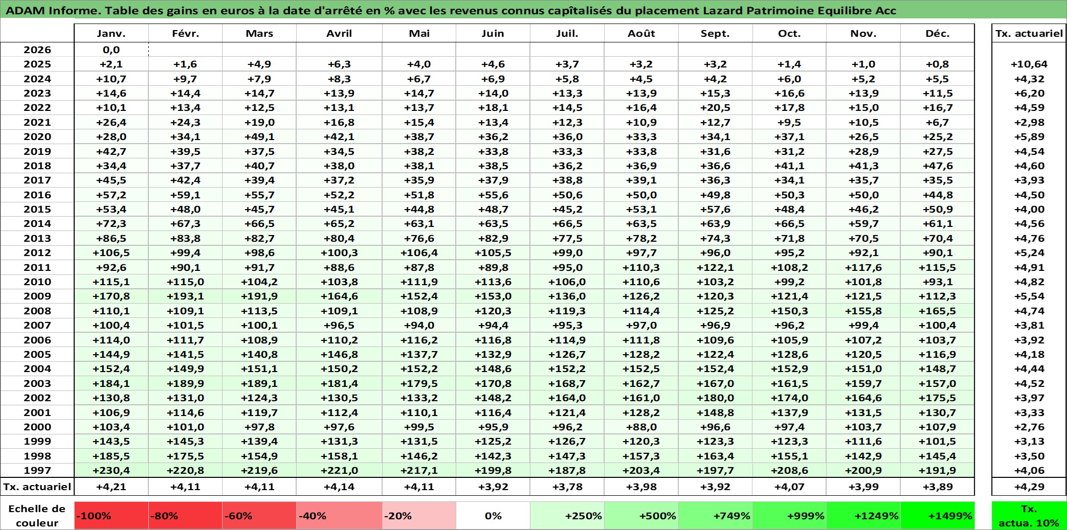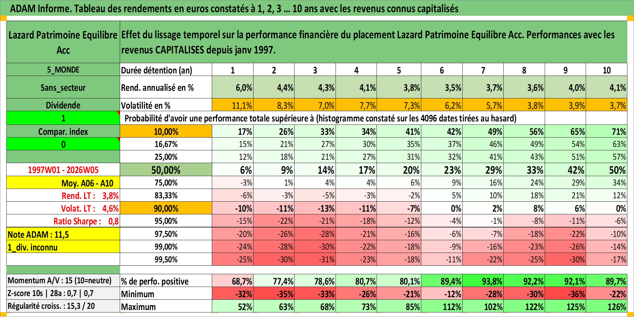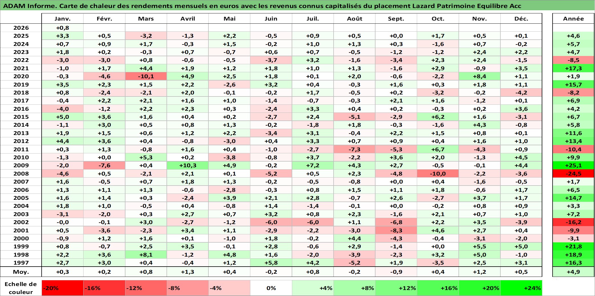 Site dédié aux investisseursPage dédiée sur site financeAnalyse des valorisations hebdomadaires du fonds Lazard Patrimoine Equilibre Acc. Cet actif est cote en EUR. Les valorisations couvrent les semaines 1997W01 a 2026W05. Les revenus de cet actif financier sont pris en compte depuis la semaine 1997W01. La note globale ESG de cet actif est estimee a 9.0 (apres rebasage entre 0 et 20).