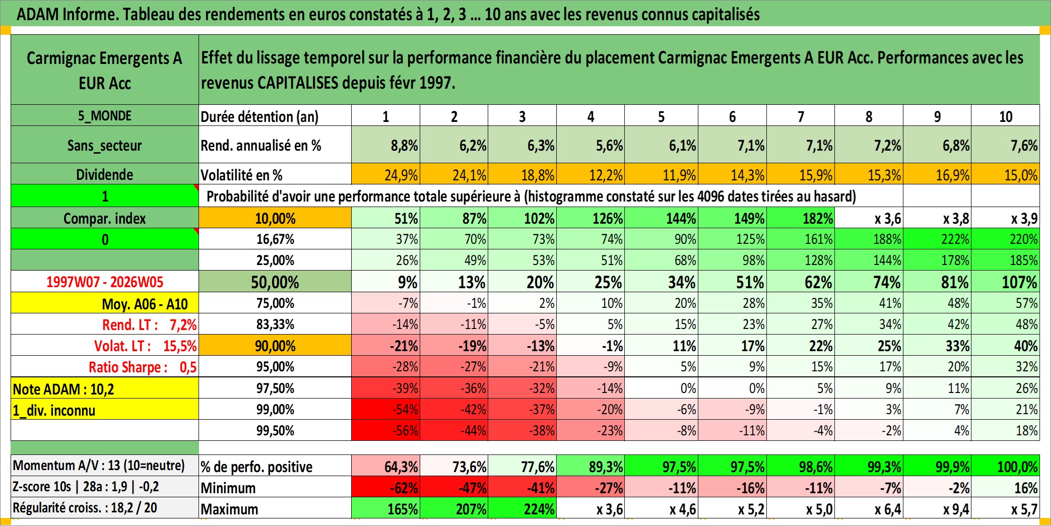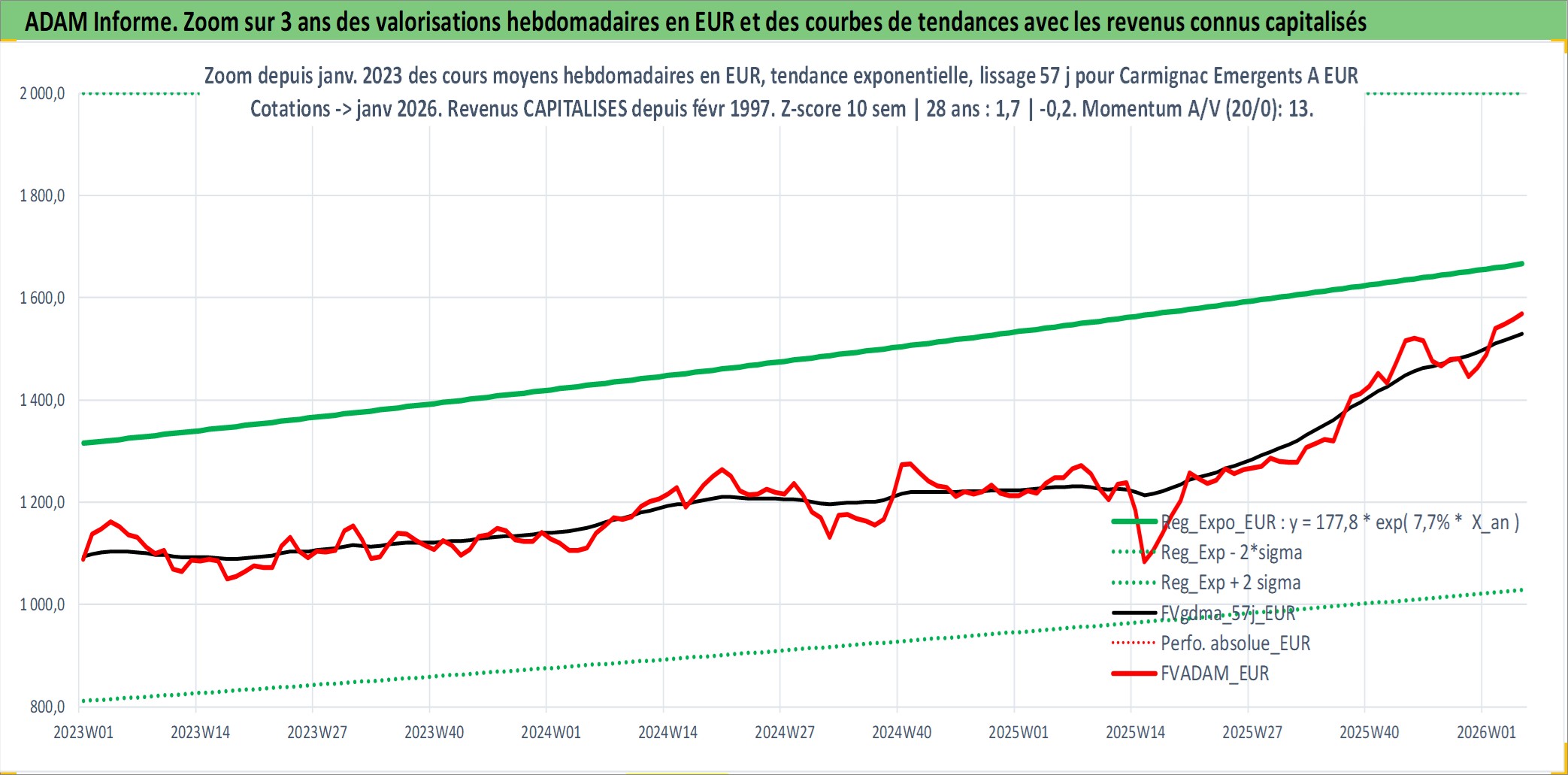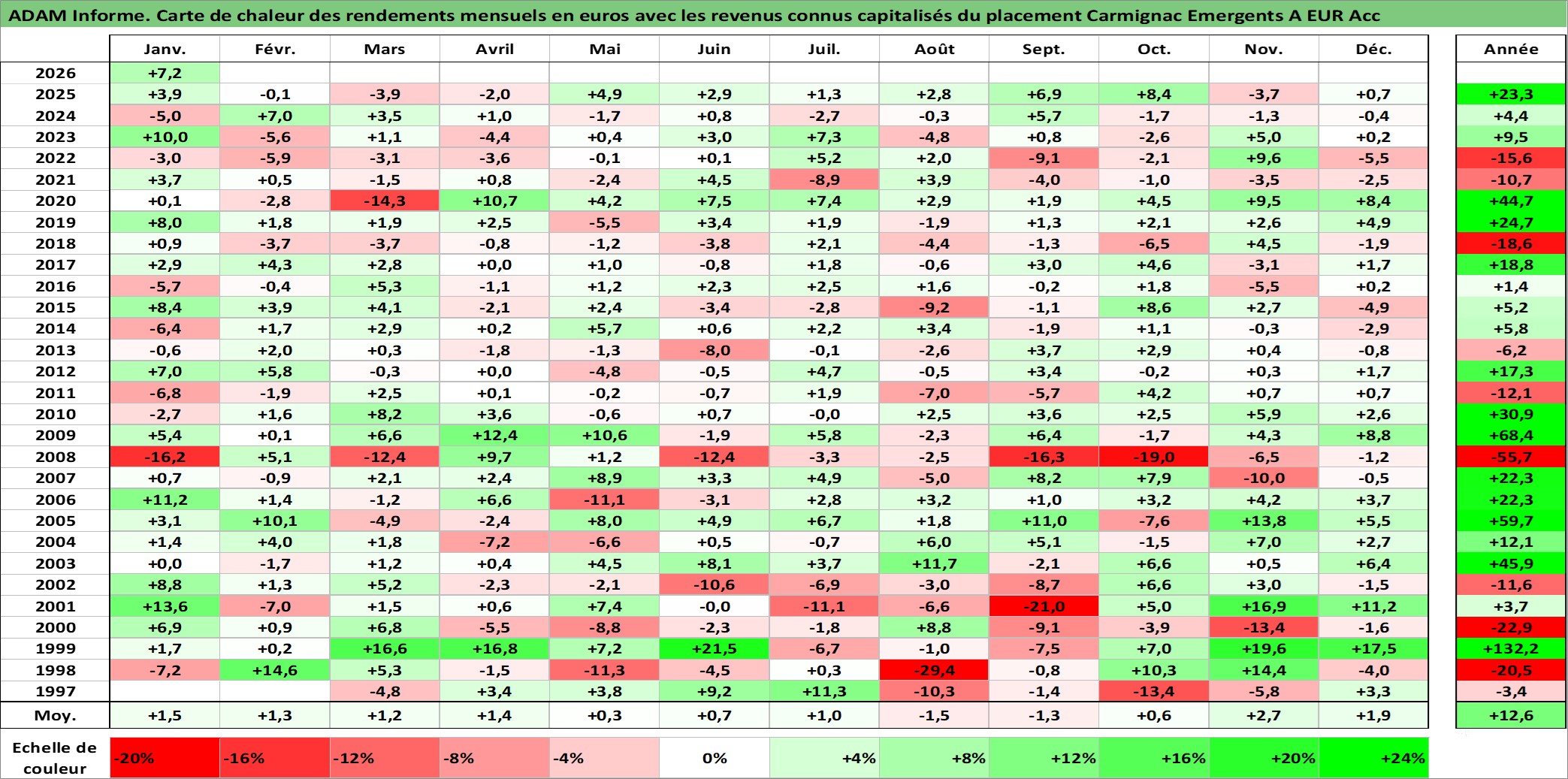 Site dédié aux investisseursPage dédiée sur site financeAnalyse des valorisations hebdomadaires du fonds Carmignac Emergents A EUR Acc. Cet actif est cote en EUR. Les valorisations couvrent les semaines 1997W07 a 2026W05. Les revenus de cet actif financier sont pris en compte depuis la semaine 1997W07. La note globale ESG de cet actif est estimee a 7.0 (apres rebasage entre 0 et 20).