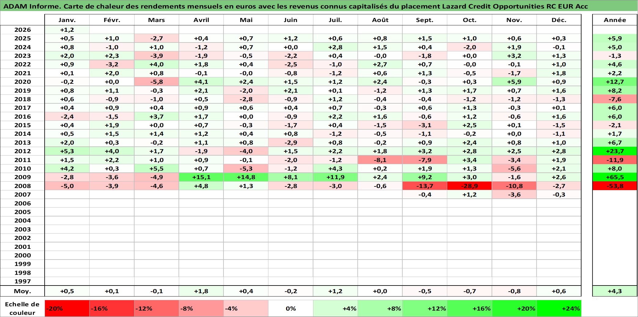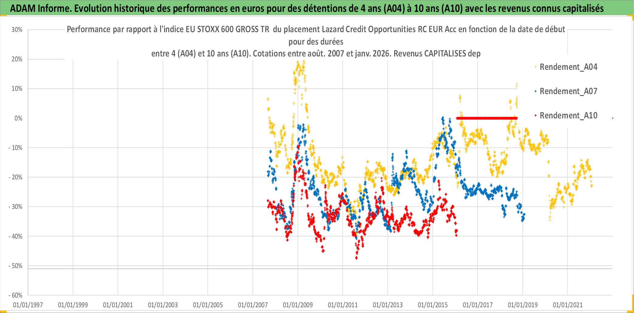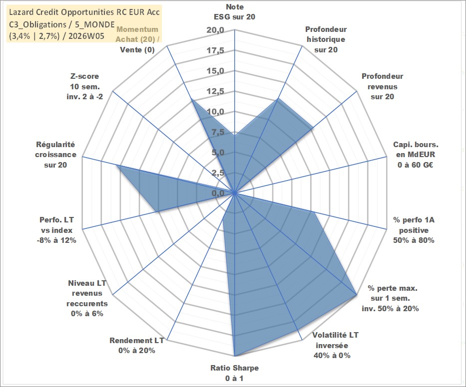 Site dédié aux investisseursPage dédiée sur site financeAnalyse des valorisations hebdomadaires du fonds Lazard Credit Opportunities RC EUR Acc. Cet actif est cote en EUR. Les valorisations couvrent les semaines 2007W34 a 2026W05. Les revenus de cet actif financier sont pris en compte depuis la semaine 2007W34. La note globale ESG de cet actif est estimee a 7.0 (apres rebasage entre 0 et 20).