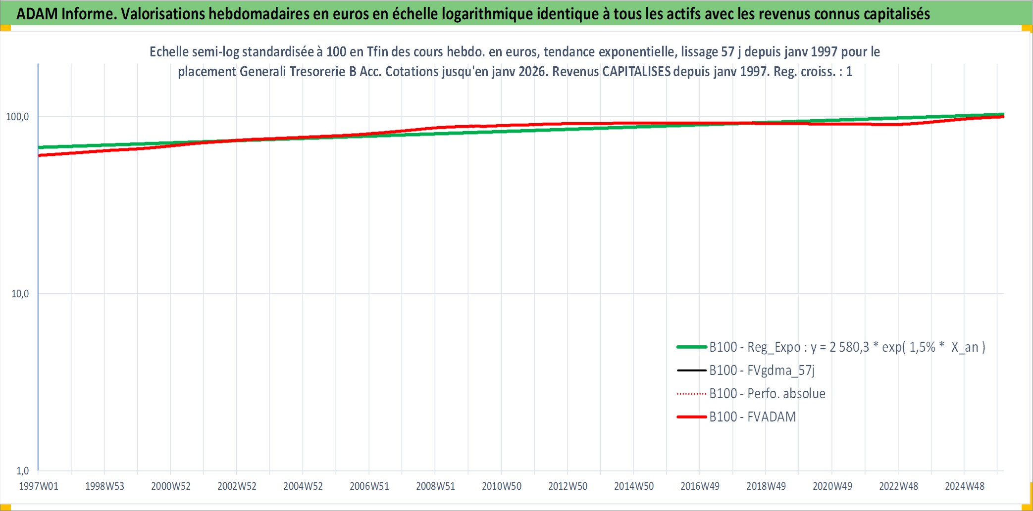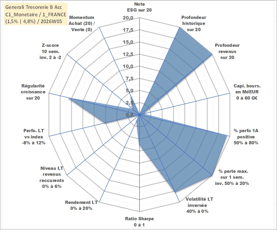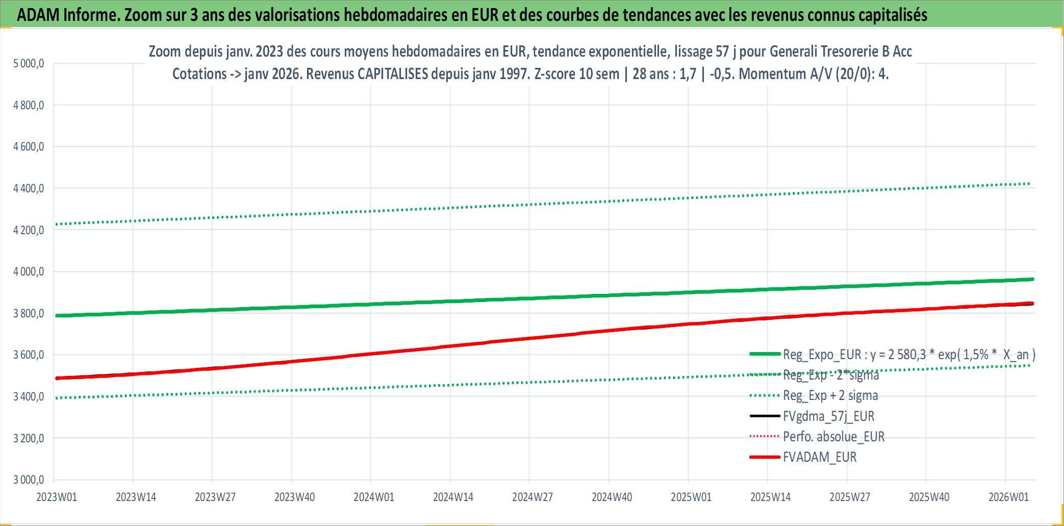 Site dédié aux investisseursPage dédiée sur site financeAnalyse des valorisations hebdomadaires du fonds Generali Tresorerie B Acc. Cet actif est cote en EUR. Les valorisations couvrent les semaines 1997W01 a 2026W05. Les revenus de cet actif financier sont pris en compte depuis la semaine 1997W01. La note ESG de cet actif n'est pas connue.