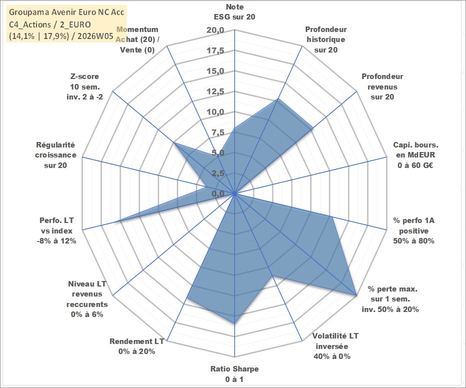 Site dédié aux investisseursPage dédiée sur site financeAnalyse des valorisations hebdomadaires du fonds Groupama Avenir Euro NC Acc. Cet actif est cote en EUR. Les valorisations couvrent les semaines 2007W36 a 2026W05. Les revenus de cet actif financier sont pris en compte depuis la semaine 2007W36. La note globale ESG de cet actif est estimee a 8.0 (apres rebasage entre 0 et 20).