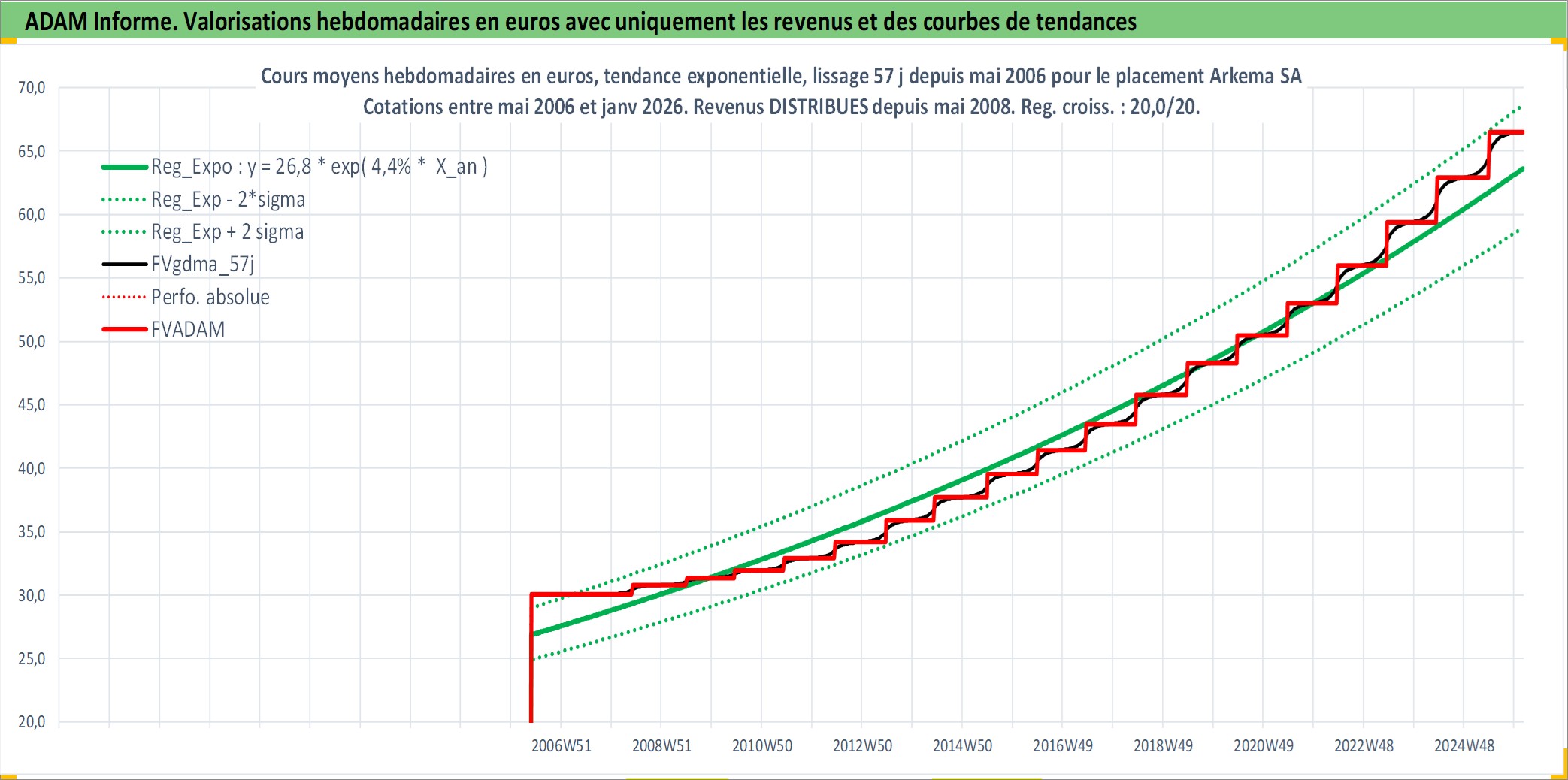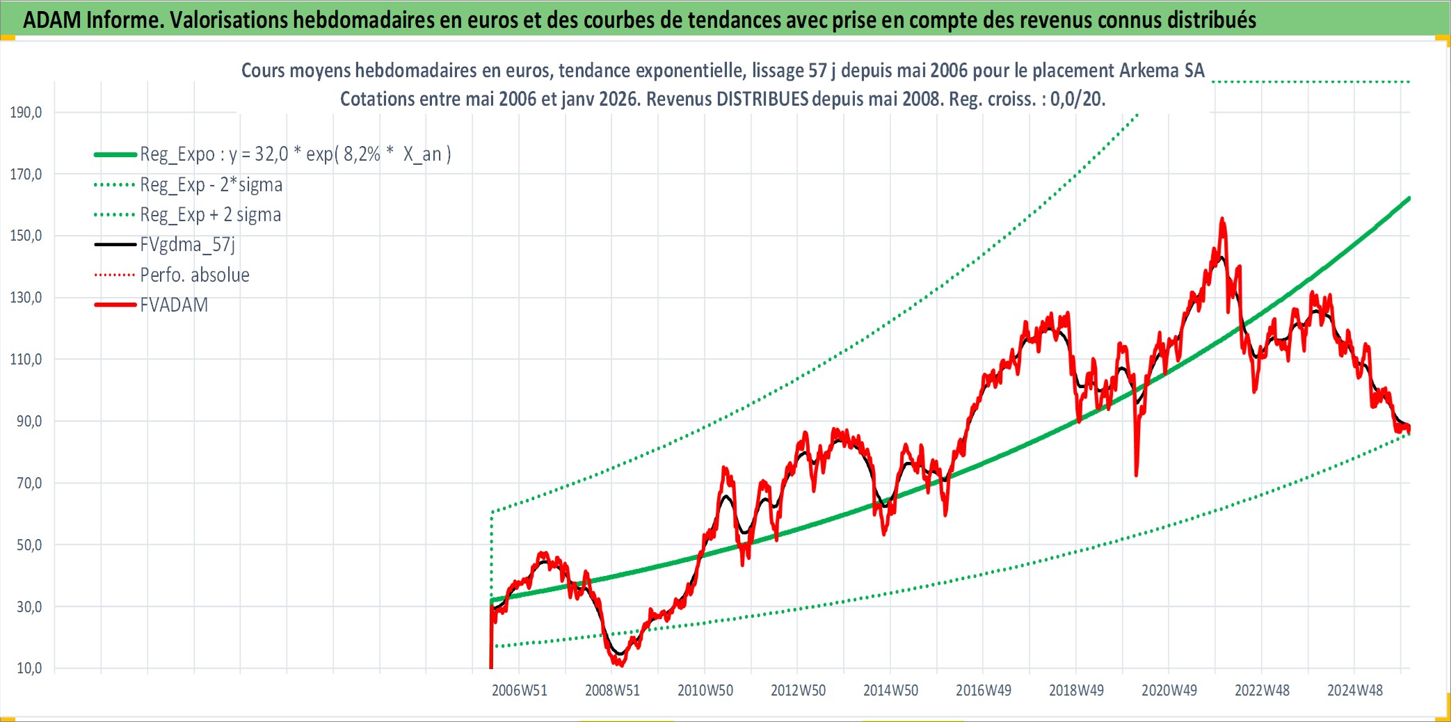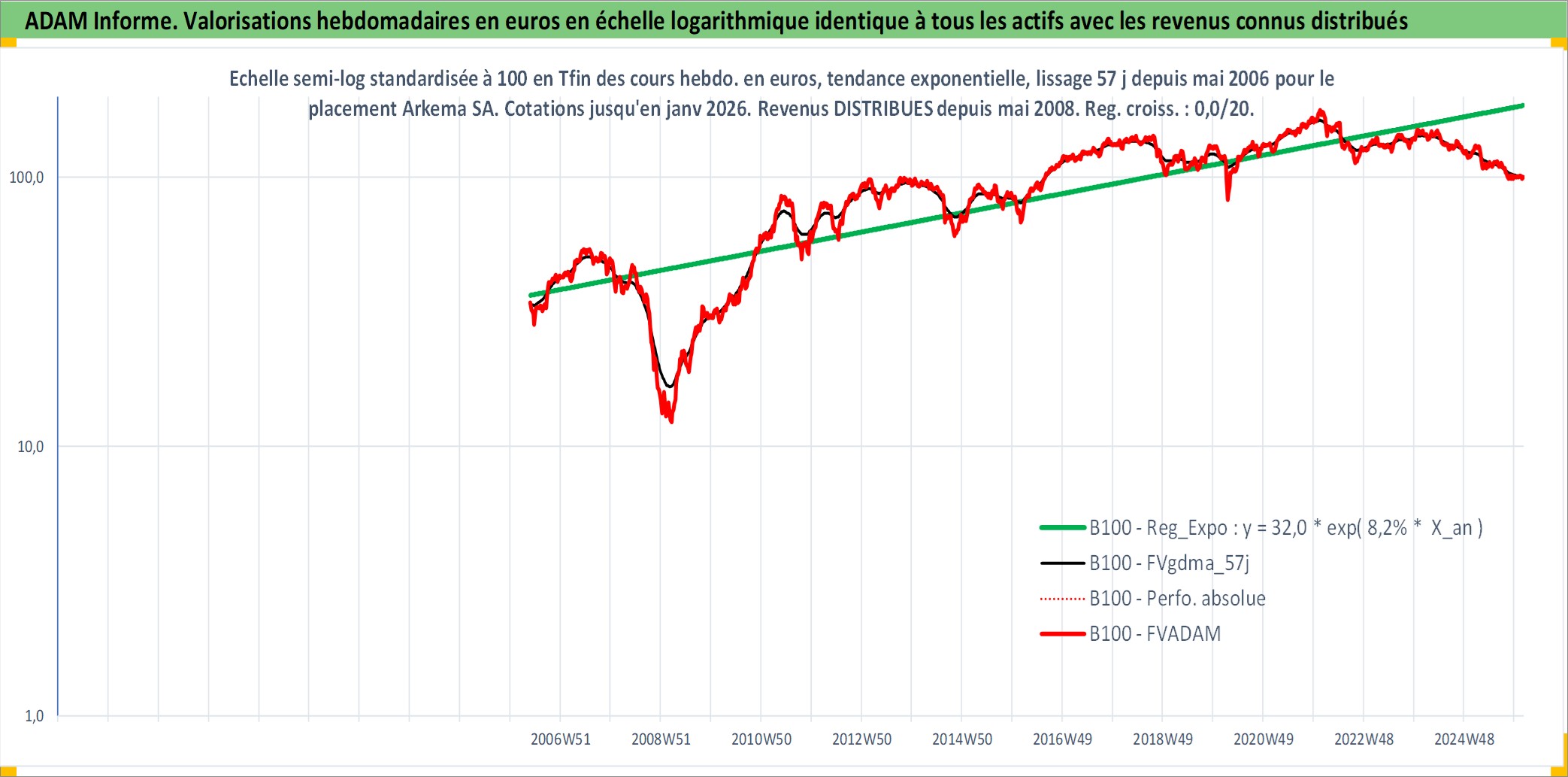 Site dédié aux investisseursPage dédiée sur site financeAnalyse des valorisations hebdomadaires de l'action Arkema SA. Cet actif est cote en EUR. Les valorisations couvrent les semaines 2006W20 a 2026W05. Les revenus de cet actif financier sont pris en compte depuis la semaine 2008W21. La note globale ESG de cet actif est estimee a 10.0 (apres rebasage entre 0 et 20).