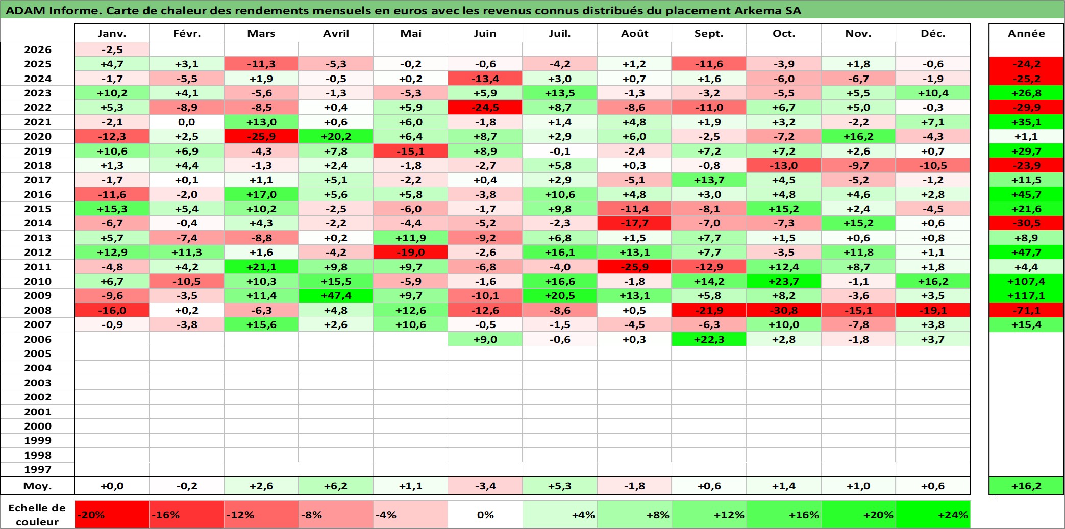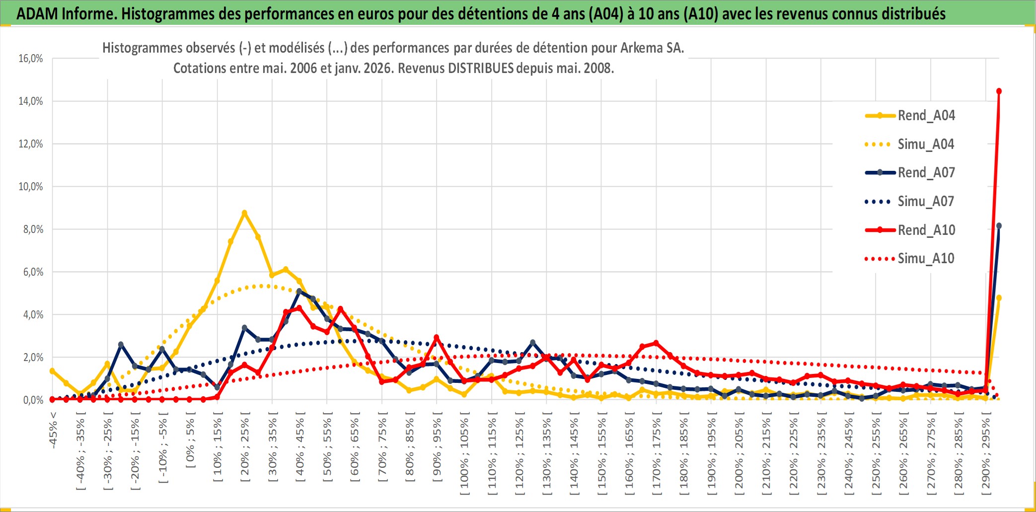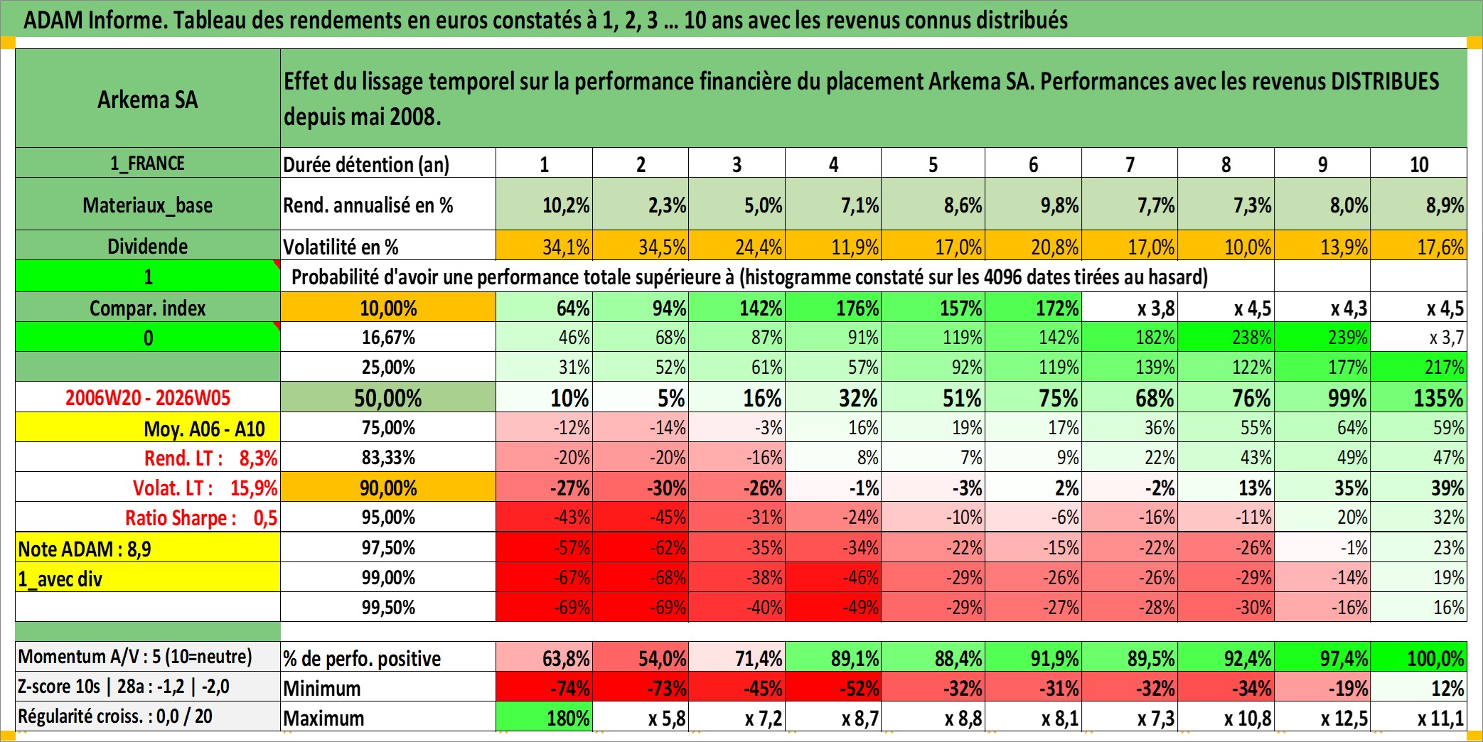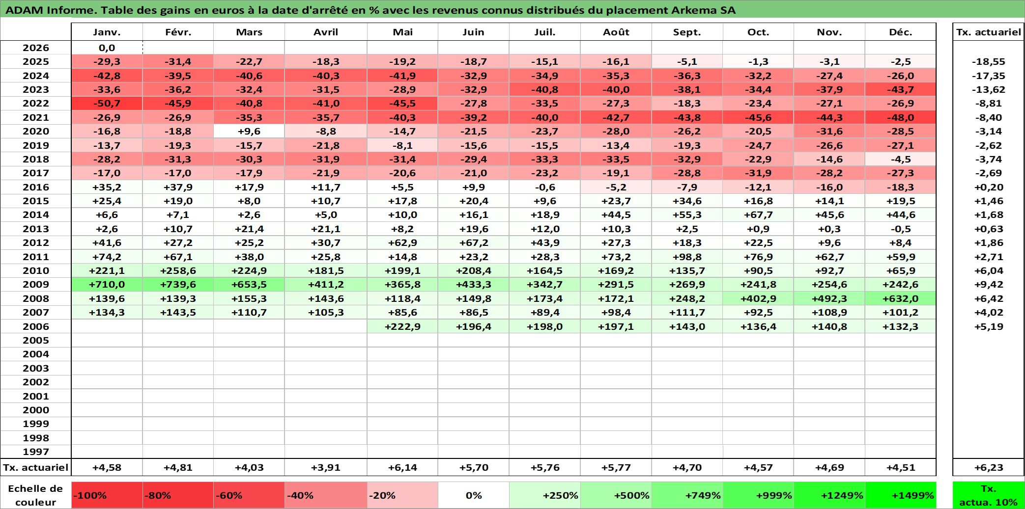 Site dédié aux investisseursPage dédiée sur site financeAnalyse des valorisations hebdomadaires de l'action Arkema SA. Cet actif est cote en EUR. Les valorisations couvrent les semaines 2006W20 a 2026W05. Les revenus de cet actif financier sont pris en compte depuis la semaine 2008W21. La note globale ESG de cet actif est estimee a 10.0 (apres rebasage entre 0 et 20).