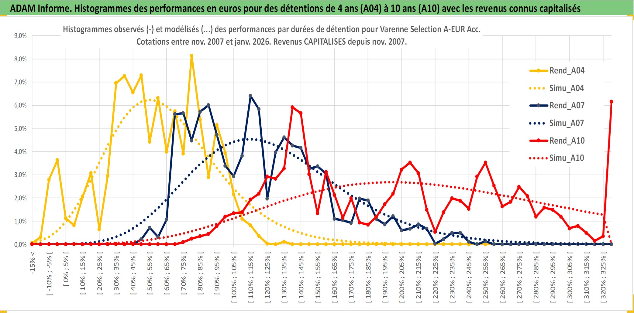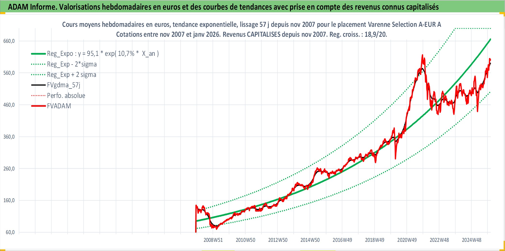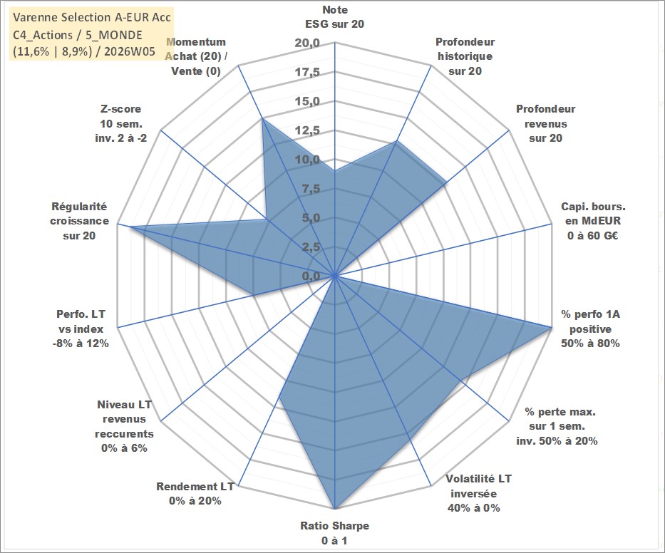 Site dédié aux investisseursPage dédiée sur site financeAnalyse des valorisations hebdomadaires du fonds Varenne Selection A-EUR Acc. Cet actif est cote en EUR. Les valorisations couvrent les semaines 2007W48 a 2026W05. Les revenus de cet actif financier sont pris en compte depuis la semaine 2007W48. La note globale ESG de cet actif est estimee a 9.0 (apres rebasage entre 0 et 20).
