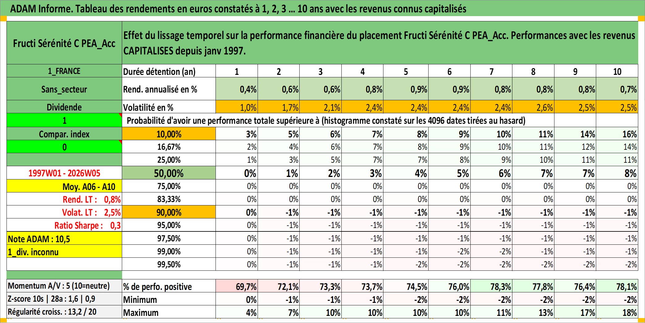 Site dédié aux investisseursPage dédiée sur site financeAnalyse des valorisations hebdomadaires du fonds Fructi Sérénité C PEA_Acc. Cet actif est cote en EUR. Les valorisations couvrent les semaines 1997W01 a 2026W05. Les revenus de cet actif financier sont pris en compte depuis la semaine 1997W01. La note ESG de cet actif n'est pas connue.