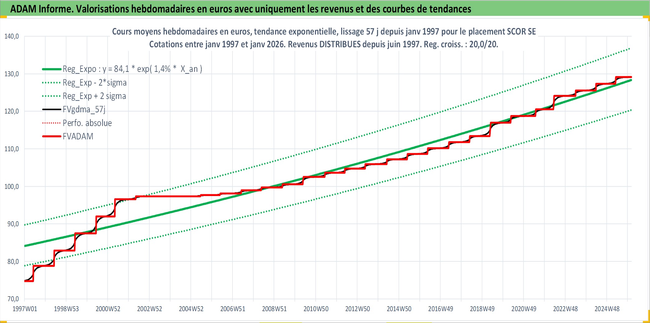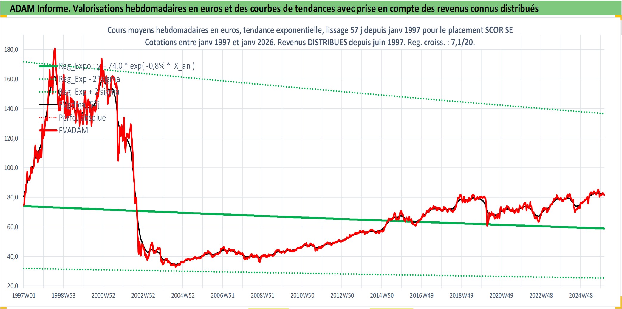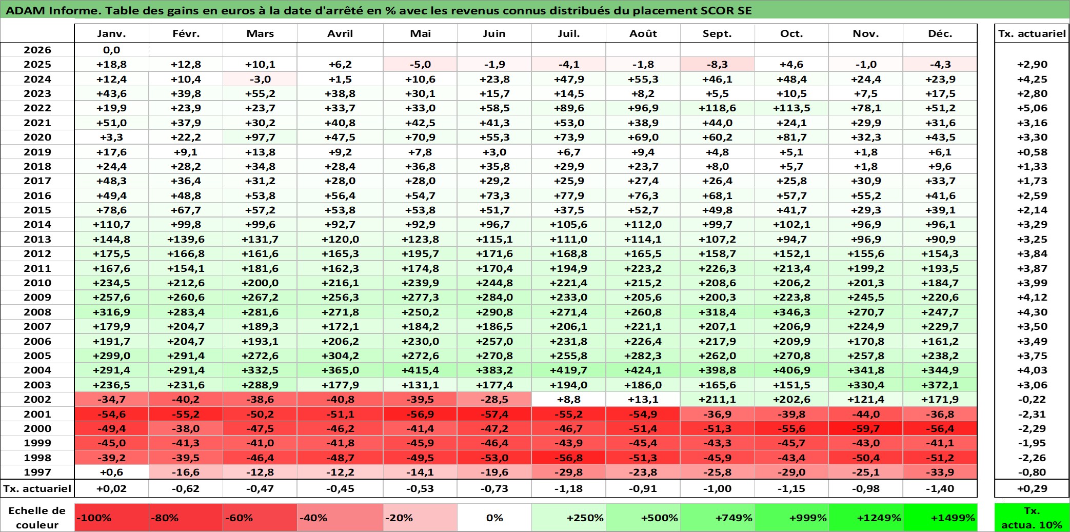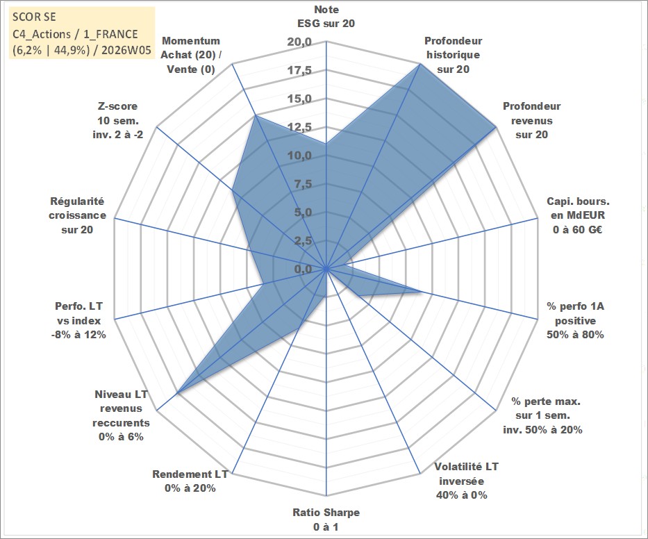 Site dédié aux investisseursPage dédiée sur site financeAnalyse des valorisations hebdomadaires de l'action SCOR SE. Cet actif est cote en EUR. Les valorisations couvrent les semaines 1997W01 a 2026W05. Les revenus de cet actif financier sont pris en compte depuis la semaine 1997W23. La note globale ESG de cet actif est estimee a 11.0 (apres rebasage entre 0 et 20).