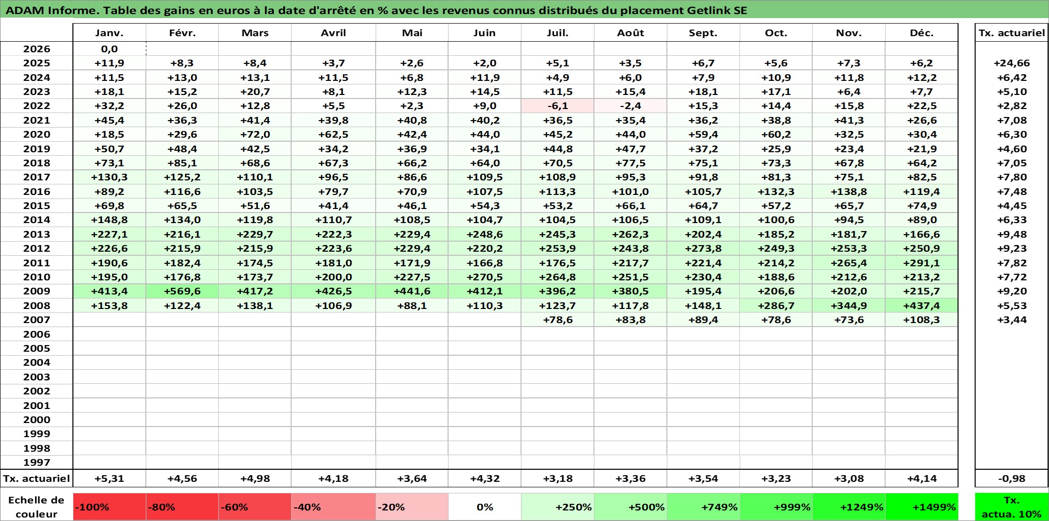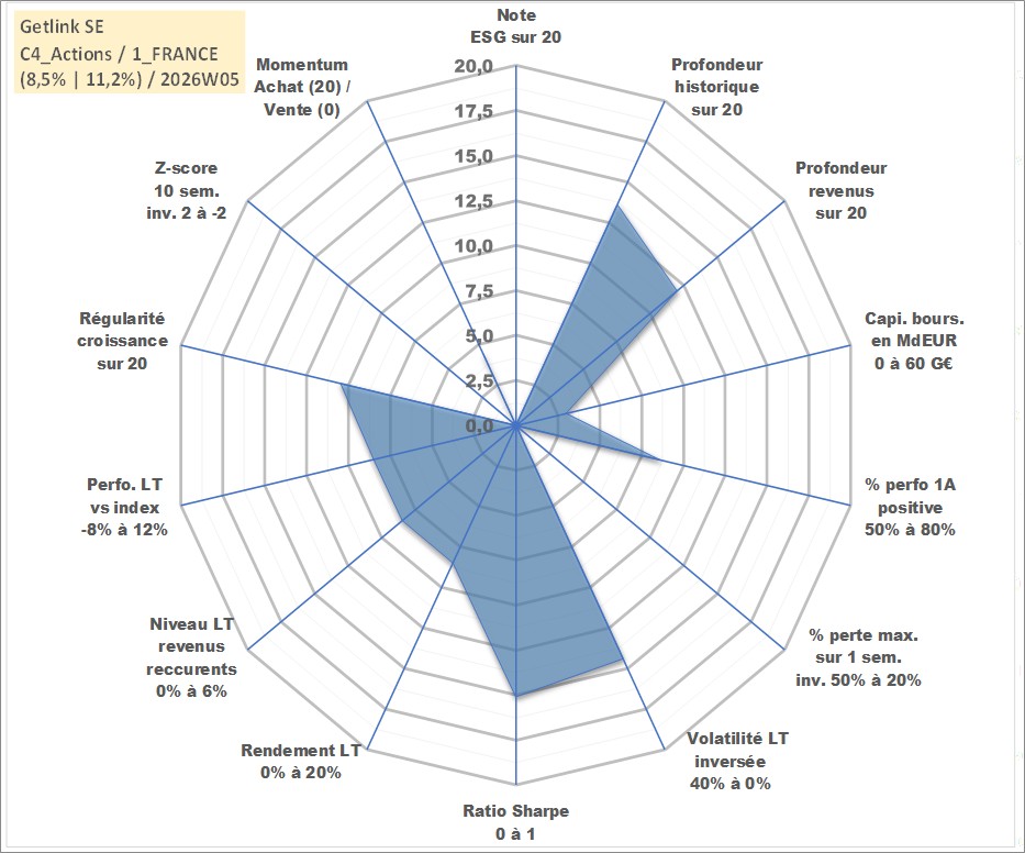 Site dédié aux investisseursPage dédiée sur site financeAnalyse des valorisations hebdomadaires de l'action Getlink SE. Cet actif est cote en EUR. Les valorisations couvrent les semaines 2007W27 a 2026W05. Les revenus de cet actif financier sont pris en compte depuis la semaine 2009W28. La note ESG de cet actif n'est pas connue.