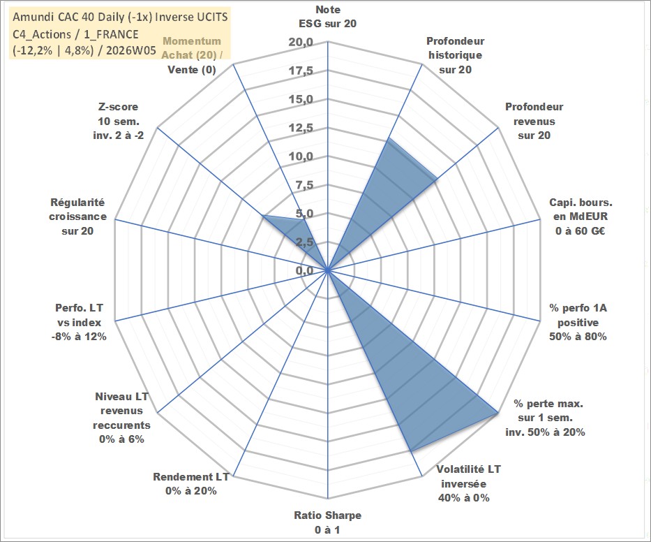 Site dédié aux investisseursPage dédiée sur site financeAnalyse des valorisations hebdomadaires du fonds Amundi CAC 40 Daily (-1x) Inverse UCITS ETF Acc. Cet actif est cote en EUR. Les valorisations couvrent les semaines 2008W24 a 2026W05. Les revenus de cet actif financier sont pris en compte depuis la semaine 2008W24. La note ESG de cet actif n'est pas connue.
