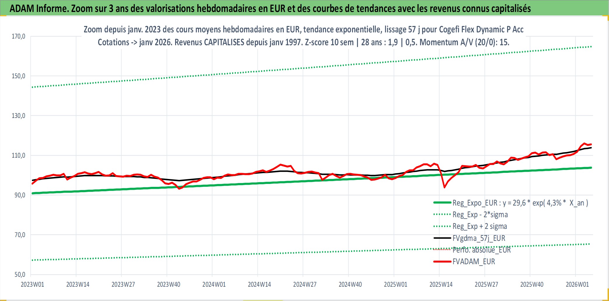 Site dédié aux investisseursPage dédiée sur site financeAnalyse des valorisations hebdomadaires du fonds Cogefi Flex Dynamic P Acc. Cet actif est cote en EUR. Les valorisations couvrent les semaines 1997W01 a 2026W05. Les revenus de cet actif financier sont pris en compte depuis la semaine 1997W01. La note globale ESG de cet actif est estimee a 11.0 (apres rebasage entre 0 et 20).
