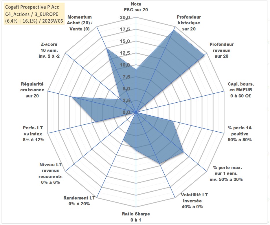 Site dédié aux investisseursPage dédiée sur site financeAnalyse des valorisations hebdomadaires du fonds Cogefi Prospective P Acc. Cet actif est cote en EUR. Les valorisations couvrent les semaines 1998W42 a 2026W05. Les revenus de cet actif financier sont pris en compte depuis la semaine 1998W42. La note globale ESG de cet actif est estimee a 9.0 (apres rebasage entre 0 et 20).