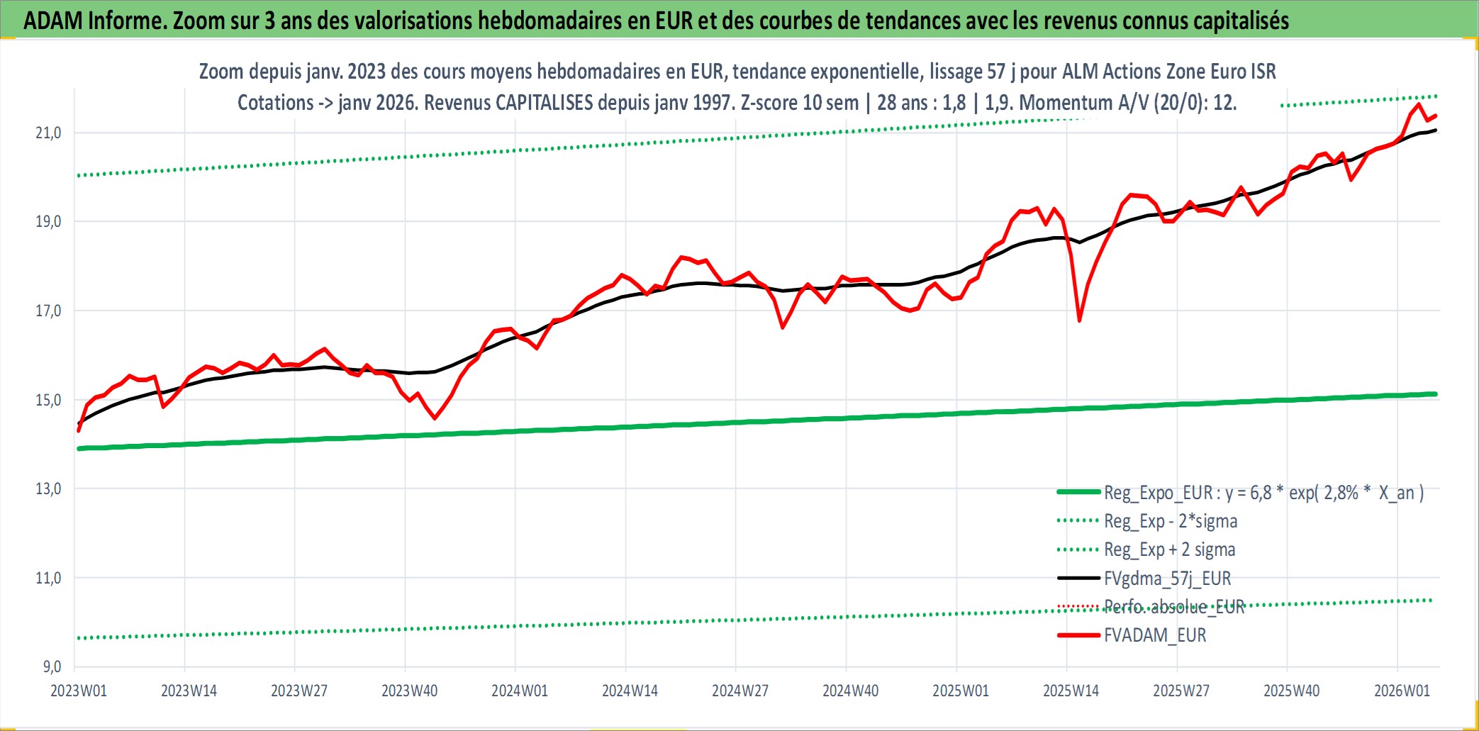 Site dédié aux investisseursPage dédiée sur site financeAnalyse des valorisations hebdomadaires du fonds ALM Actions Zone Euro ISR RA PER_SG Acc. Cet actif est cote en EUR. Les valorisations couvrent les semaines 1997W01 a 2026W05. Les revenus de cet actif financier sont pris en compte depuis la semaine 1997W01. La note globale ESG de cet actif est estimee a 10.0 (apres rebasage entre 0 et 20).