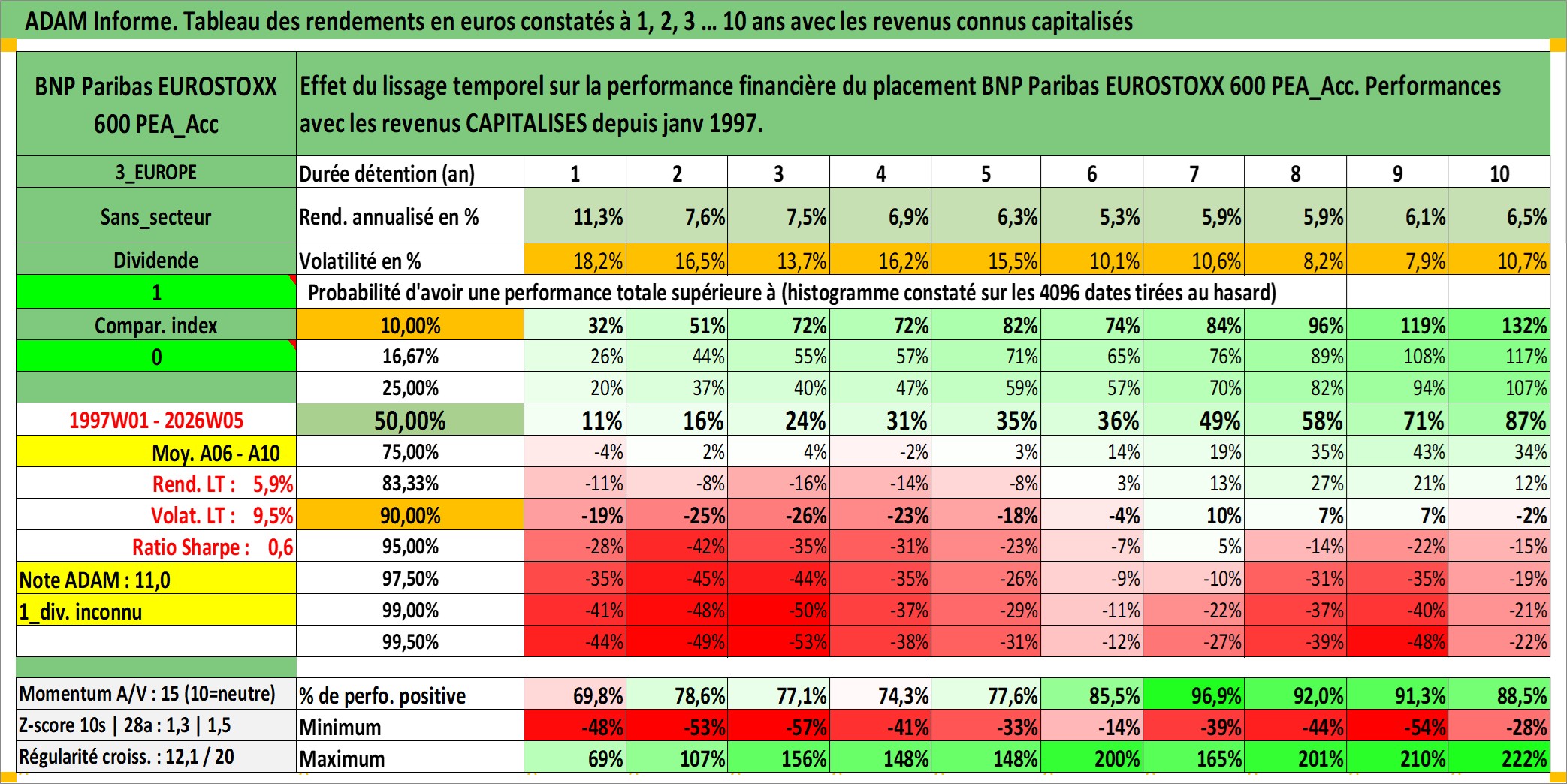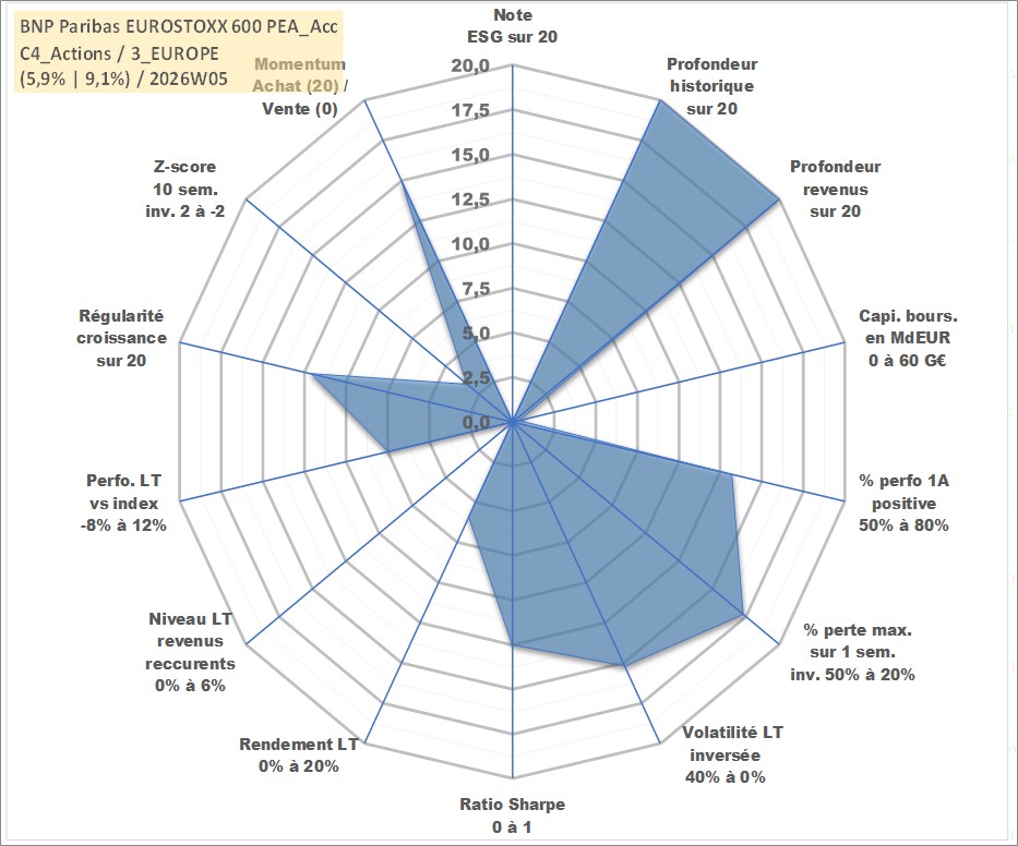 Site dédié aux investisseursPage dédiée sur site financeAnalyse des valorisations hebdomadaires du fonds BNP Paribas EUROSTOXX 600 PEA_Acc. Cet actif est cote en EUR. Les valorisations couvrent les semaines 1997W01 a 2026W05. Les revenus de cet actif financier sont pris en compte depuis la semaine 1997W01. La note ESG de cet actif n'est pas connue.