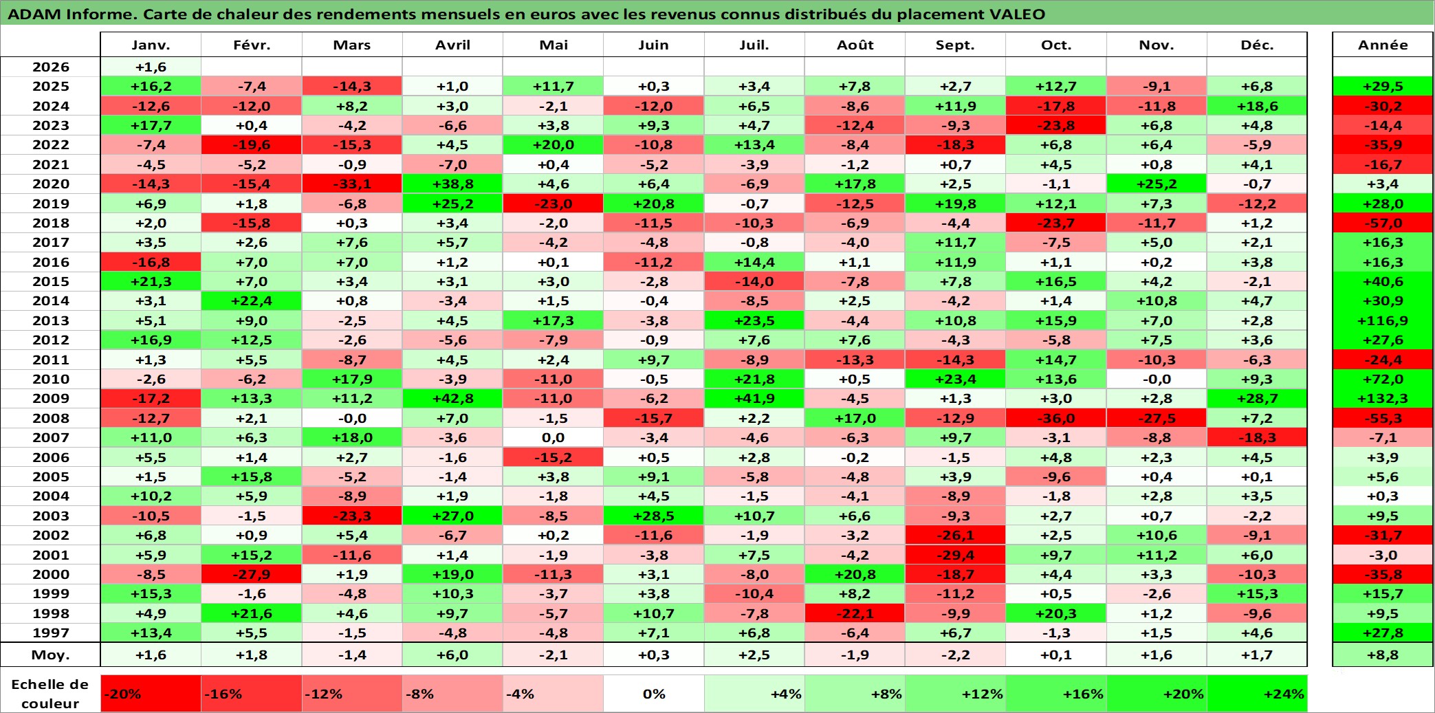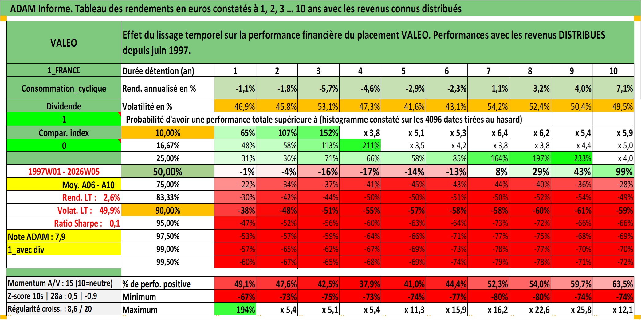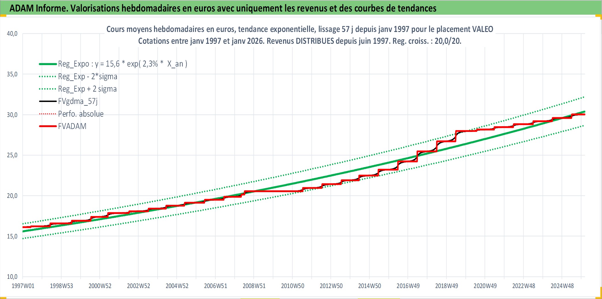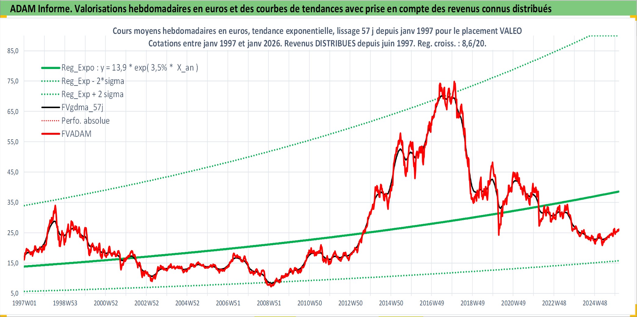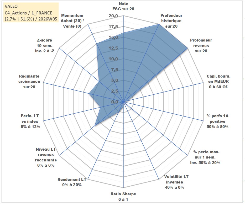 Site dédié aux investisseursPage dédiée sur site financeAnalyse des valorisations hebdomadaires de l'action VALEO. Cet actif est cote en EUR. Les valorisations couvrent les semaines 1997W01 a 2026W05. Les revenus de cet actif financier sont pris en compte depuis la semaine 1997W23. La note globale ESG de cet actif est estimee a 16.0 (apres rebasage entre 0 et 20).