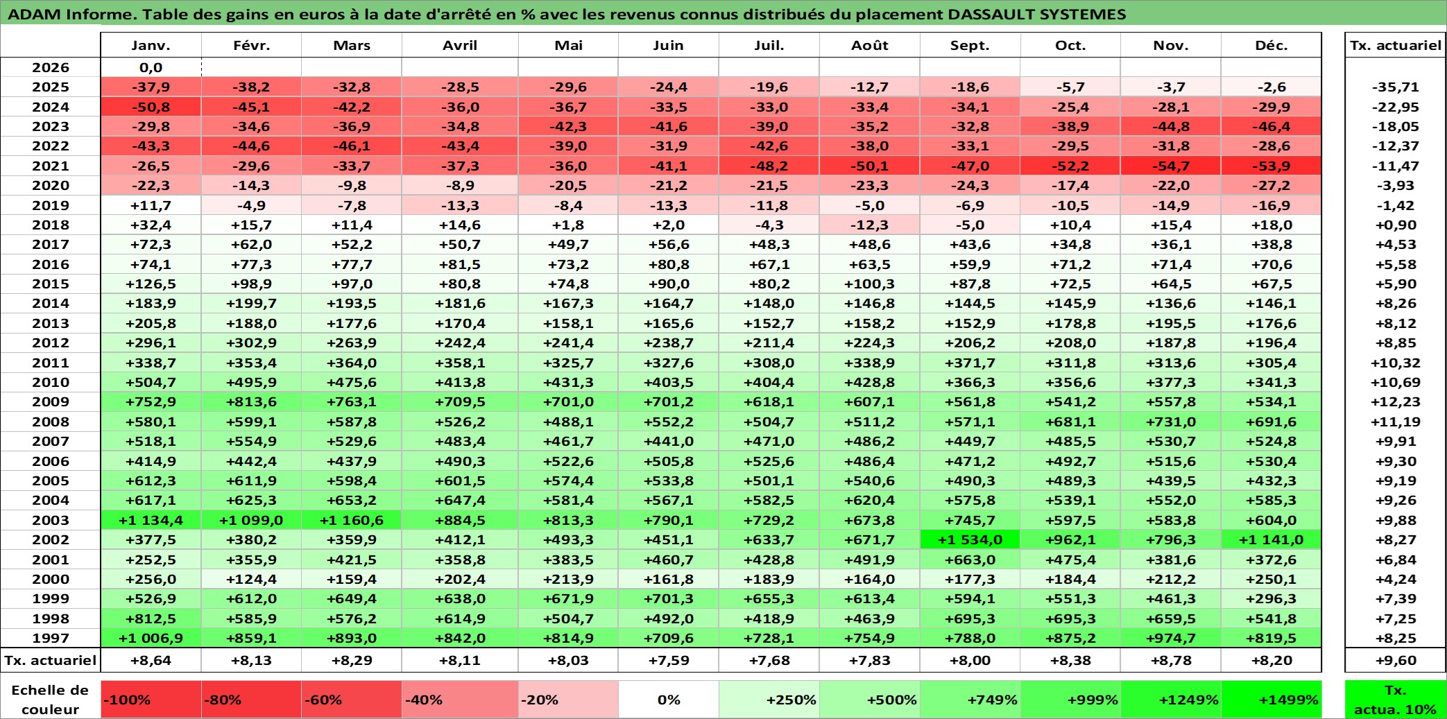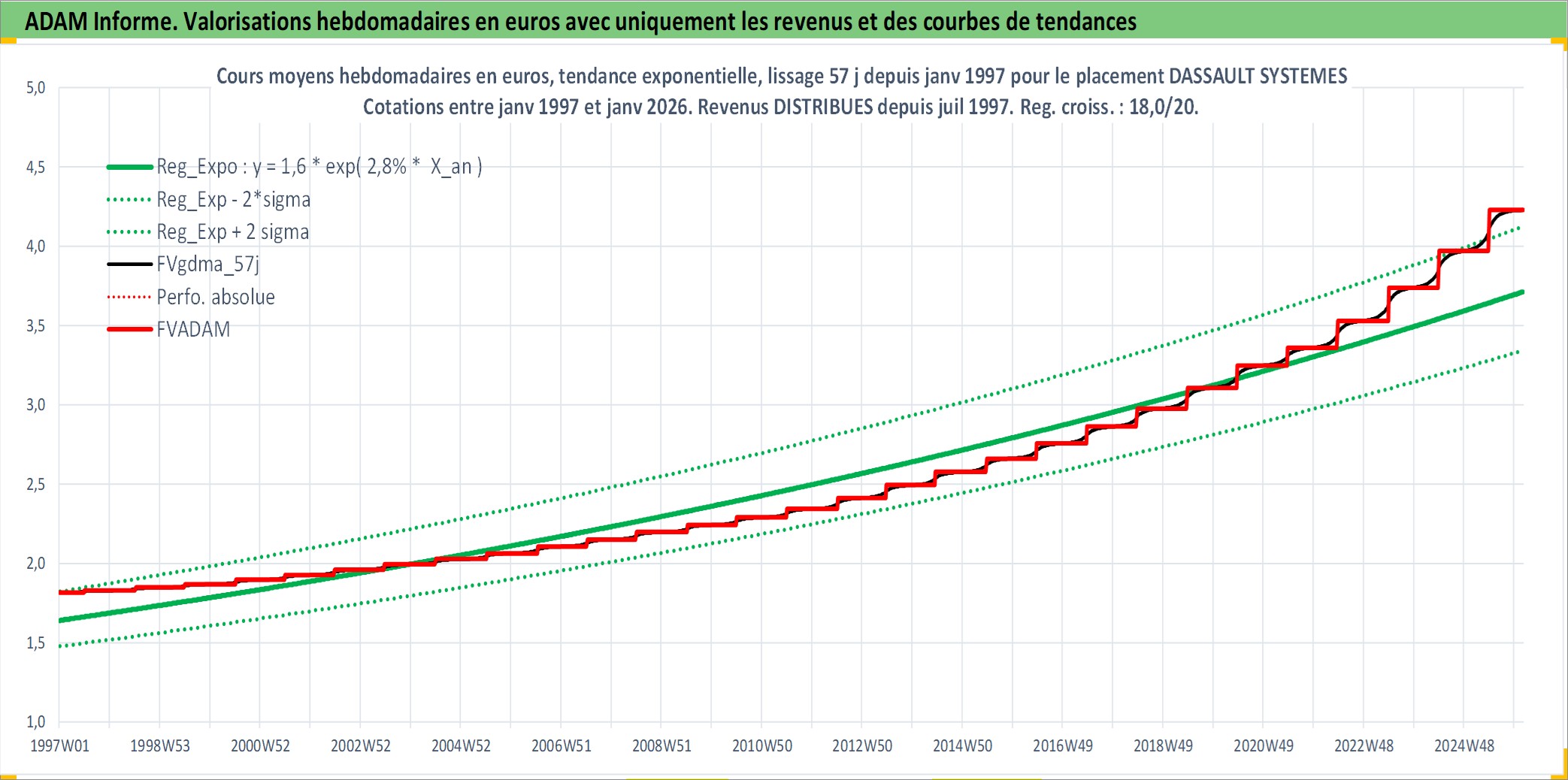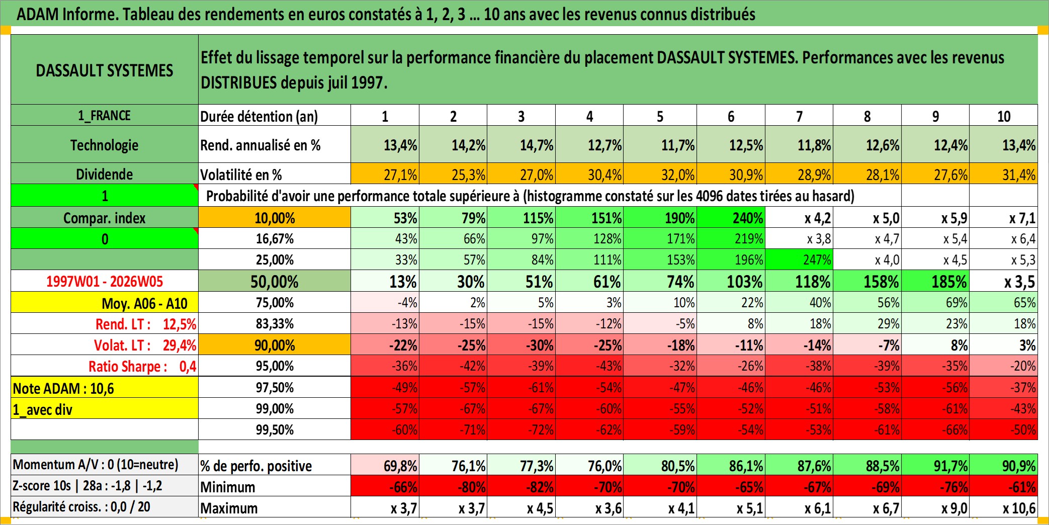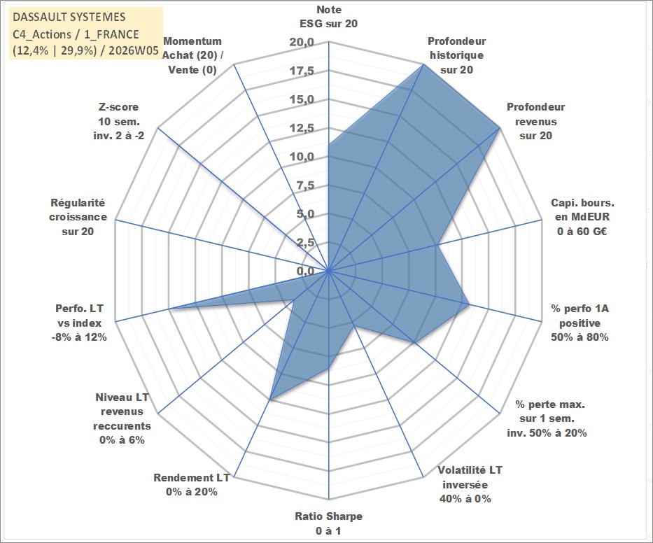 Site dédié aux investisseursPage dédiée sur site financeAnalyse des valorisations hebdomadaires de l'action DASSAULT SYSTEMES. Cet actif est cote en EUR. Les valorisations couvrent les semaines 1997W01 a 2026W05. Les revenus de cet actif financier sont pris en compte depuis la semaine 1997W27. La note globale ESG de cet actif est estimee a 11.0 (apres rebasage entre 0 et 20).