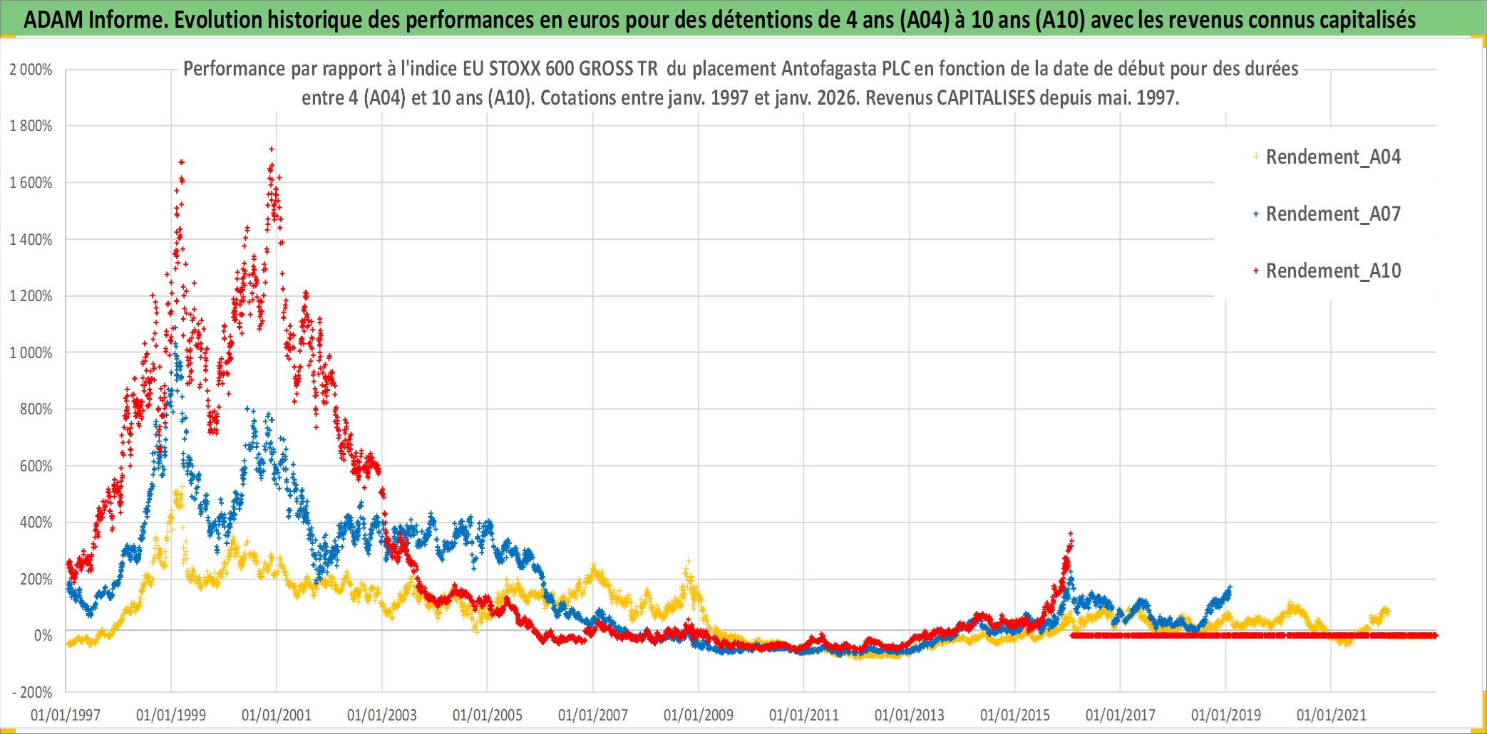 Site dédié aux investisseursPage dédiée sur site financeAnalyse des valorisations hebdomadaires de l'action Antofagasta PLC. Cet actif est cote en GBX. Les valorisations sont en contrevaleur EURO et couvrent les semaines 1997W01 a 2026W05. Les revenus de cet actif financier sont pris en compte depuis la semaine 1997W21. La note globale ESG de cet actif est estimee a 7.0 (apres rebasage entre 0 et 20).