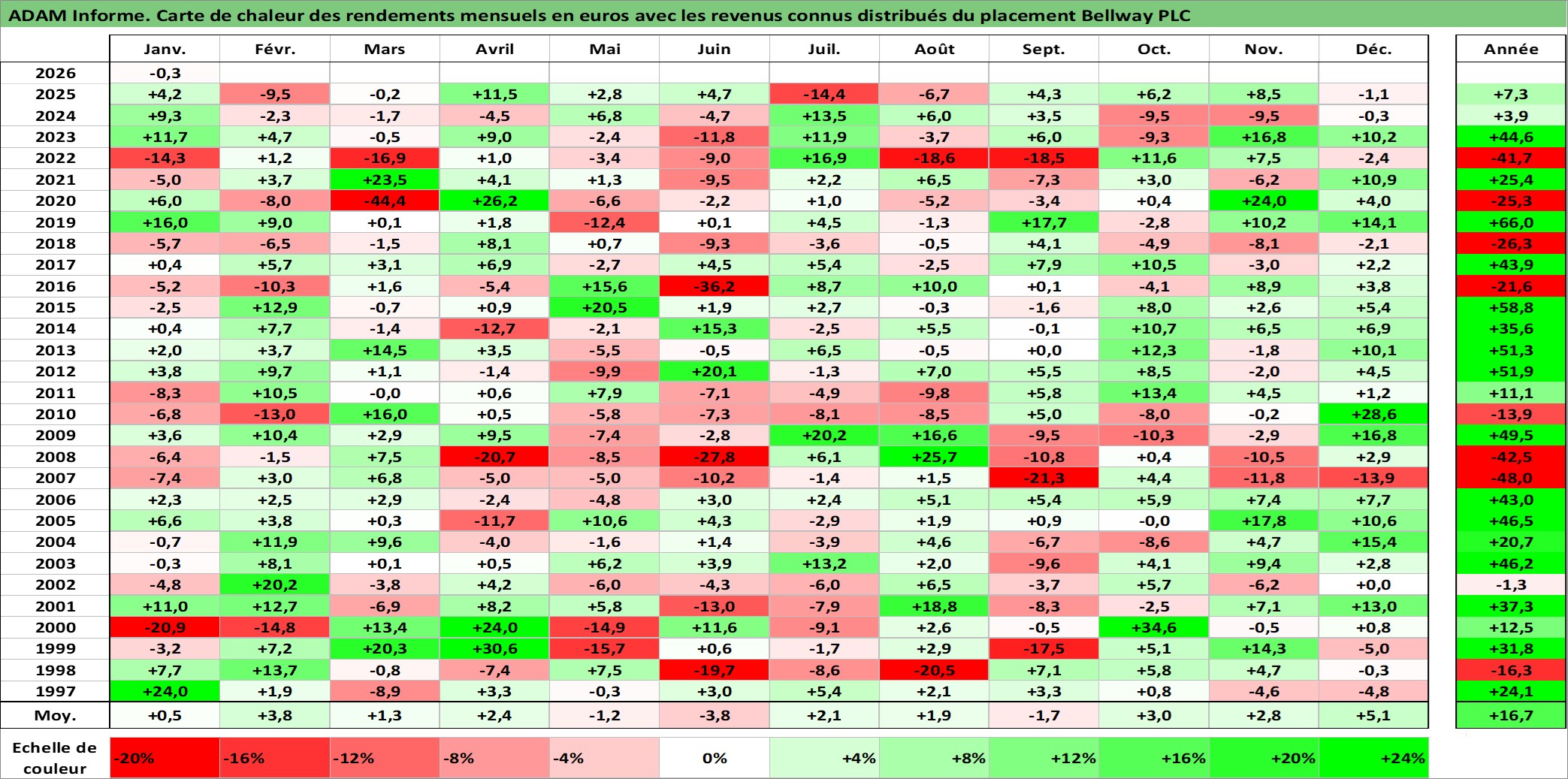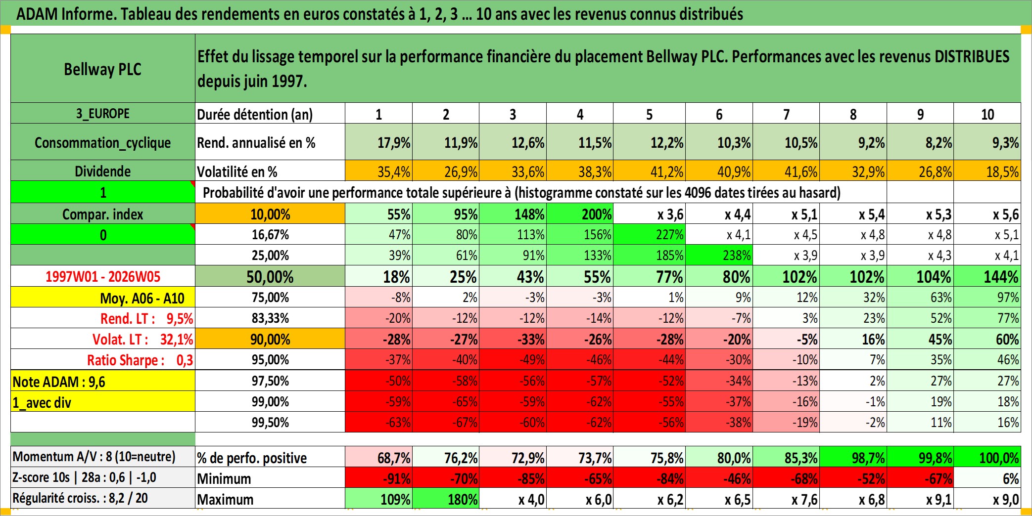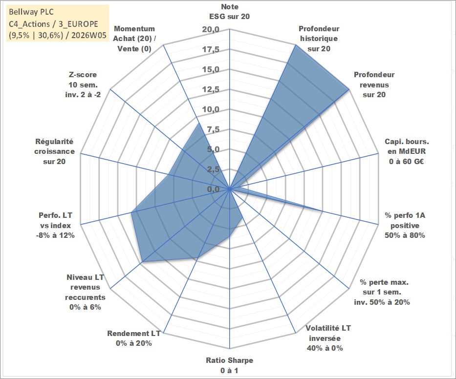 Site dédié aux investisseursPage dédiée sur site financeAnalyse des valorisations hebdomadaires de l'action Bellway PLC. Cet actif est cote en GBX. Les valorisations sont en contrevaleur EURO et couvrent les semaines 1997W01 a 2026W05. Les revenus de cet actif financier sont pris en compte depuis la semaine 1997W23. La note ESG de cet actif n'est pas connue.