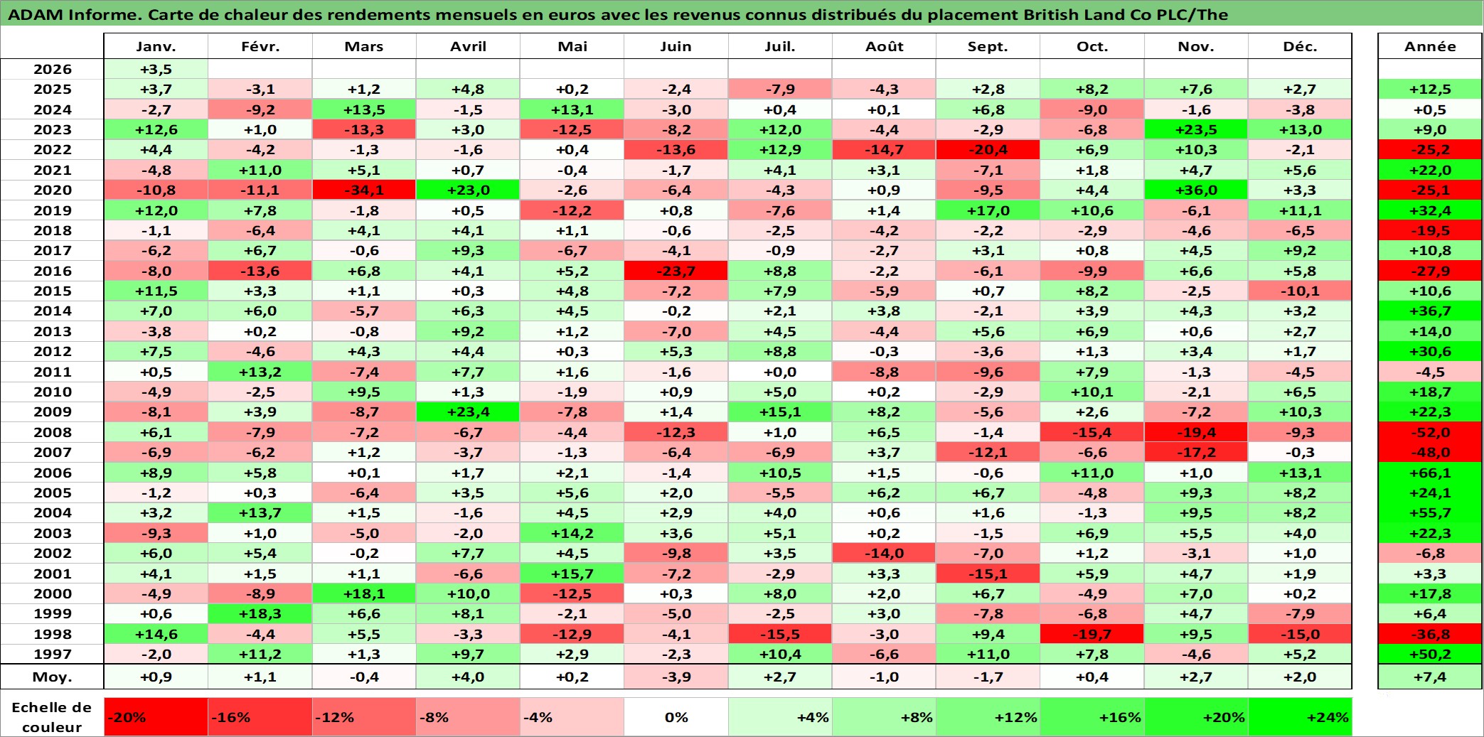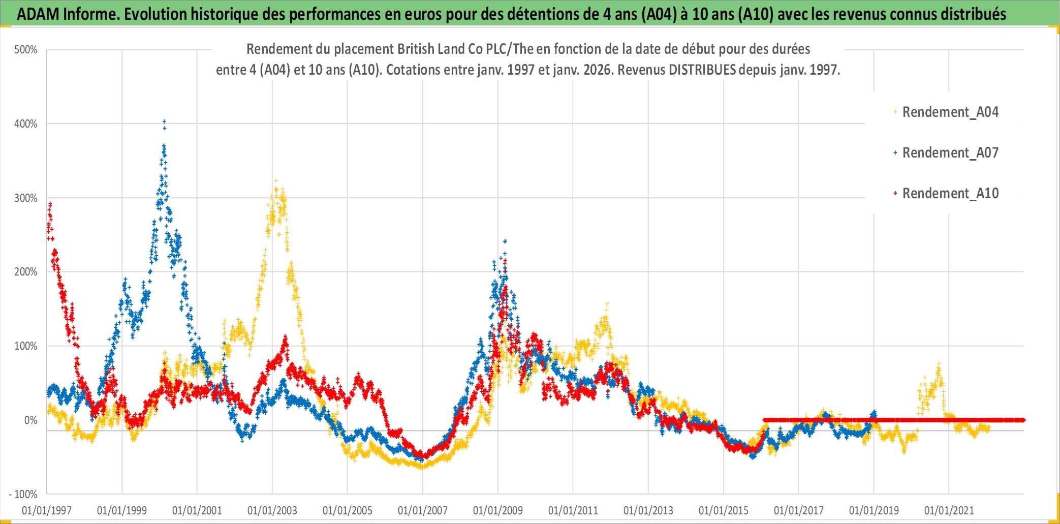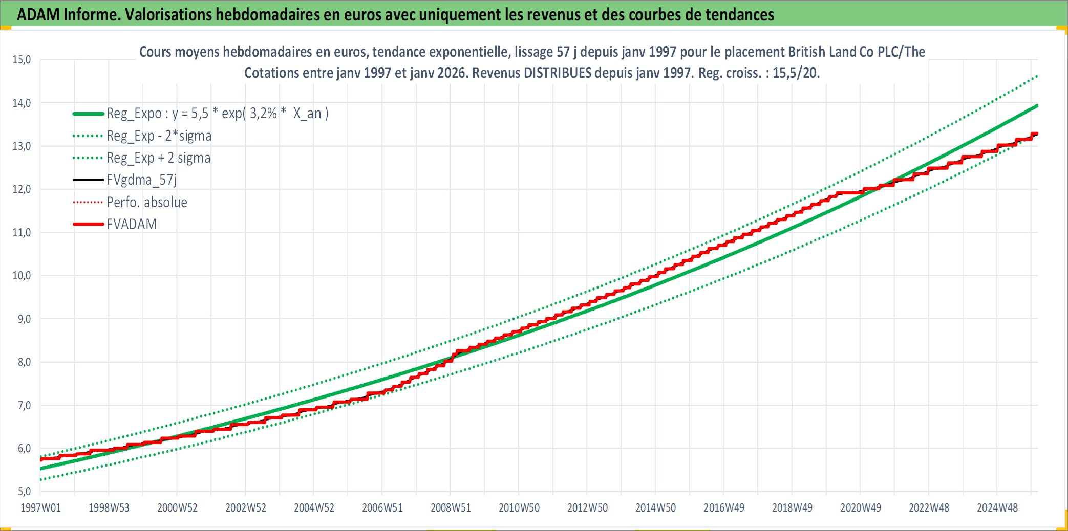 Site dédié aux investisseursPage dédiée sur site financeAnalyse des valorisations hebdomadaires de l'action British Land Co PLC/The. Cet actif est cote en GBX. Les valorisations sont en contrevaleur EURO et couvrent les semaines 1997W01 a 2026W05. Les revenus de cet actif financier sont pris en compte depuis la semaine 1997W03. La note globale ESG de cet actif est estimee a 18.0 (apres rebasage entre 0 et 20).