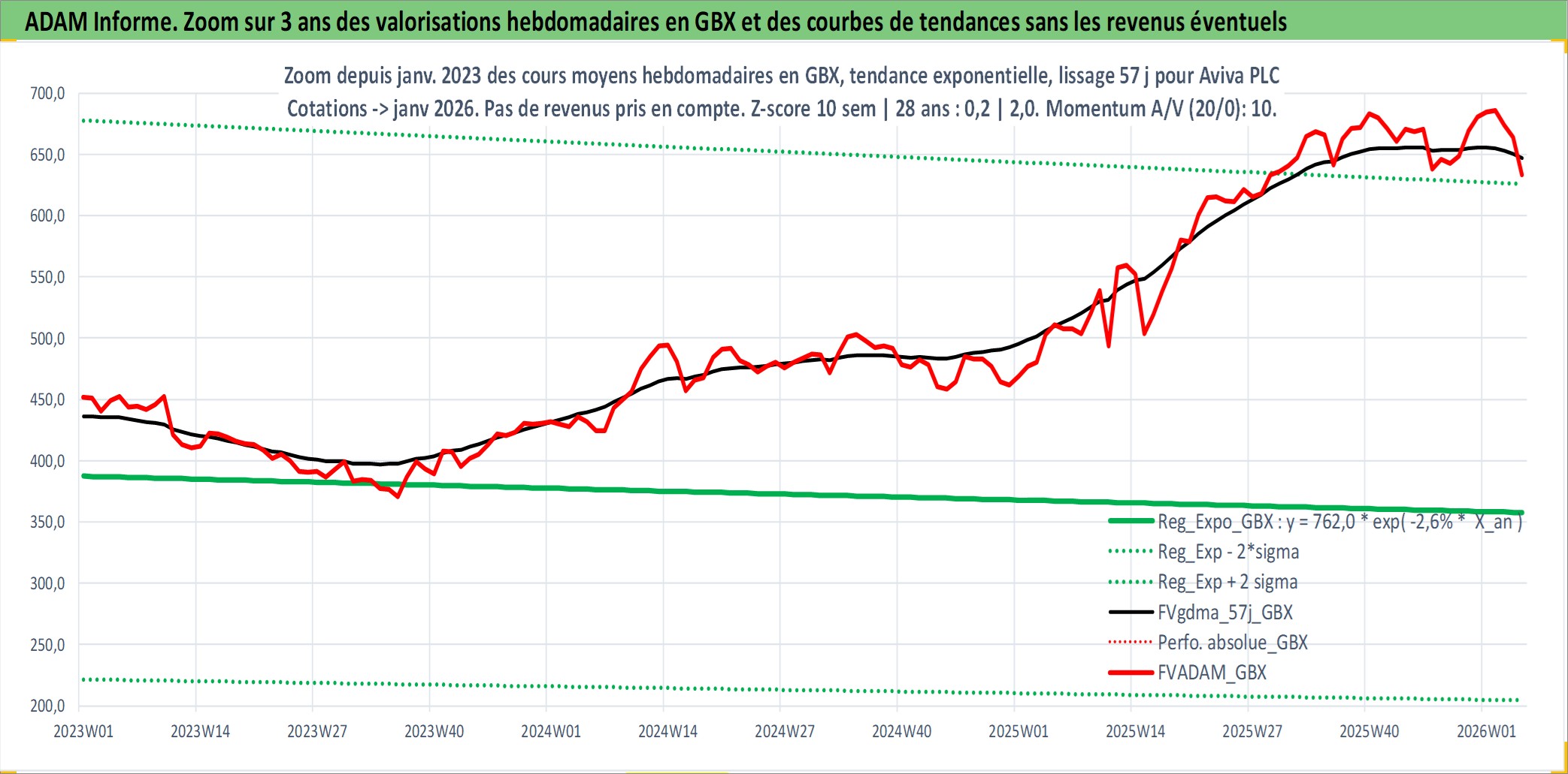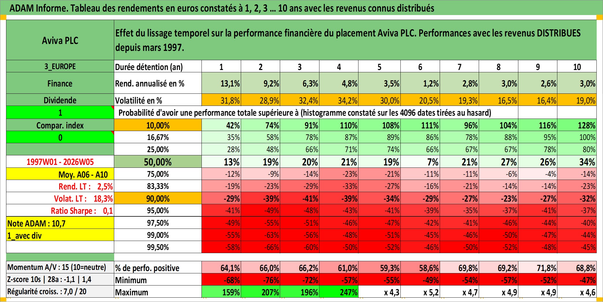 Site dédié aux investisseursPage dédiée sur site financeAnalyse des valorisations hebdomadaires de l'action Aviva PLC. Cet actif est cote en GBX. Les valorisations sont en contrevaleur EURO et couvrent les semaines 1997W01 a 2026W05. Les revenus de cet actif financier sont pris en compte depuis la semaine 1997W11. La note globale ESG de cet actif est estimee a 16.0 (apres rebasage entre 0 et 20).
