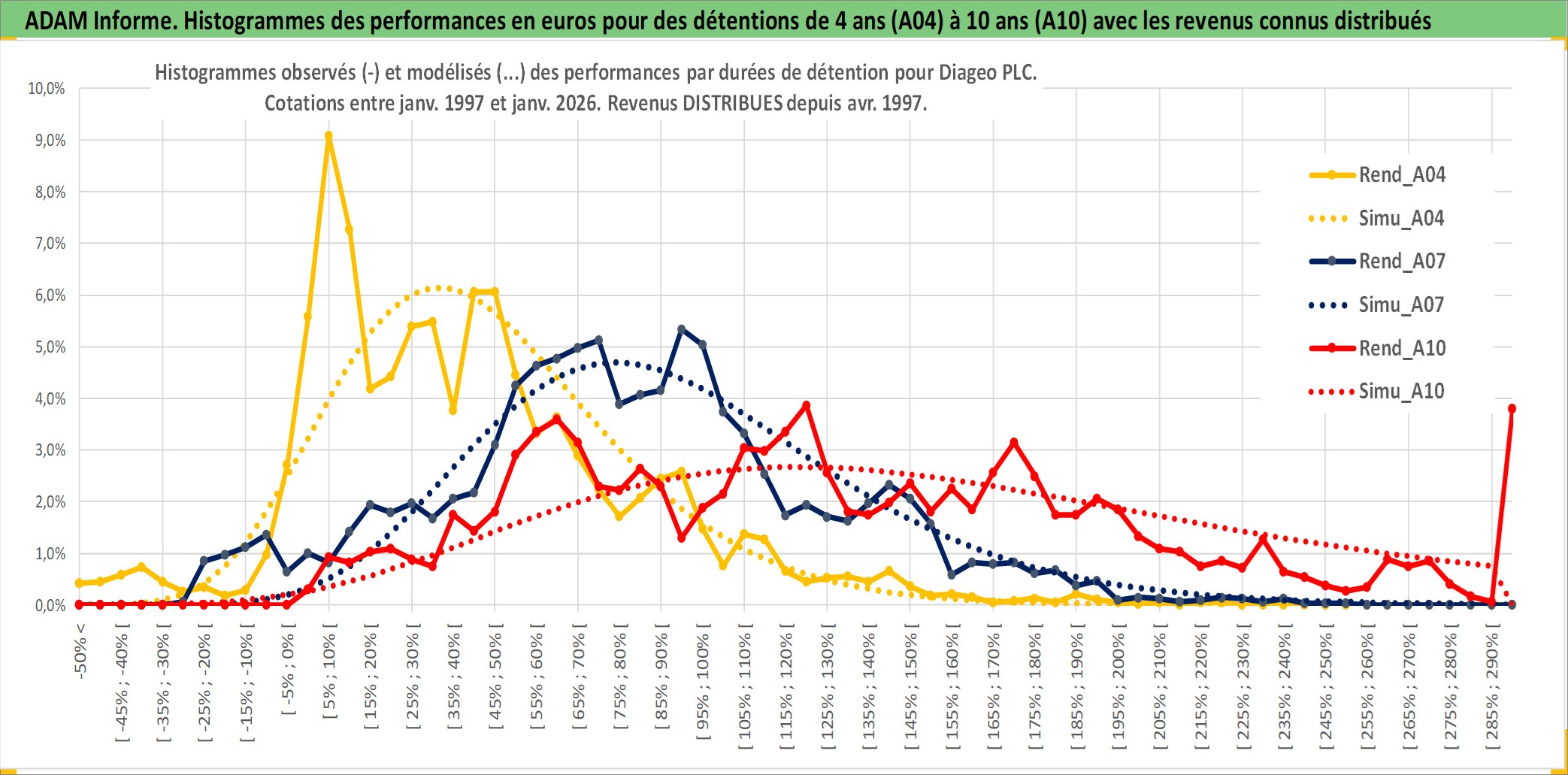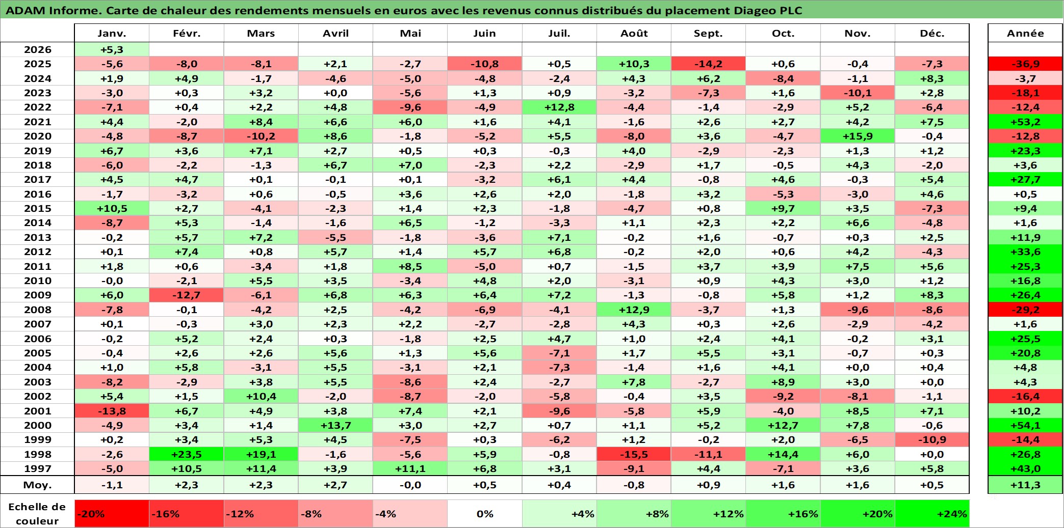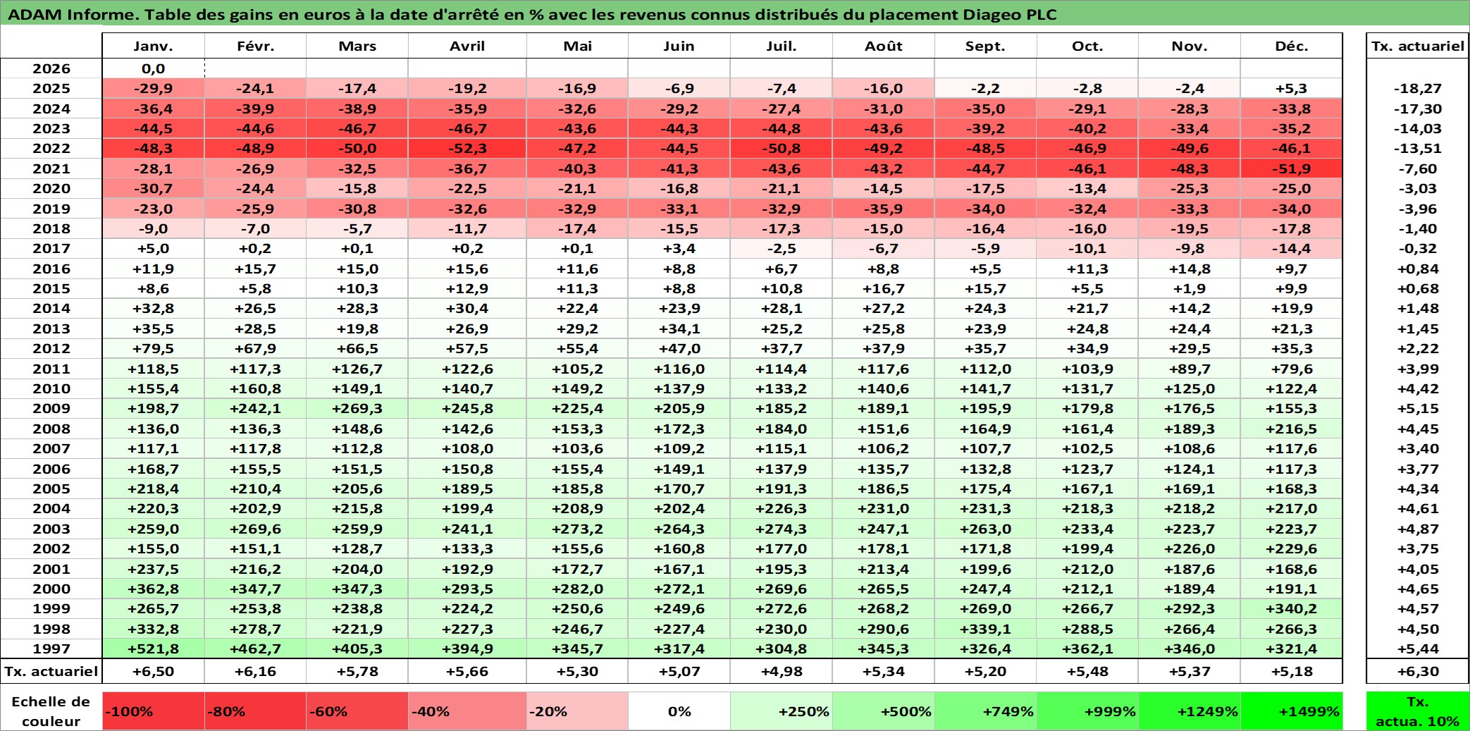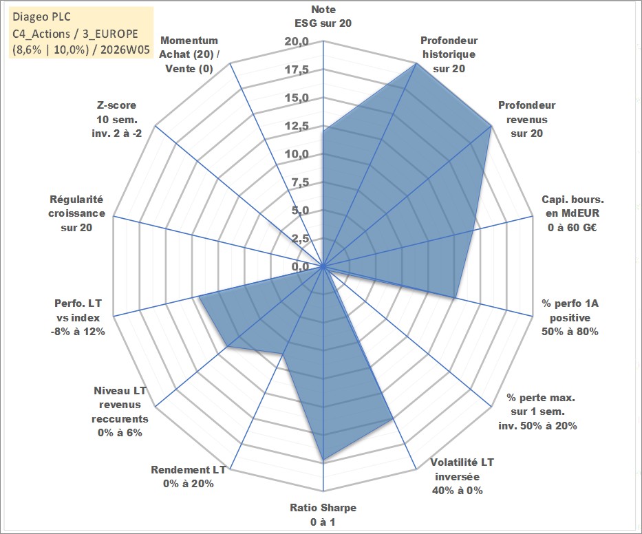 Site dédié aux investisseursPage dédiée sur site financeAnalyse des valorisations hebdomadaires de l'action Diageo PLC. Cet actif est cote en GBX. Les valorisations sont en contrevaleur EURO et couvrent les semaines 1997W01 a 2026W05. Les revenus de cet actif financier sont pris en compte depuis la semaine 1997W14. La note globale ESG de cet actif est estimee a 12.0 (apres rebasage entre 0 et 20).