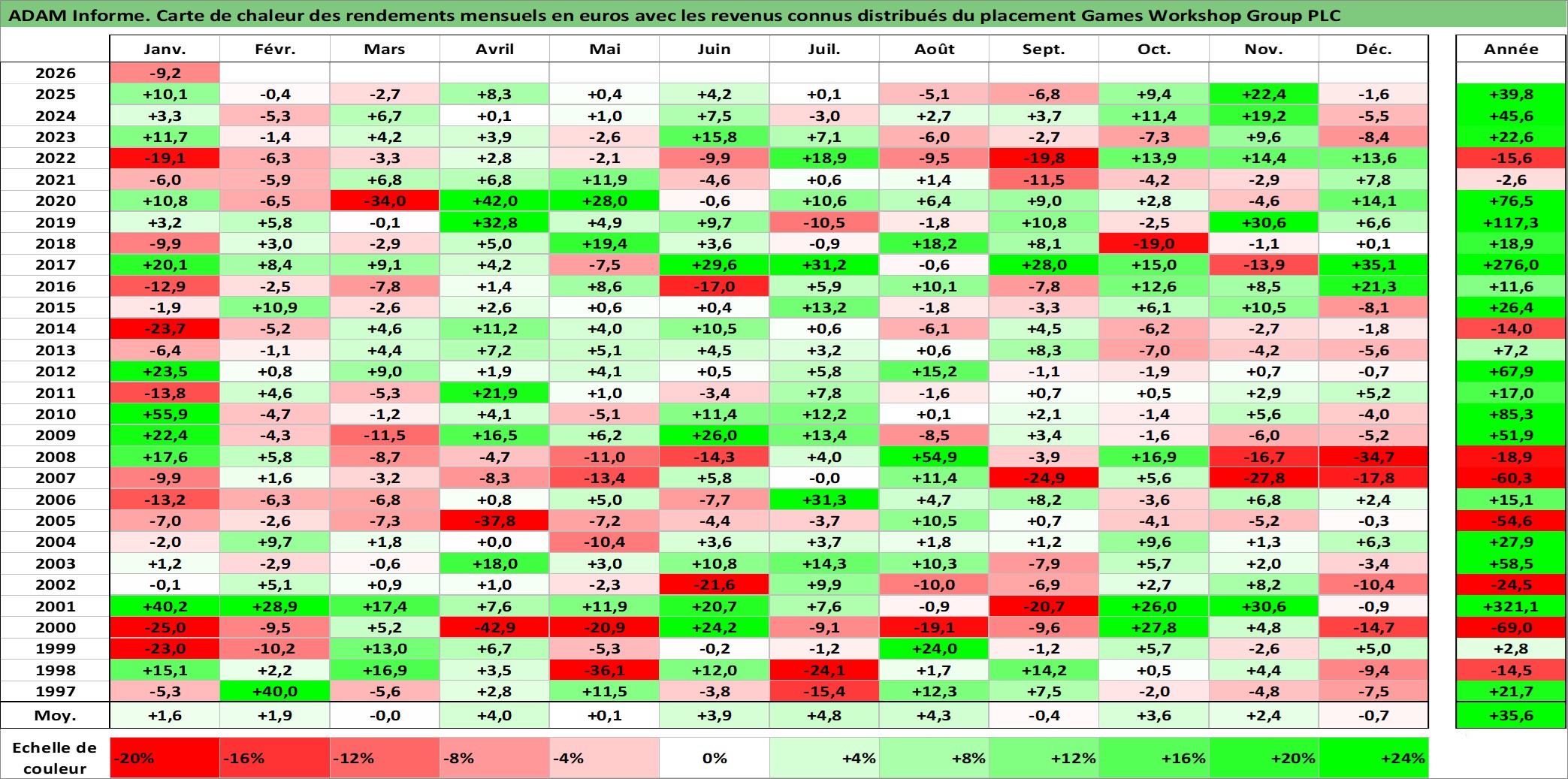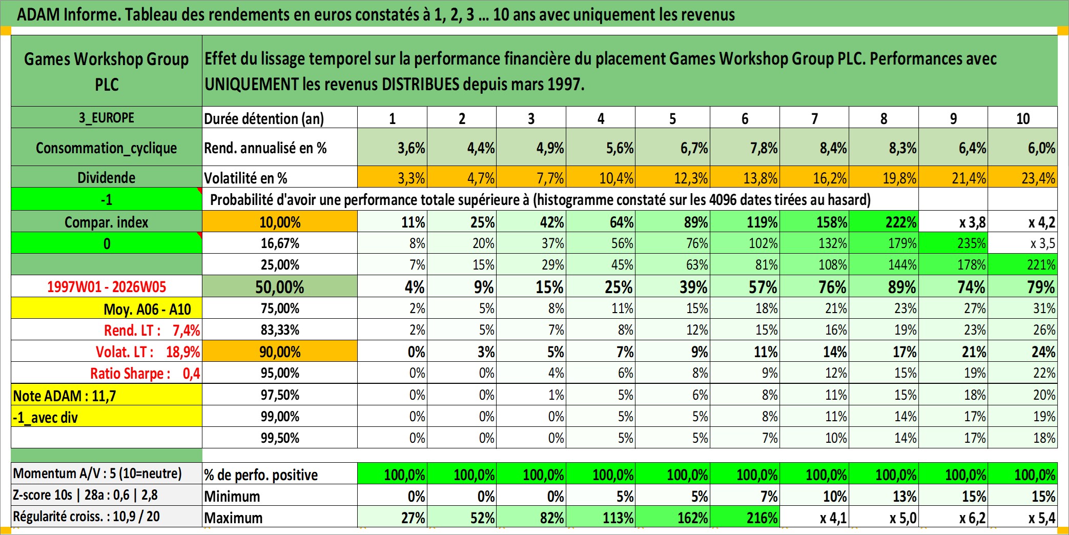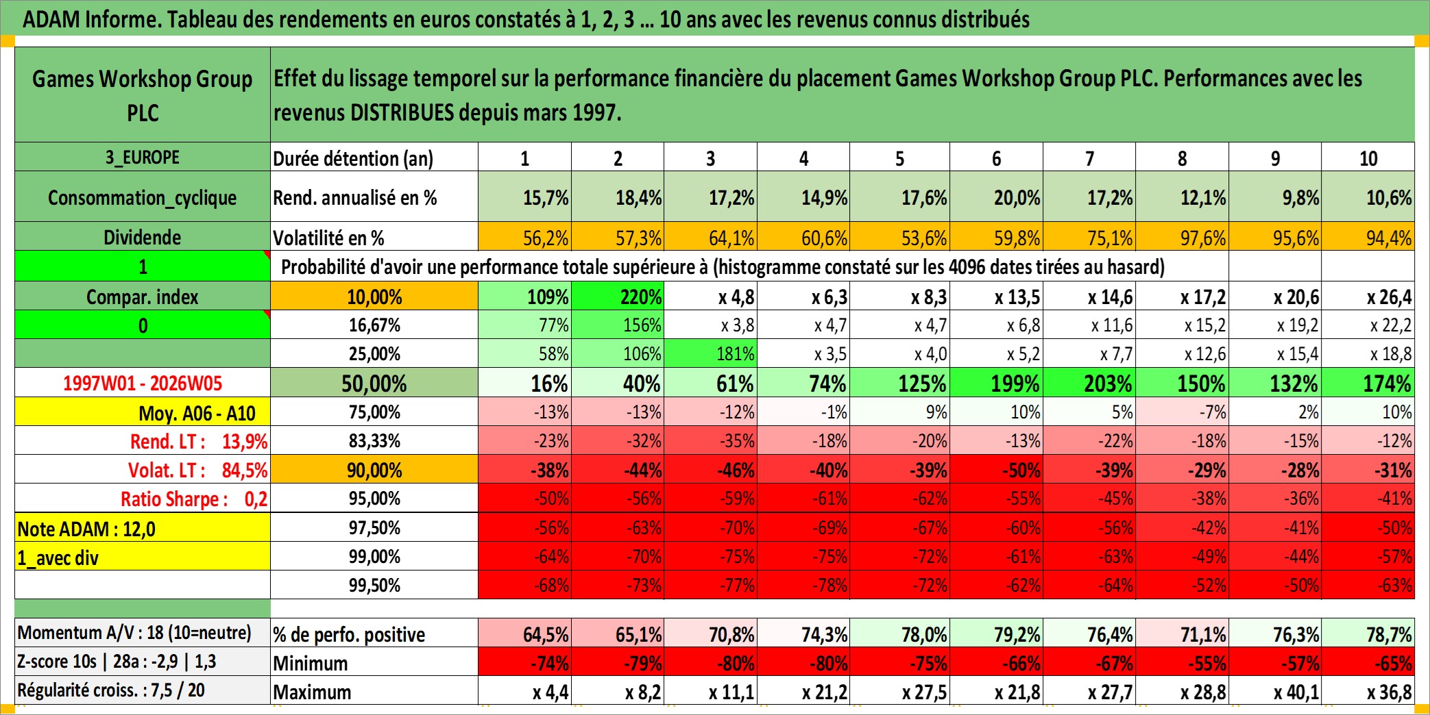 Site dédié aux investisseursPage dédiée sur site financeAnalyse des valorisations hebdomadaires de l'action Games Workshop Group PLC. Cet actif est cote en GBX. Les valorisations sont en contrevaleur EURO et couvrent les semaines 1997W01 a 2026W05. Les revenus de cet actif financier sont pris en compte depuis la semaine 1997W13. La note ESG de cet actif n'est pas connue.