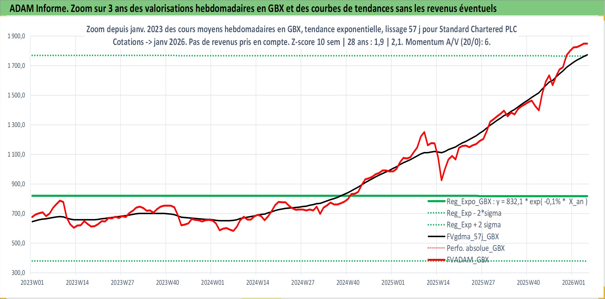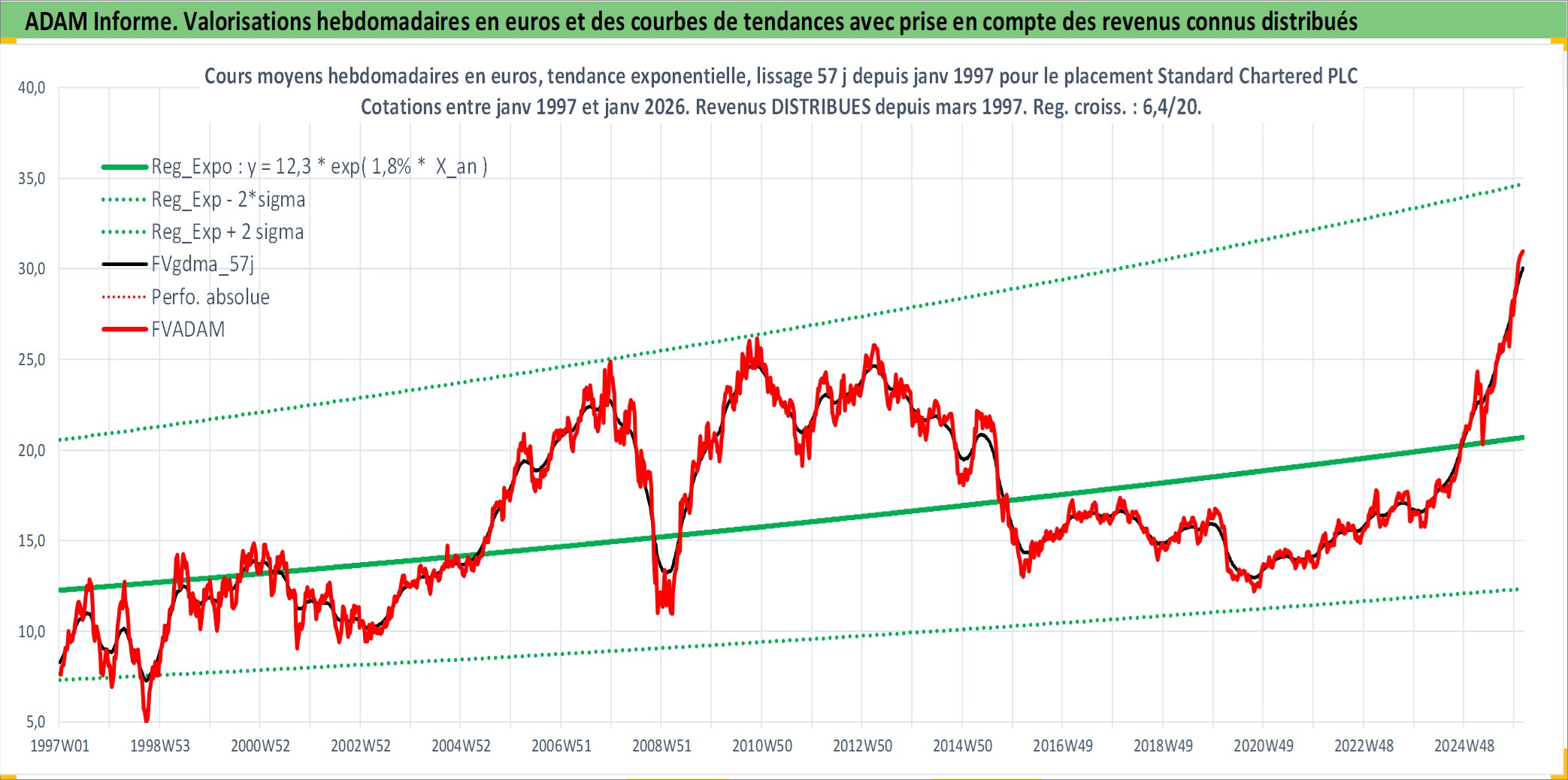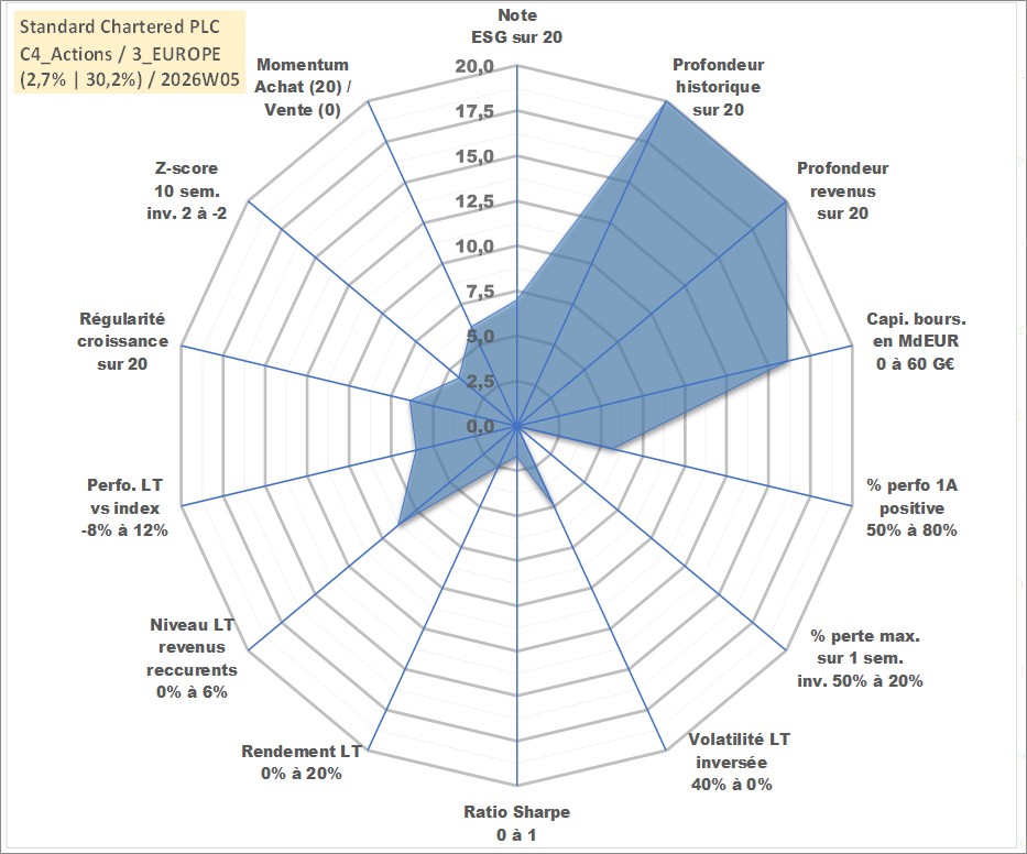 Site dédié aux investisseursPage dédiée sur site financeAnalyse des valorisations hebdomadaires de l'action Standard Chartered PLC. Cet actif est cote en GBX. Les valorisations sont en contrevaleur EURO et couvrent les semaines 1997W01 a 2026W05. Les revenus de cet actif financier sont pris en compte depuis la semaine 1997W11. La note globale ESG de cet actif est estimee a 7.0 (apres rebasage entre 0 et 20).