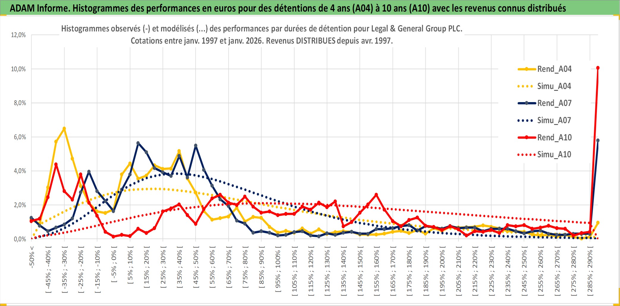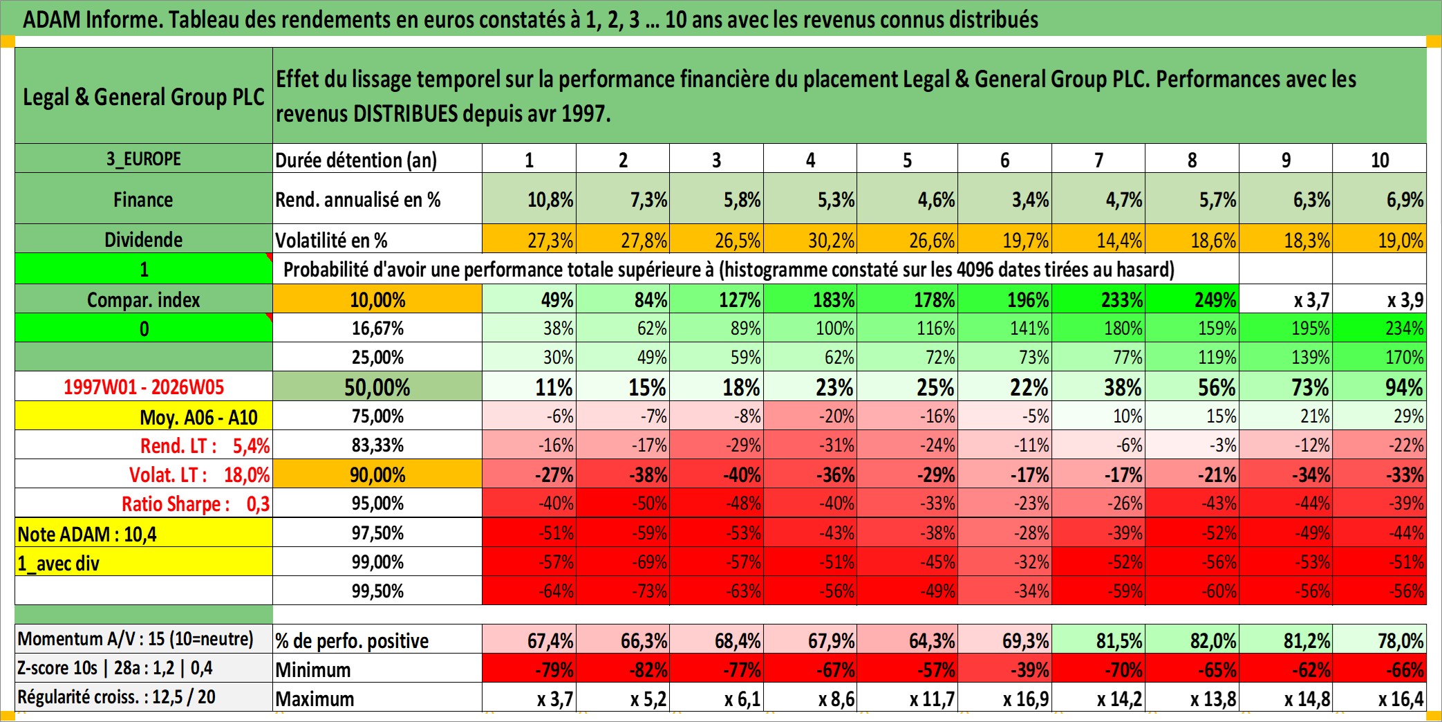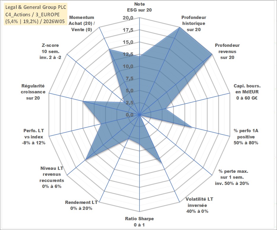 Site dédié aux investisseursPage dédiée sur site financeAnalyse des valorisations hebdomadaires de l'action Legal & General Group PLC. Cet actif est cote en GBX. Les valorisations sont en contrevaleur EURO et couvrent les semaines 1997W01 a 2026W05. Les revenus de cet actif financier sont pris en compte depuis la semaine 1997W18. La note globale ESG de cet actif est estimee a 12.0 (apres rebasage entre 0 et 20).