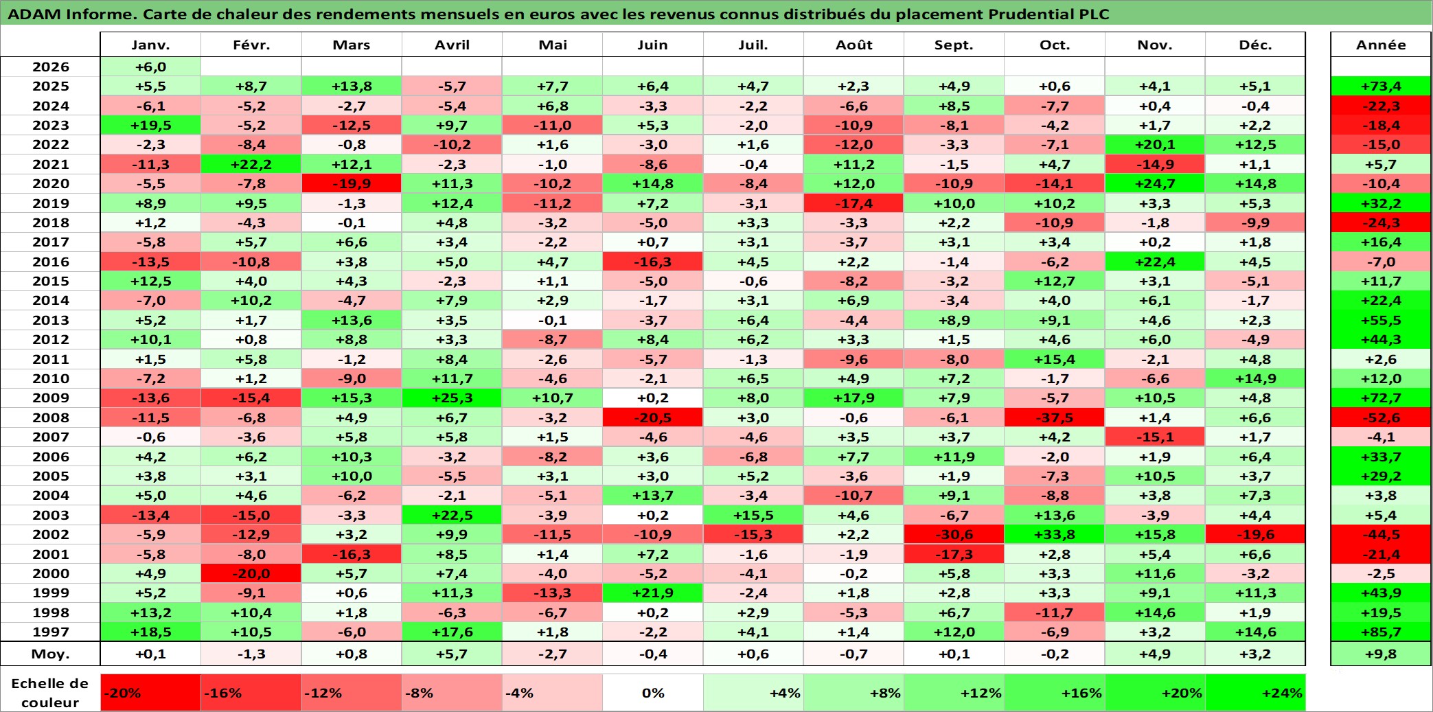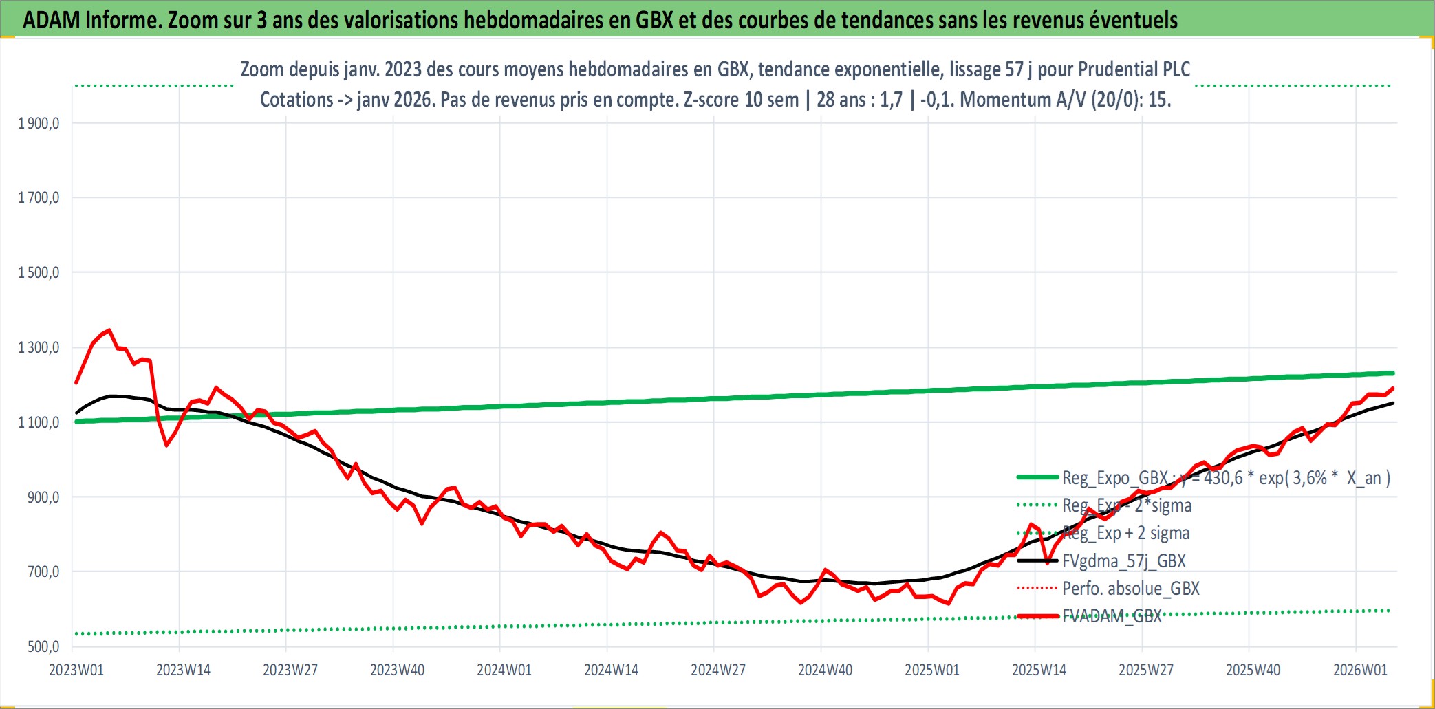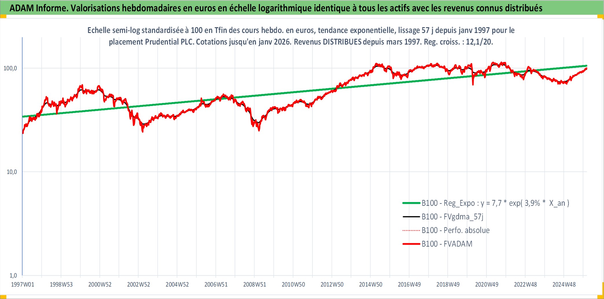 Site dédié aux investisseursPage dédiée sur site financeAnalyse des valorisations hebdomadaires de l'action Prudential PLC. Cet actif est cote en GBX. Les valorisations sont en contrevaleur EURO et couvrent les semaines 1997W01 a 2026W05. Les revenus de cet actif financier sont pris en compte depuis la semaine 1997W13. La note globale ESG de cet actif est estimee a 13.0 (apres rebasage entre 0 et 20).