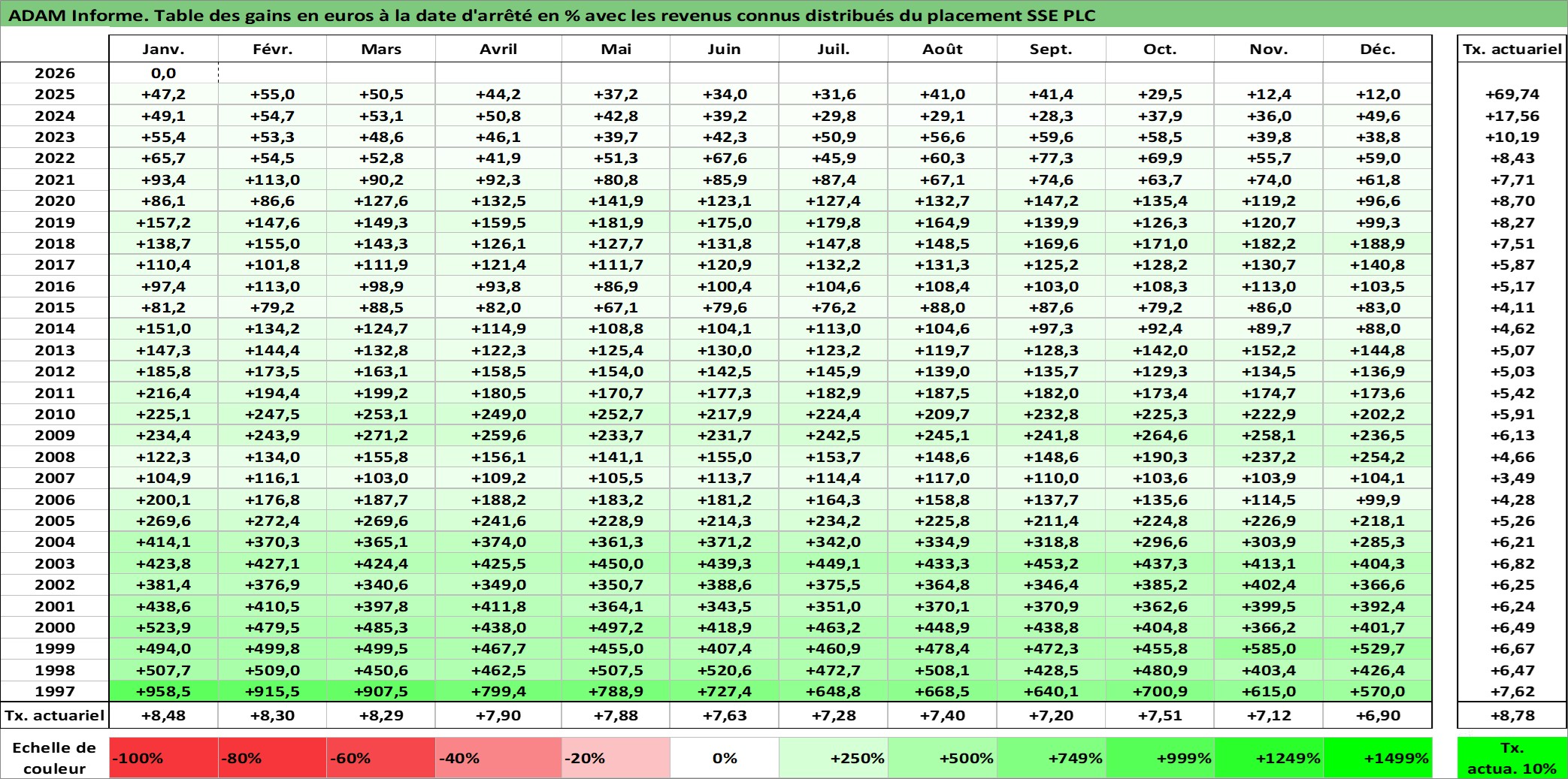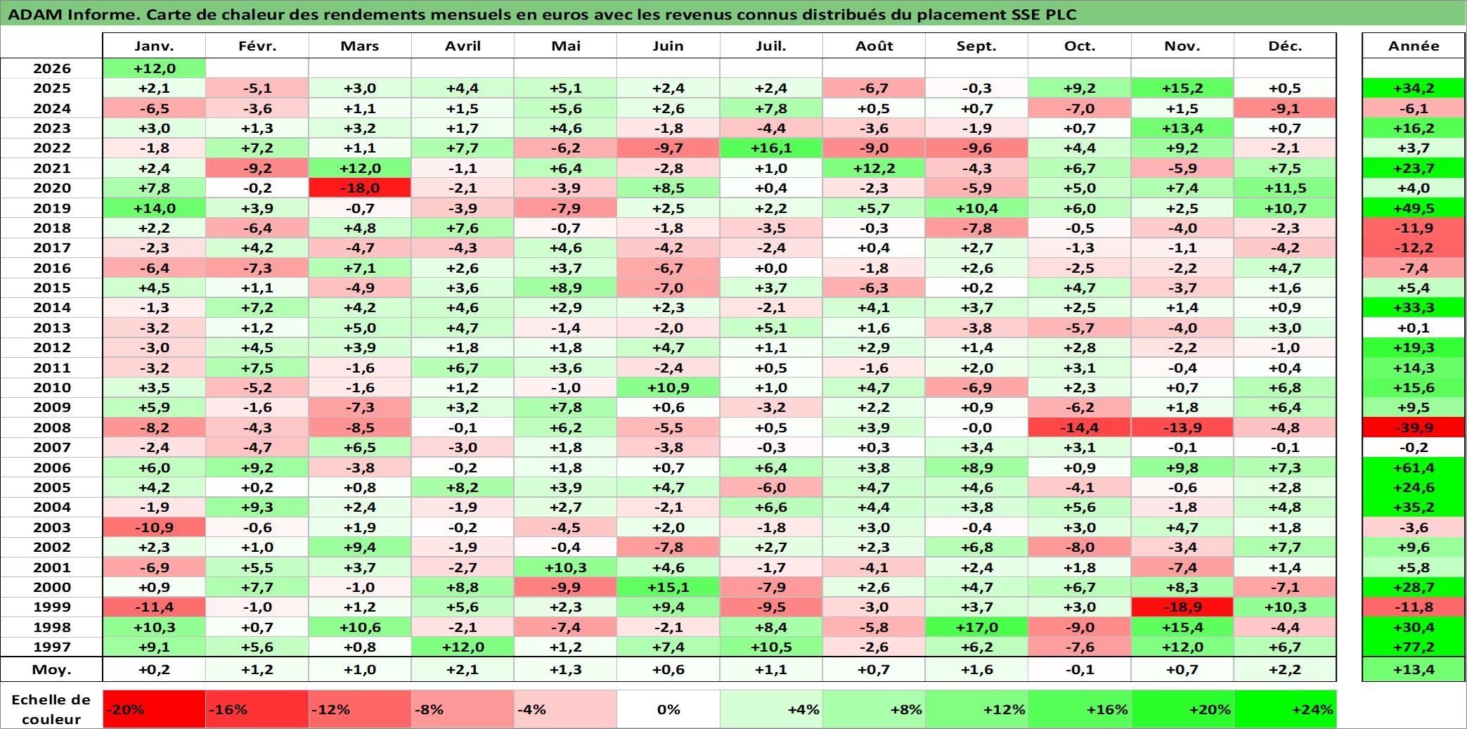 Site dédié aux investisseursPage dédiée sur site financeAnalyse des valorisations hebdomadaires de l'action SSE PLC. Cet actif est cote en GBX. Les valorisations sont en contrevaleur EURO et couvrent les semaines 1997W01 a 2026W05. Les revenus de cet actif financier sont pris en compte depuis la semaine 1997W07. La note globale ESG de cet actif est estimee a 9.0 (apres rebasage entre 0 et 20).