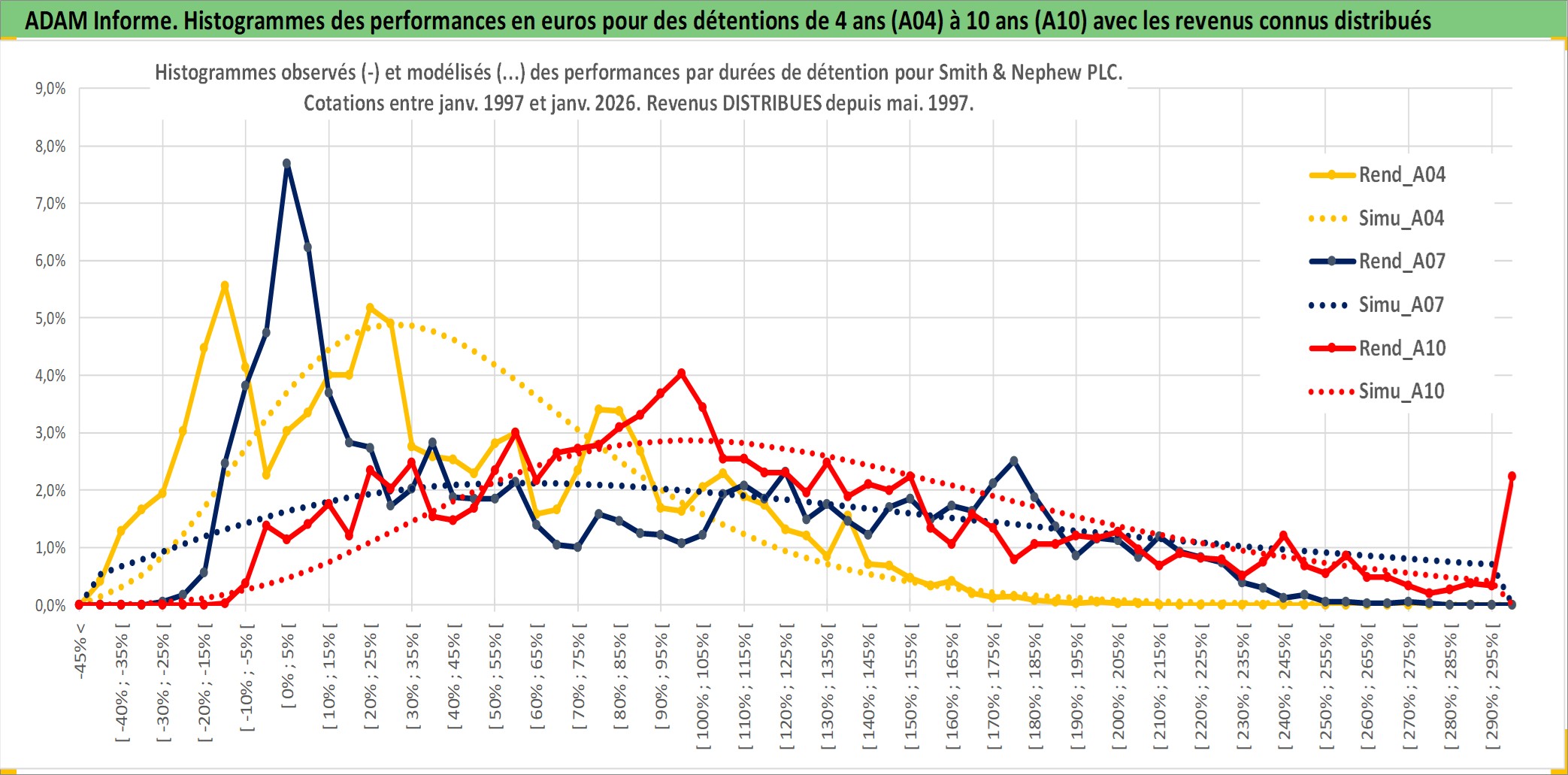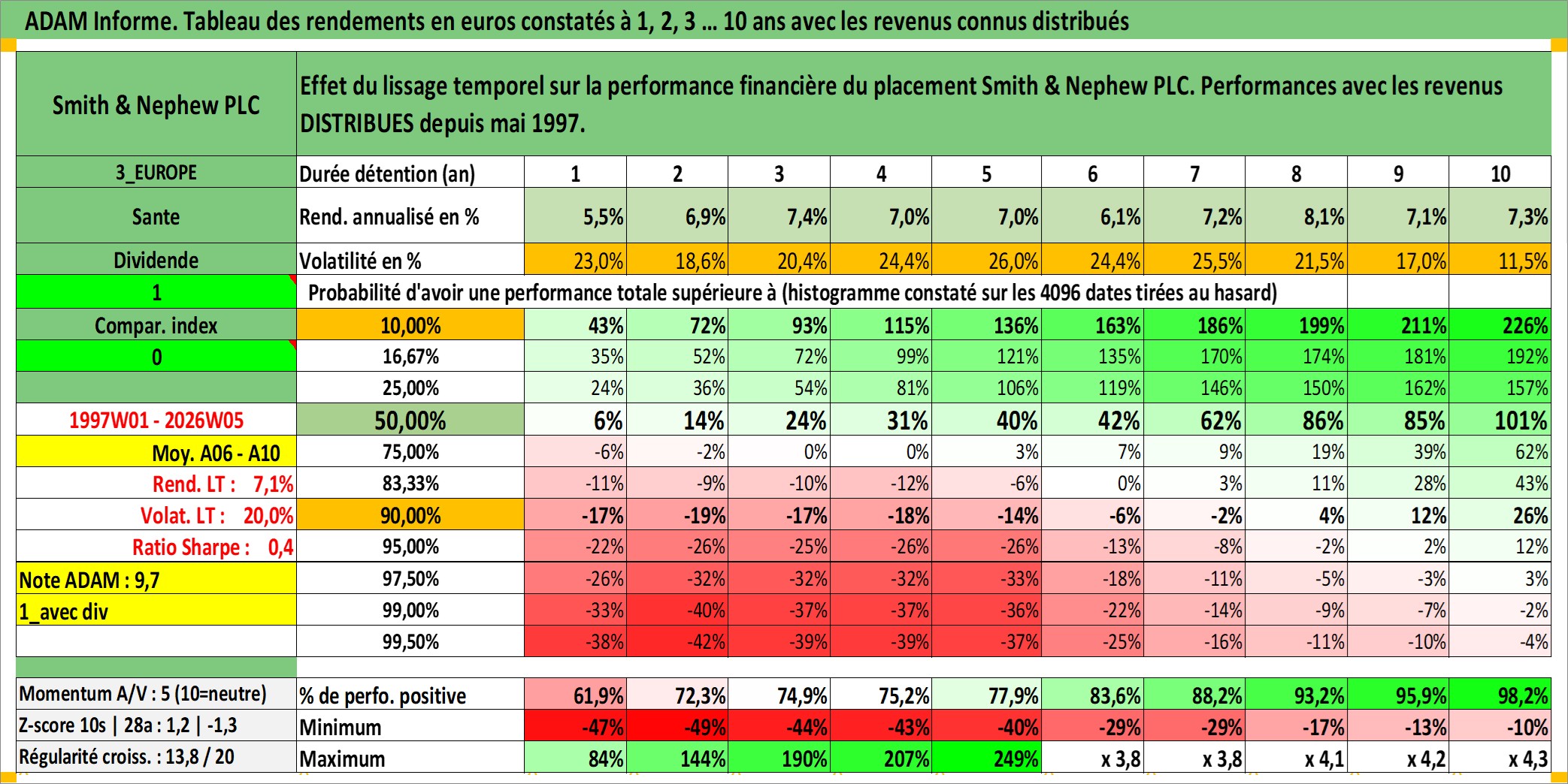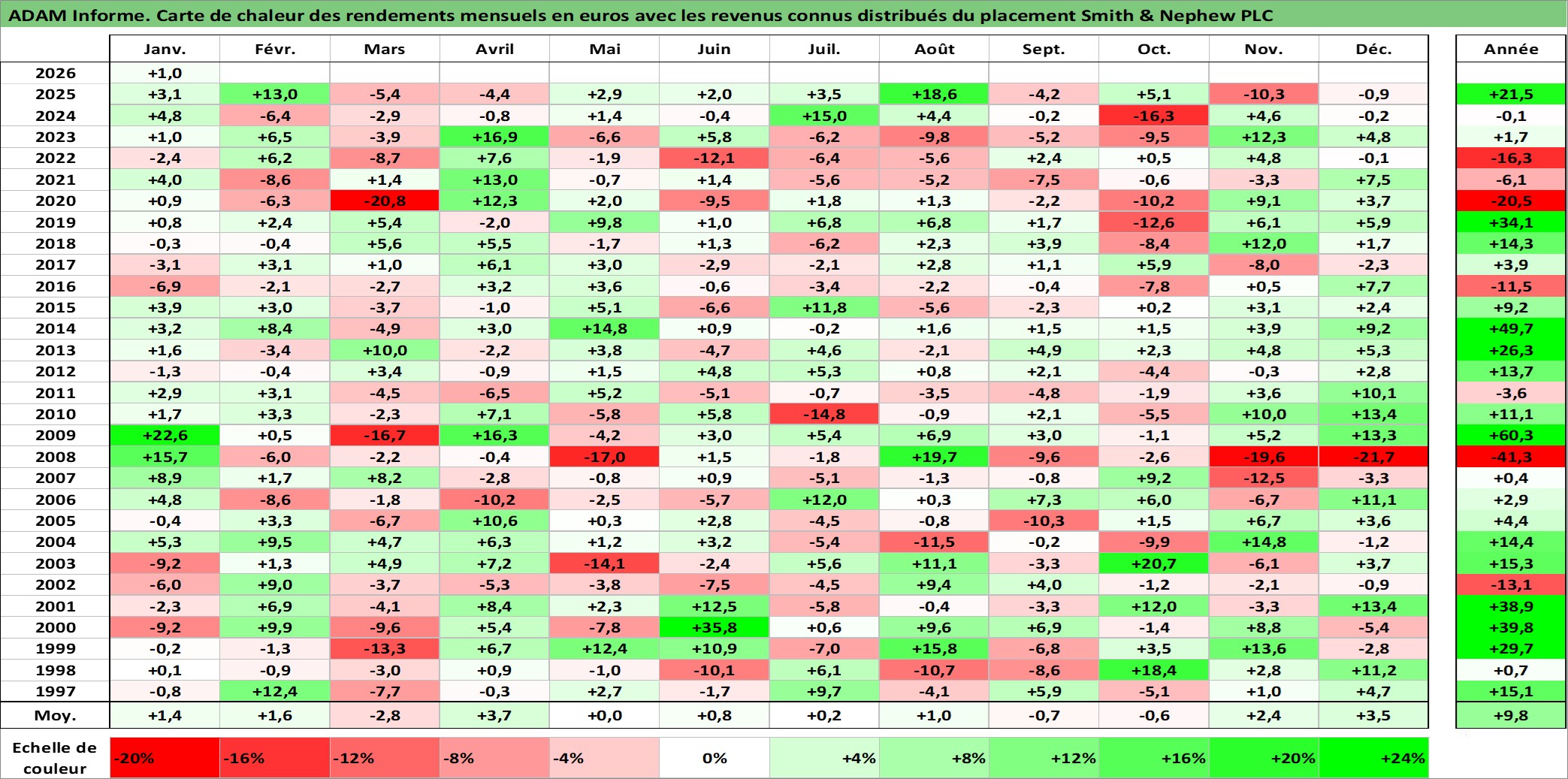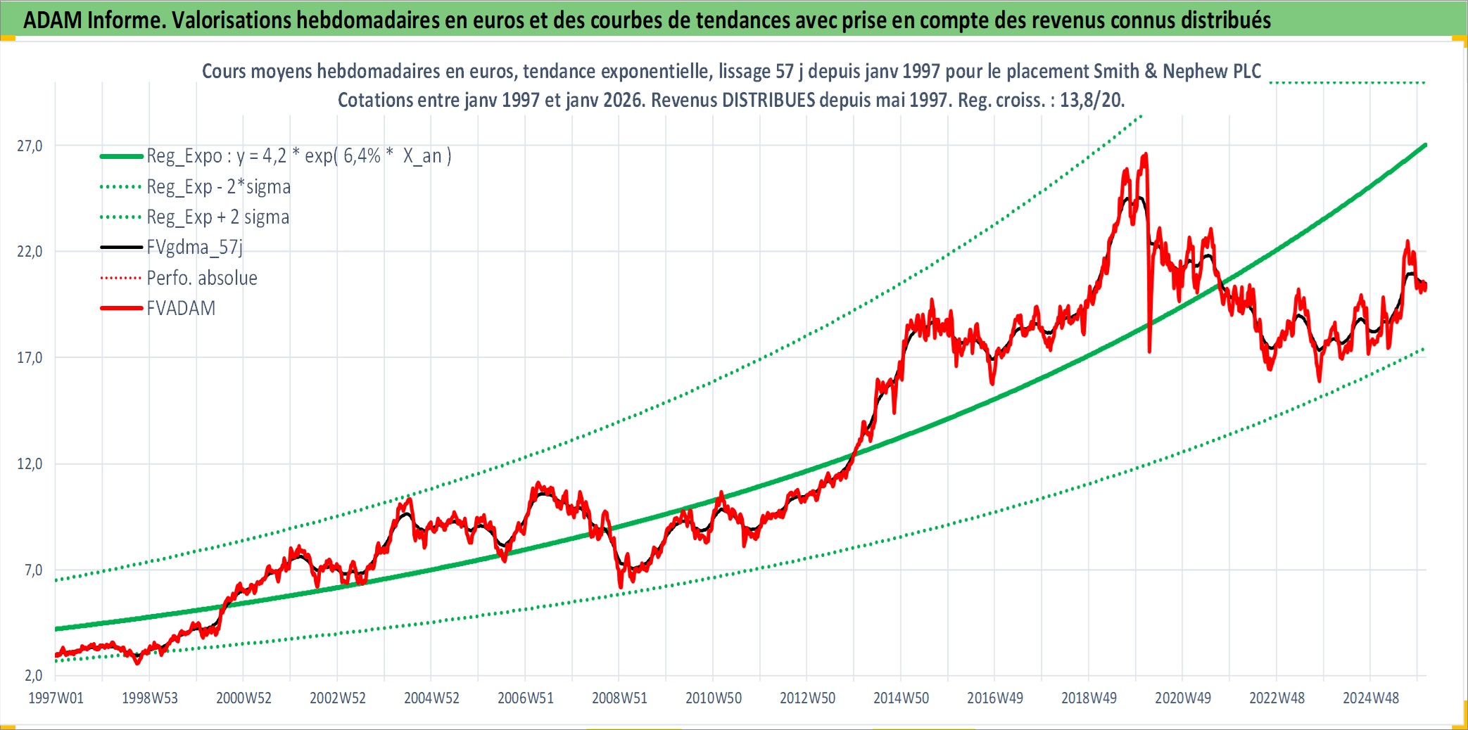 Site dédié aux investisseursPage dédiée sur site financeAnalyse des valorisations hebdomadaires de l'action Smith & Nephew PLC. Cet actif est cote en GBX. Les valorisations sont en contrevaleur EURO et couvrent les semaines 1997W01 a 2026W05. Les revenus de cet actif financier sont pris en compte depuis la semaine 1997W19. La note globale ESG de cet actif est estimee a 7.0 (apres rebasage entre 0 et 20).