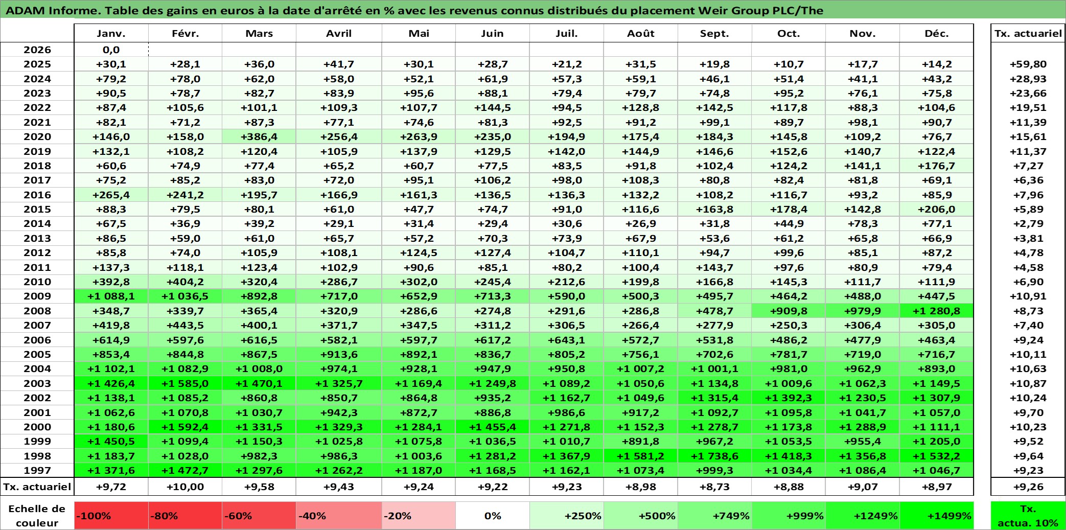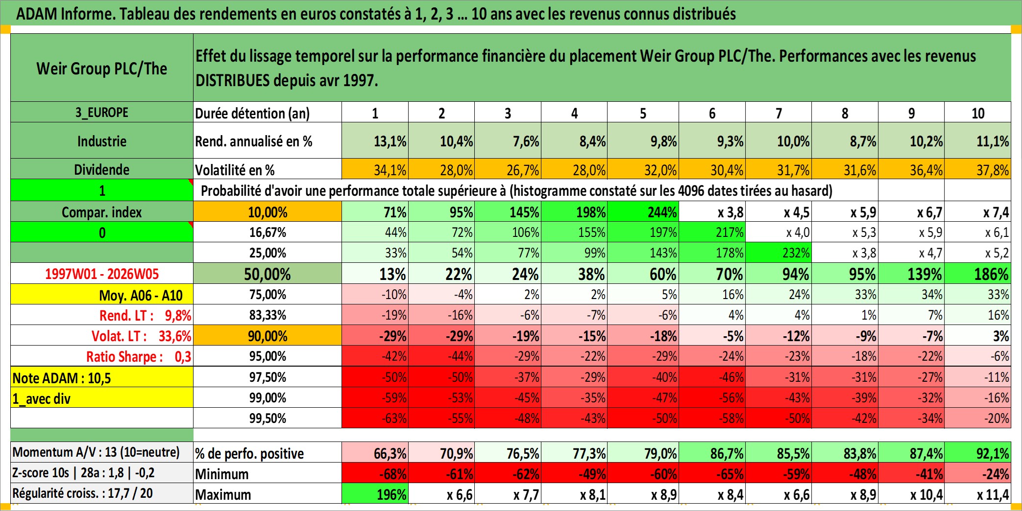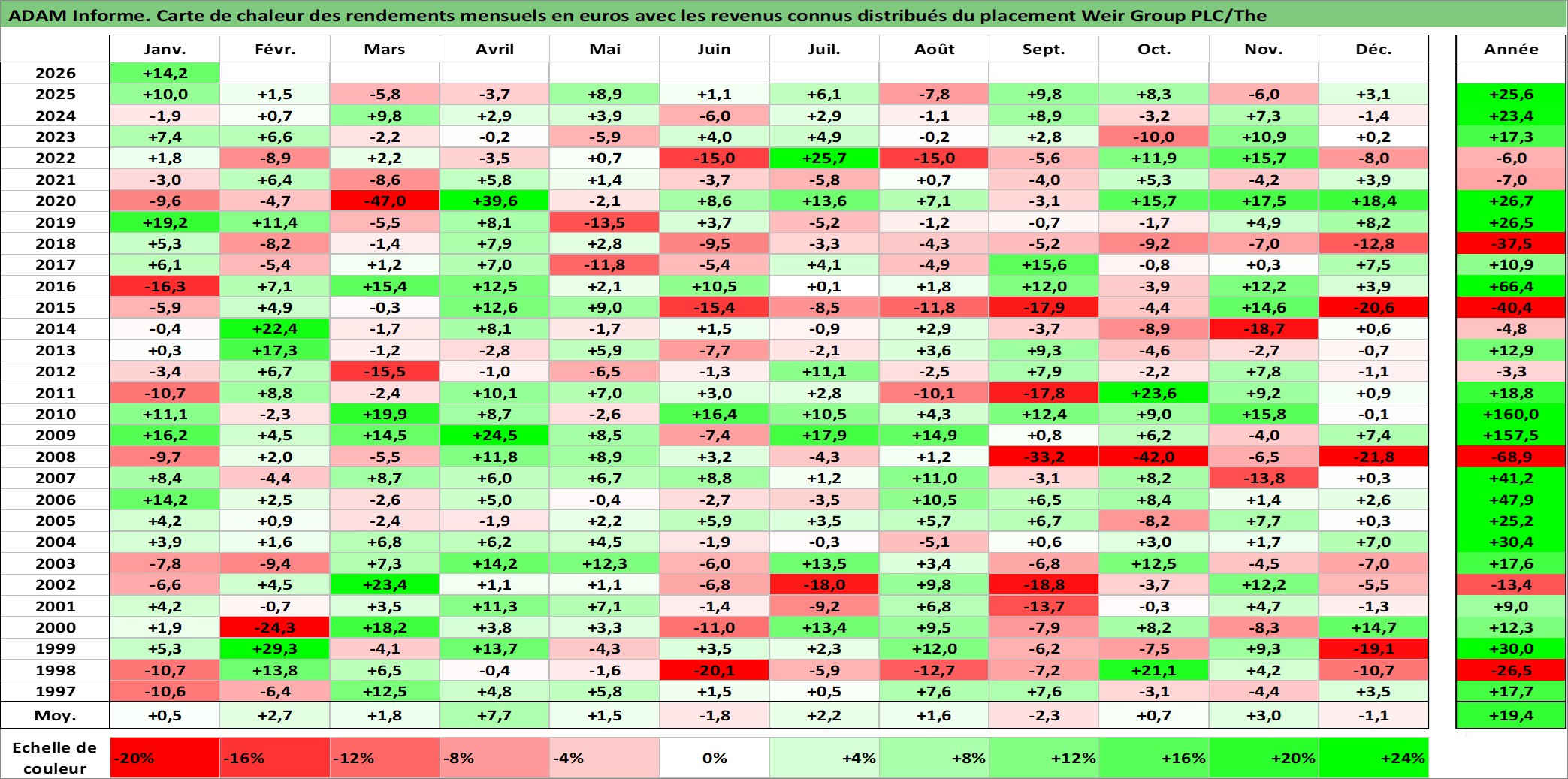 Site dédié aux investisseursPage dédiée sur site financeAnalyse des valorisations hebdomadaires de l'action Weir Group PLC/The. Cet actif est cote en GBX. Les valorisations sont en contrevaleur EURO et couvrent les semaines 1997W01 a 2026W05. Les revenus de cet actif financier sont pris en compte depuis la semaine 1997W14. La note globale ESG de cet actif est estimee a 9.0 (apres rebasage entre 0 et 20).