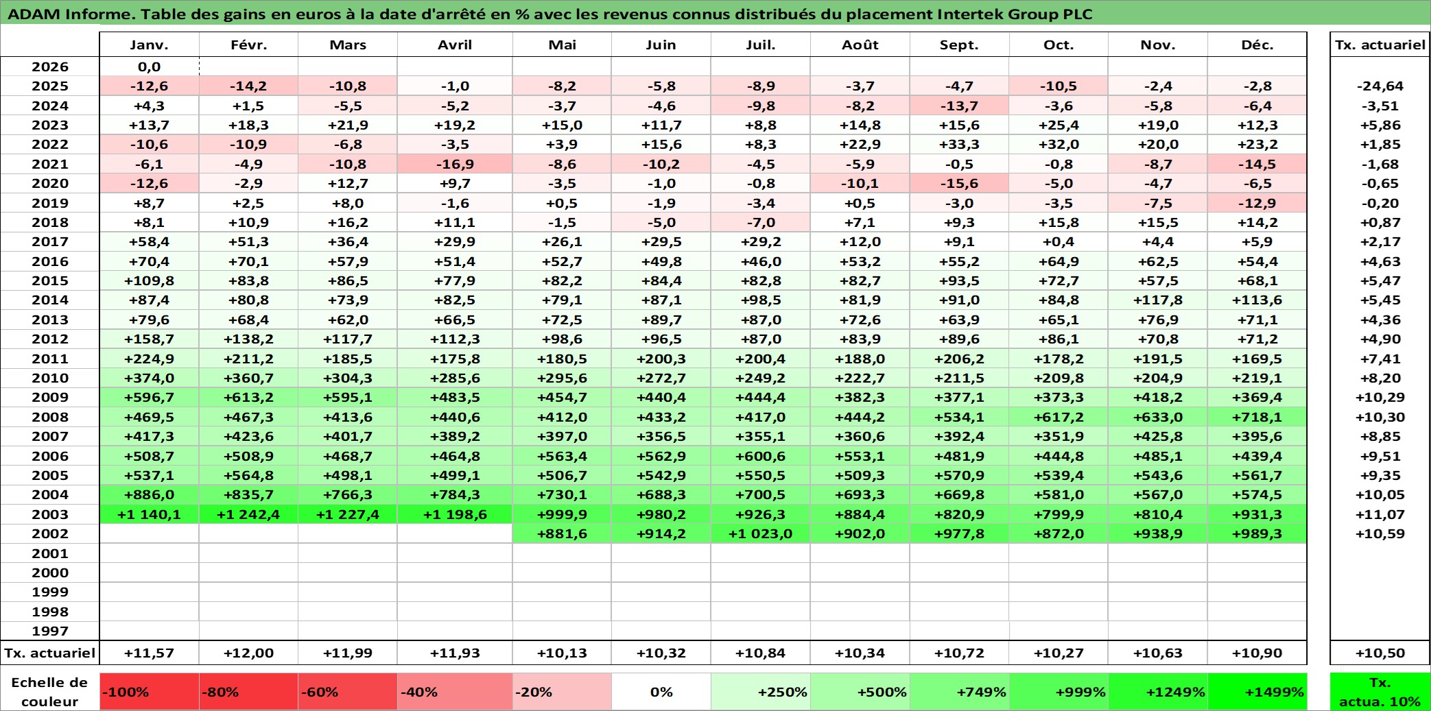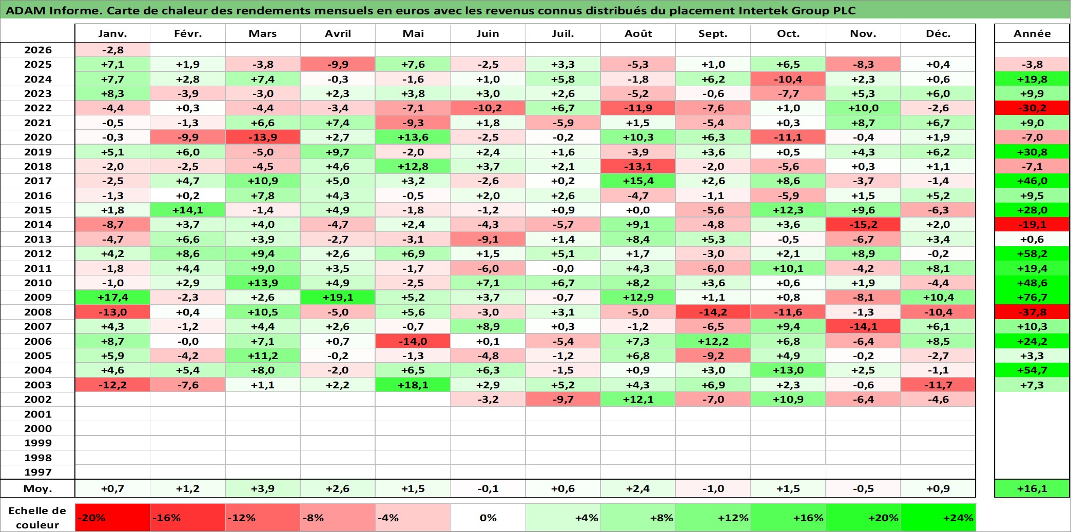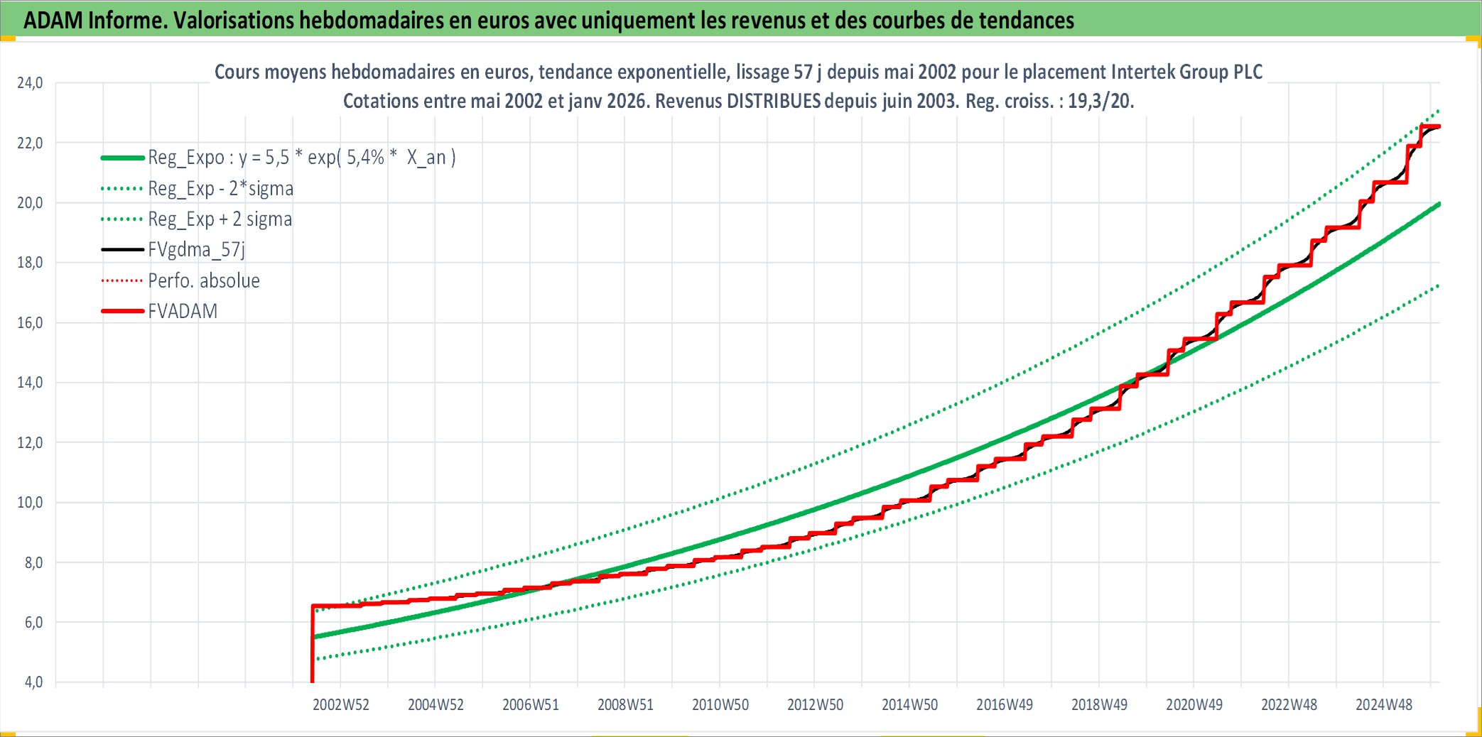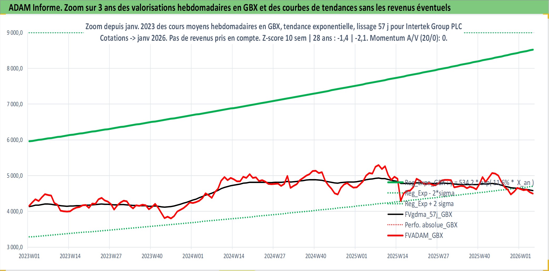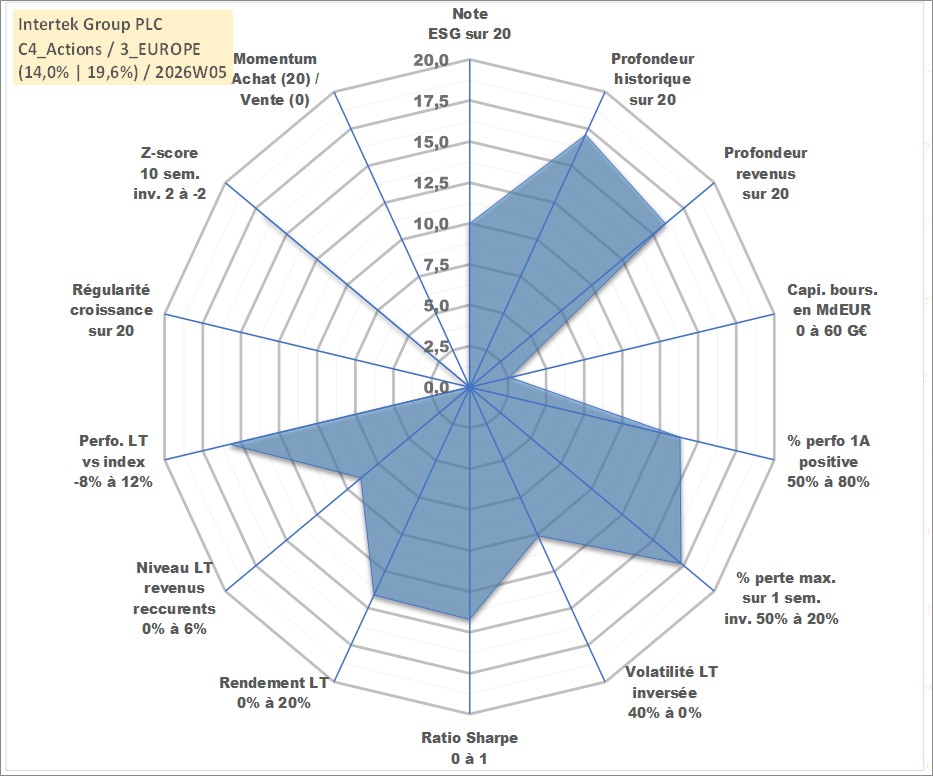 Site dédié aux investisseursPage dédiée sur site financeAnalyse des valorisations hebdomadaires de l'action Intertek Group PLC. Cet actif est cote en GBX. Les valorisations sont en contrevaleur EURO et couvrent les semaines 2002W21 a 2026W05. Les revenus de cet actif financier sont pris en compte depuis la semaine 2003W23. La note globale ESG de cet actif est estimee a 10.0 (apres rebasage entre 0 et 20).