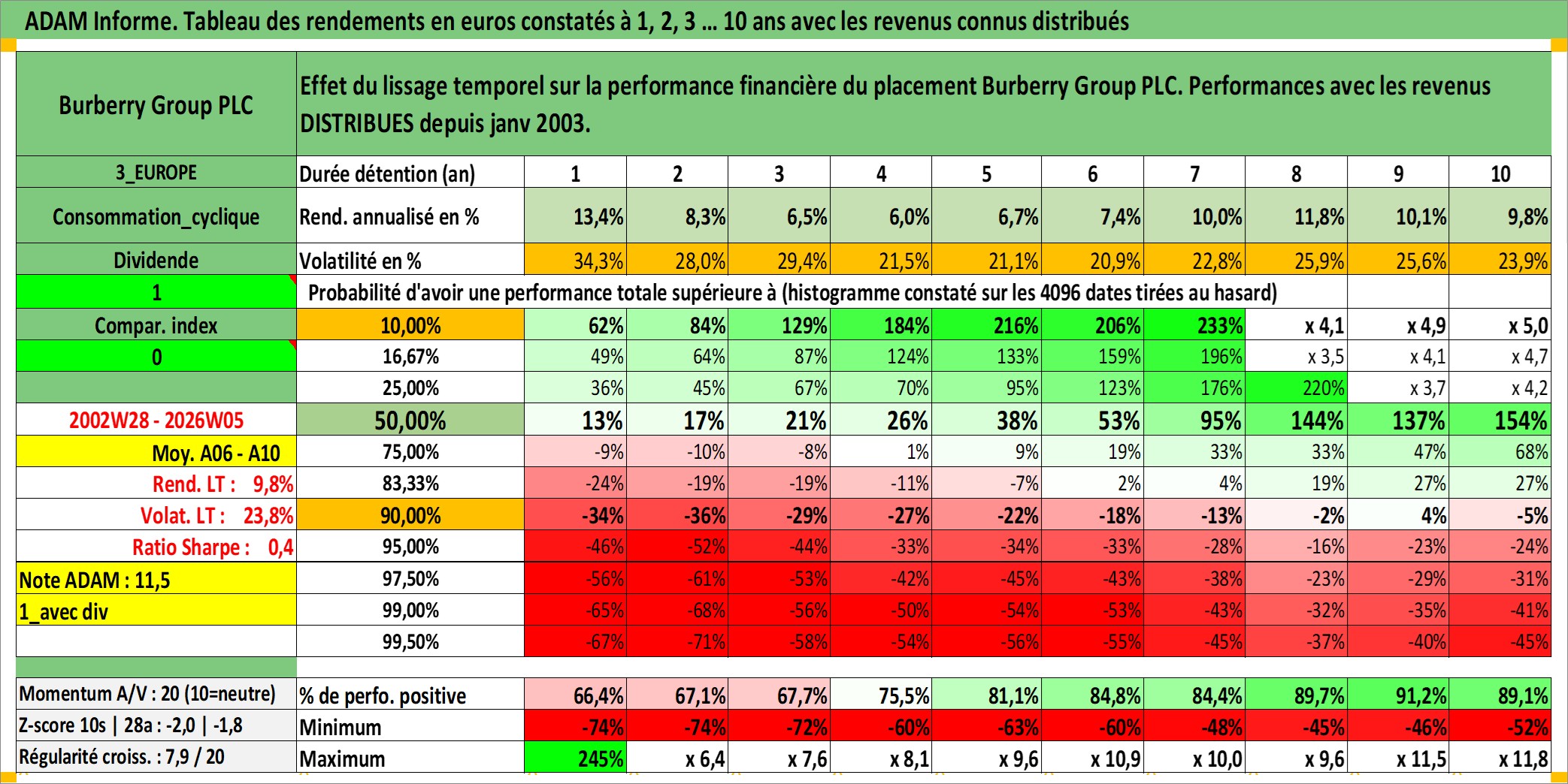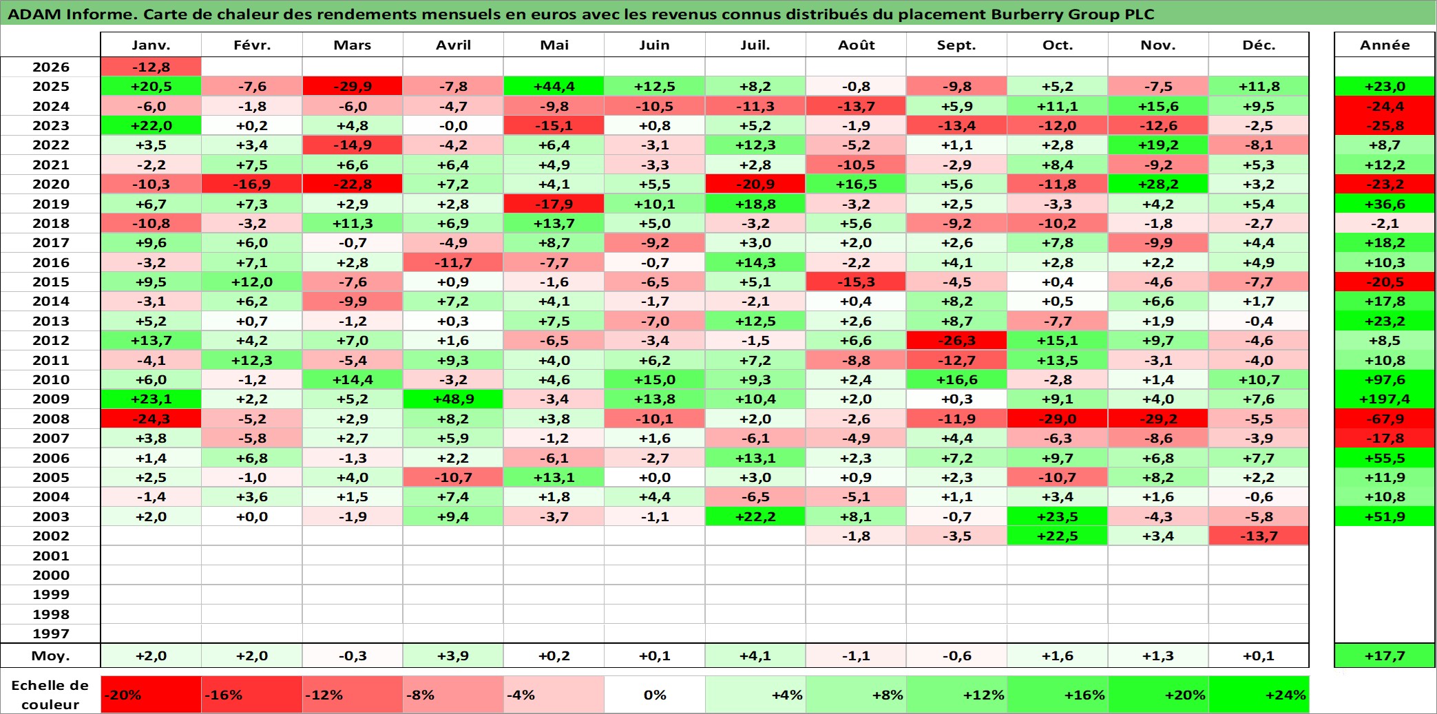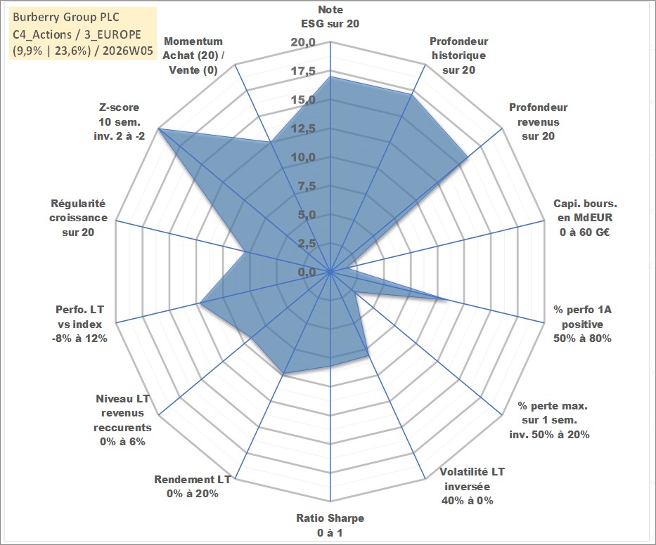 Site dédié aux investisseursPage dédiée sur site financeAnalyse des valorisations hebdomadaires de l'action Burberry Group PLC. Cet actif est cote en GBX. Les valorisations sont en contrevaleur EURO et couvrent les semaines 2002W28 a 2026W05. Les revenus de cet actif financier sont pris en compte depuis la semaine 2003W04. La note globale ESG de cet actif est estimee a 17.0 (apres rebasage entre 0 et 20).
