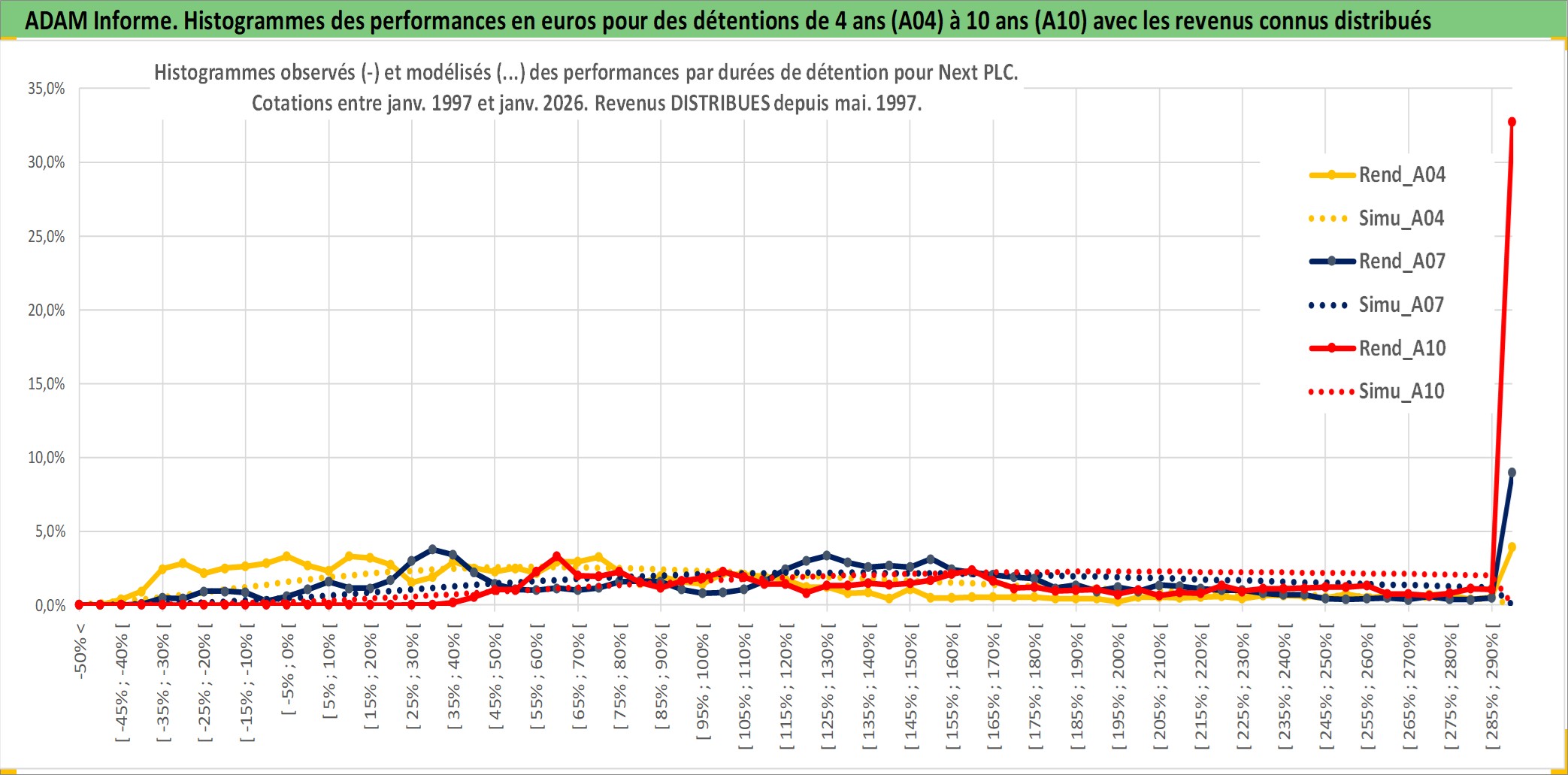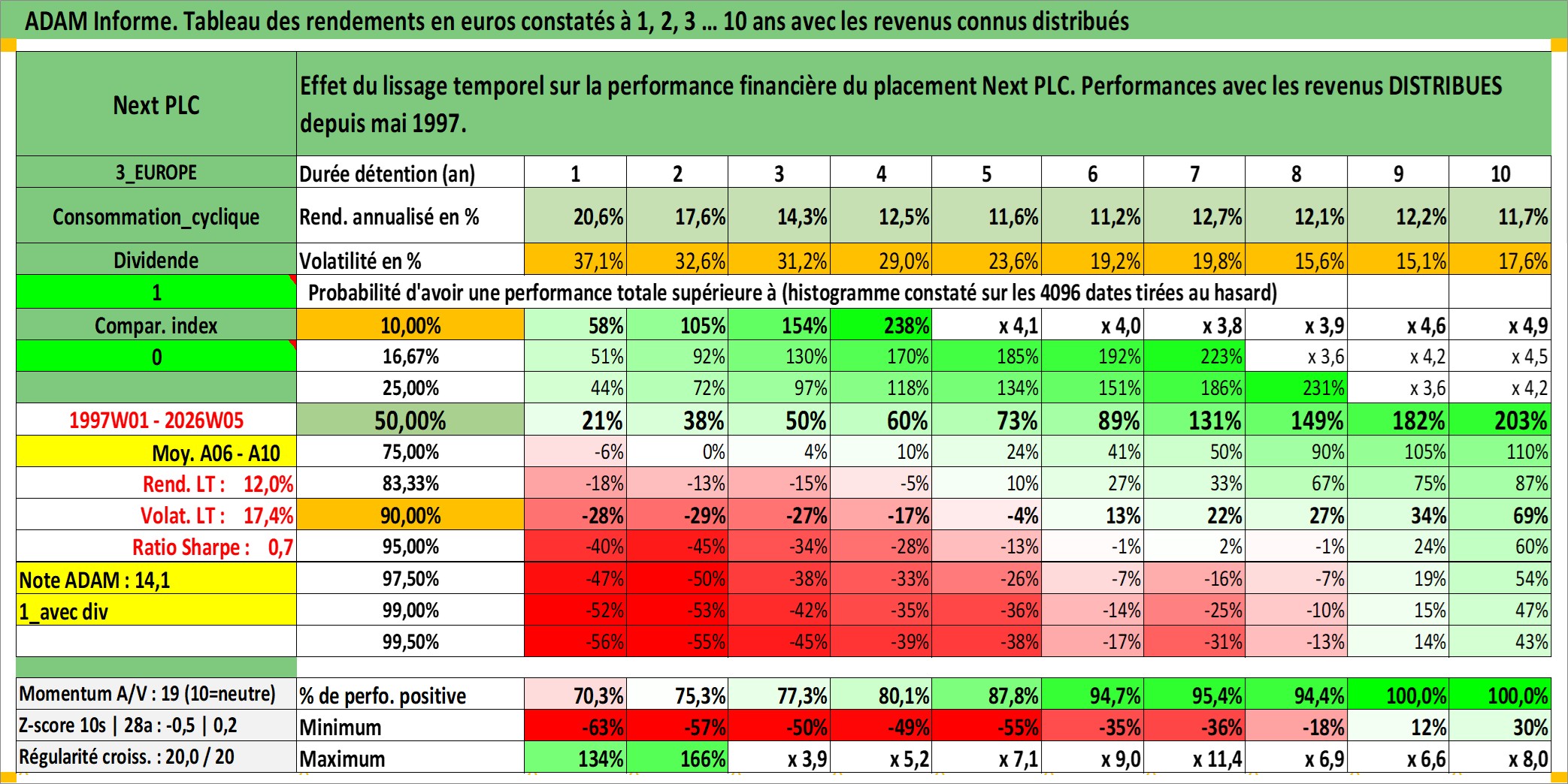 Site dédié aux investisseursPage dédiée sur site financeAnalyse des valorisations hebdomadaires de l'action Next PLC. Cet actif est cote en GBX. Les valorisations sont en contrevaleur EURO et couvrent les semaines 1997W01 a 2026W05. Les revenus de cet actif financier sont pris en compte depuis la semaine 1997W22. La note globale ESG de cet actif est estimee a 13.0 (apres rebasage entre 0 et 20).
