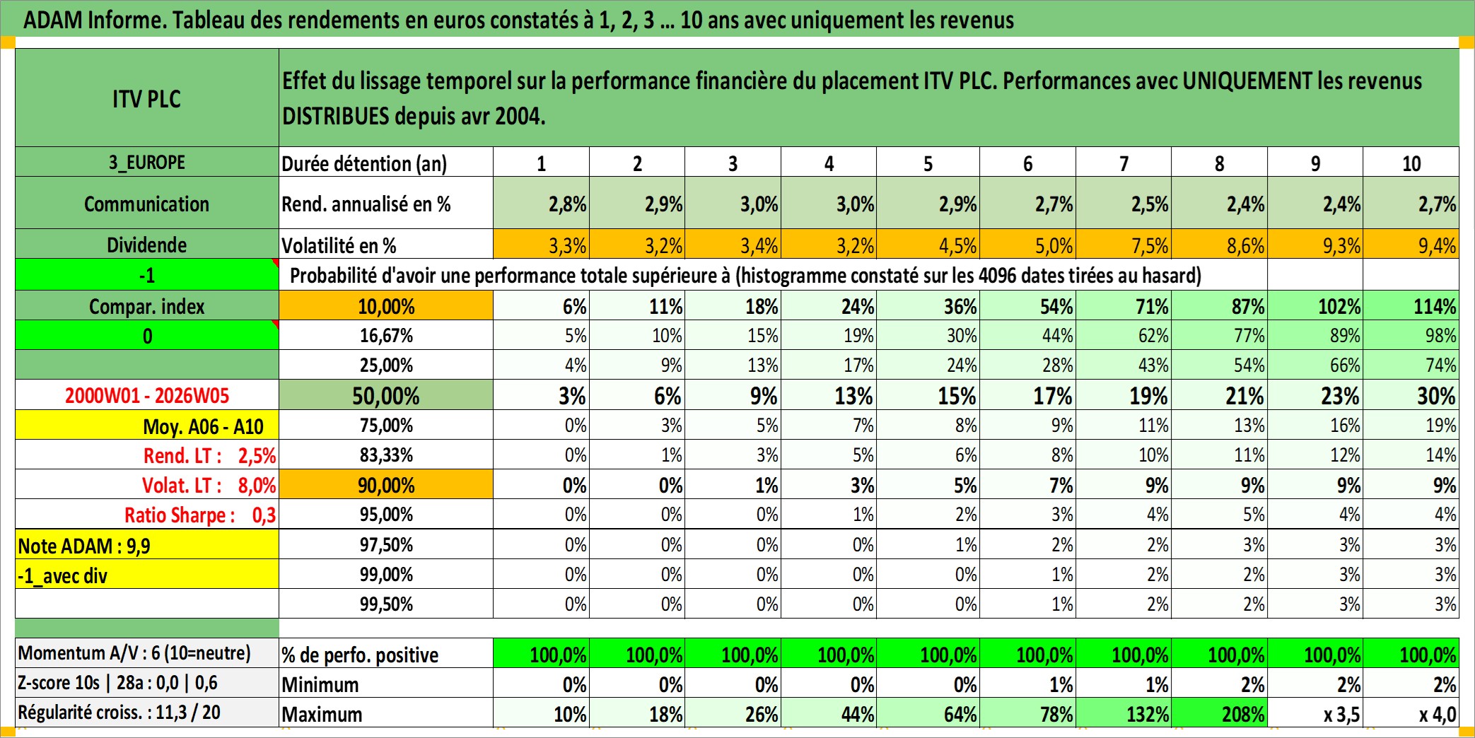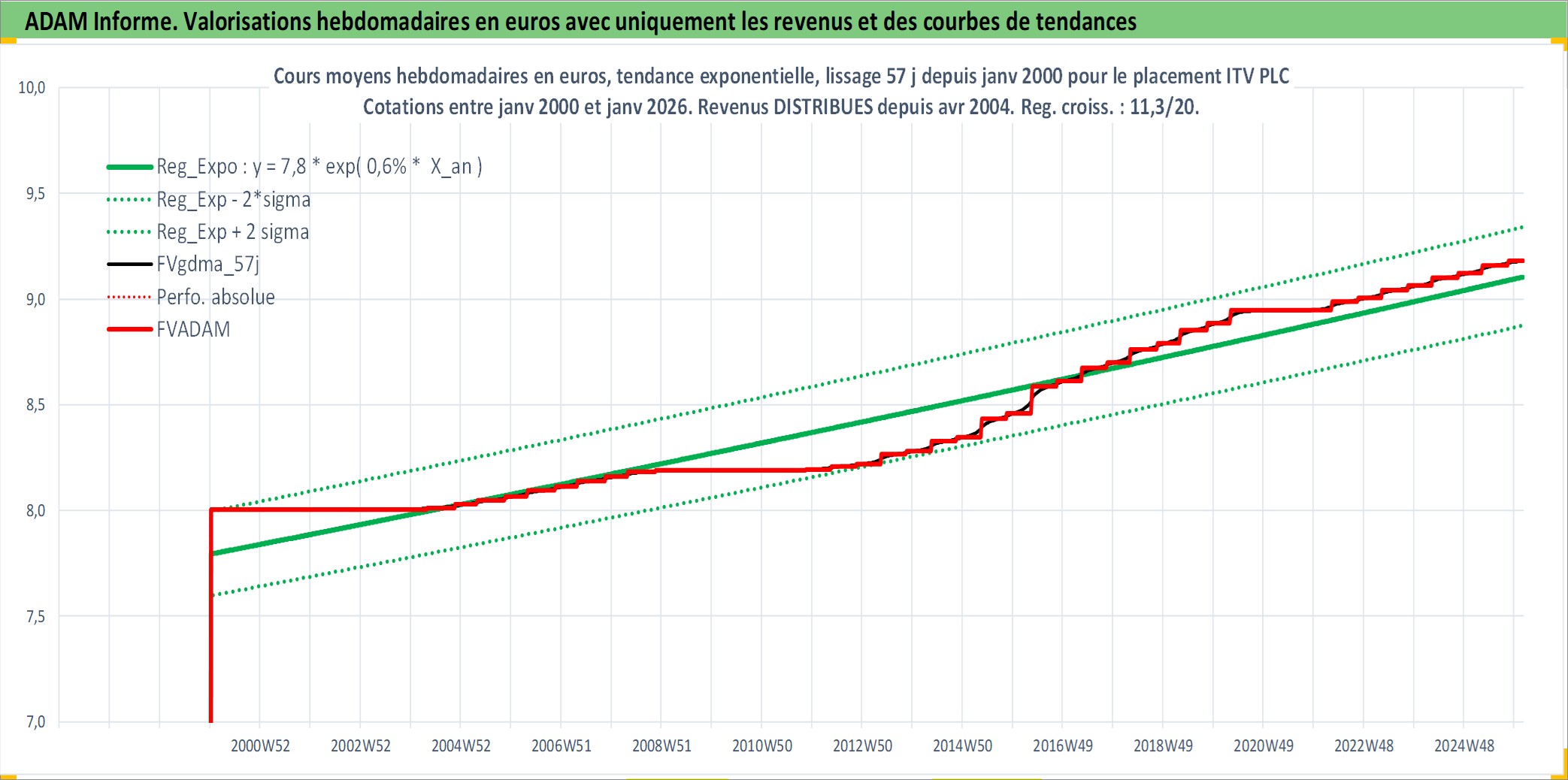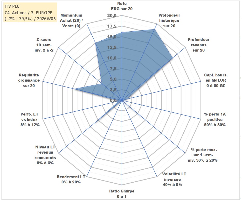 Site dédié aux investisseursPage dédiée sur site financeAnalyse des valorisations hebdomadaires de l'action ITV PLC. Cet actif est cote en GBX. Les valorisations sont en contrevaleur EURO et couvrent les semaines 2000W01 a 2026W05. Les revenus de cet actif financier sont pris en compte depuis la semaine 2004W17. La note globale ESG de cet actif est estimee a 16.0 (apres rebasage entre 0 et 20).
