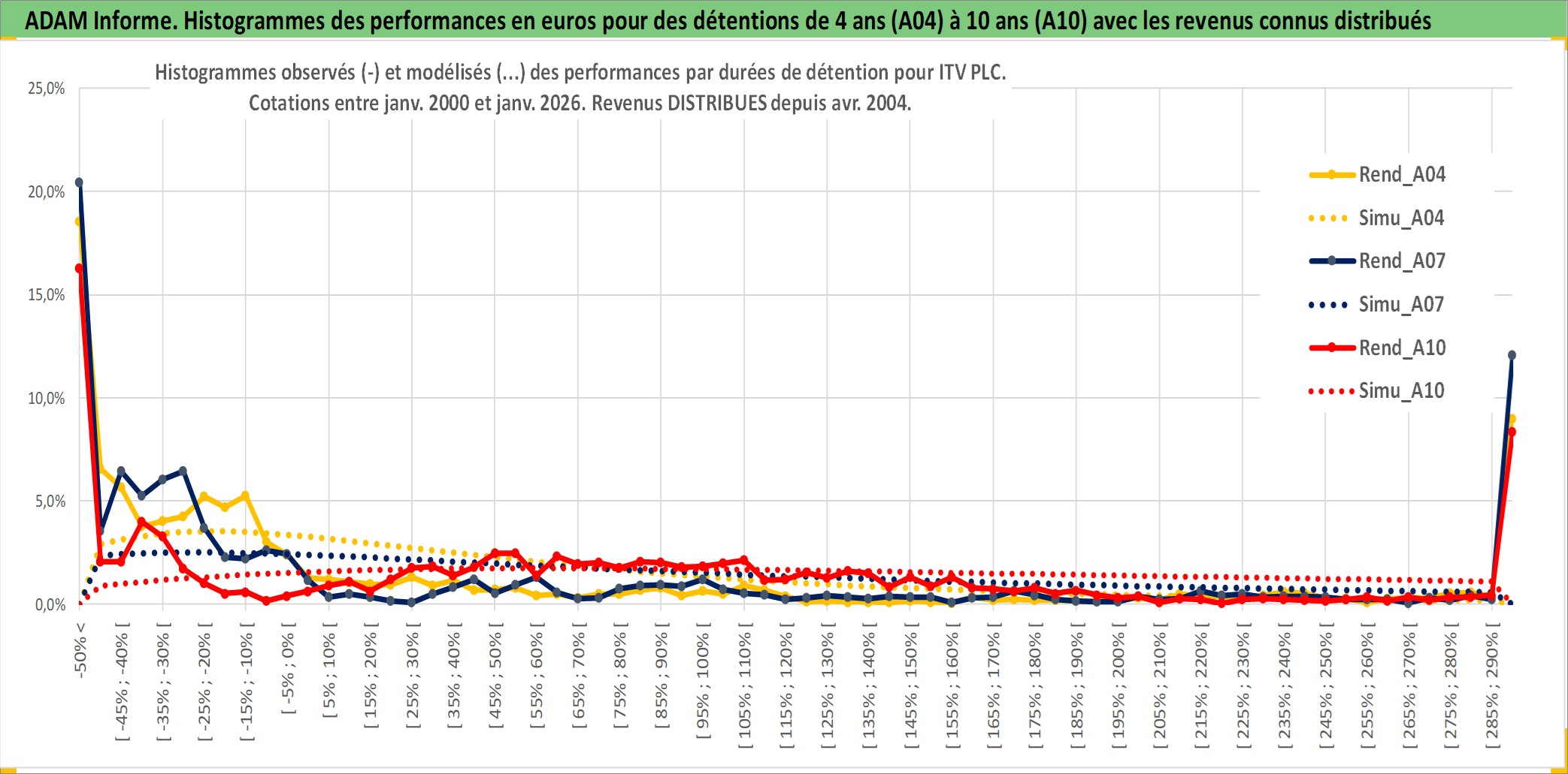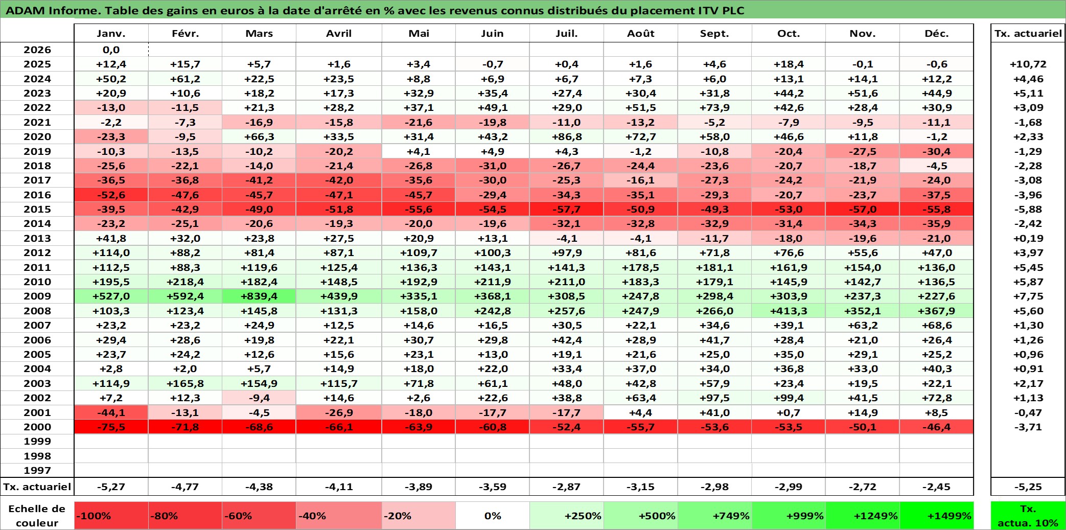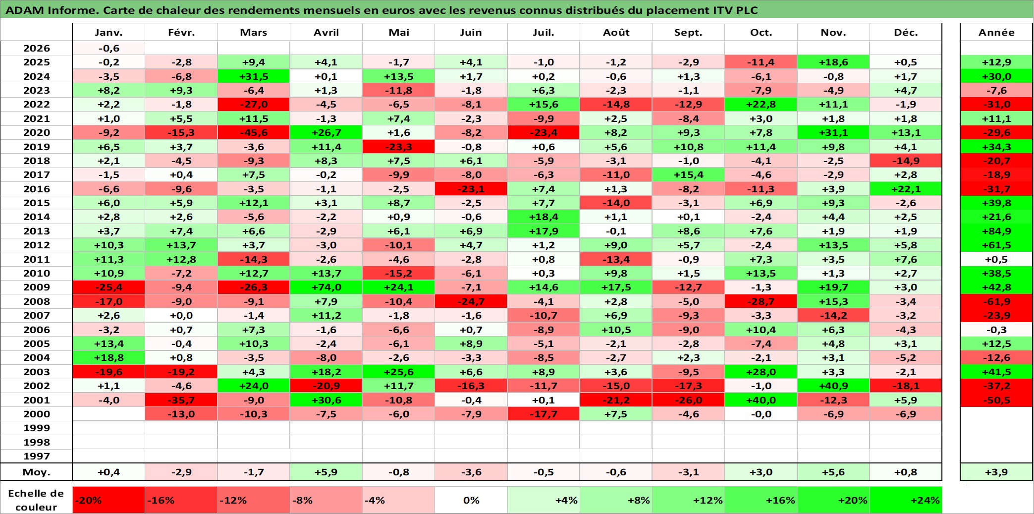 Site dédié aux investisseursPage dédiée sur site financeAnalyse des valorisations hebdomadaires de l'action ITV PLC. Cet actif est cote en GBX. Les valorisations sont en contrevaleur EURO et couvrent les semaines 2000W01 a 2026W05. Les revenus de cet actif financier sont pris en compte depuis la semaine 2004W17. La note globale ESG de cet actif est estimee a 16.0 (apres rebasage entre 0 et 20).