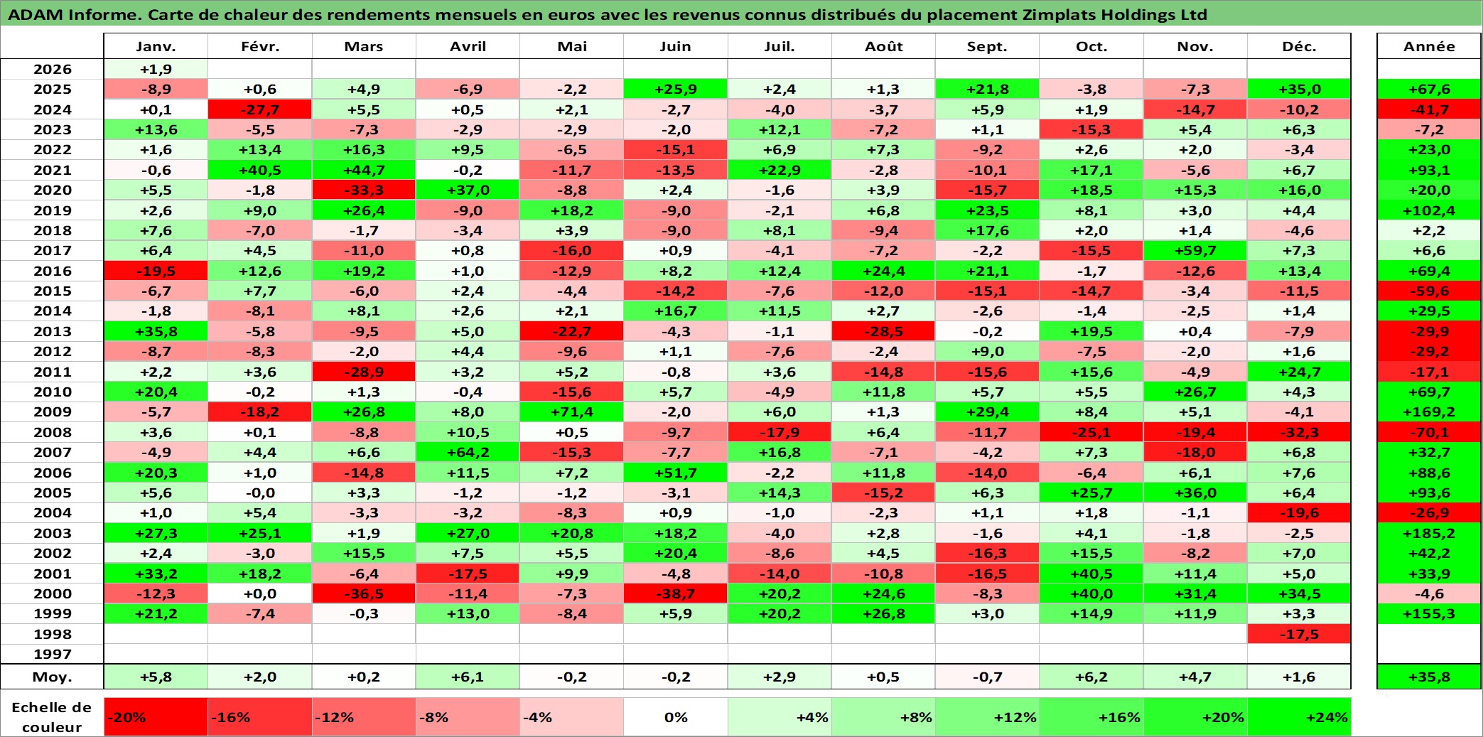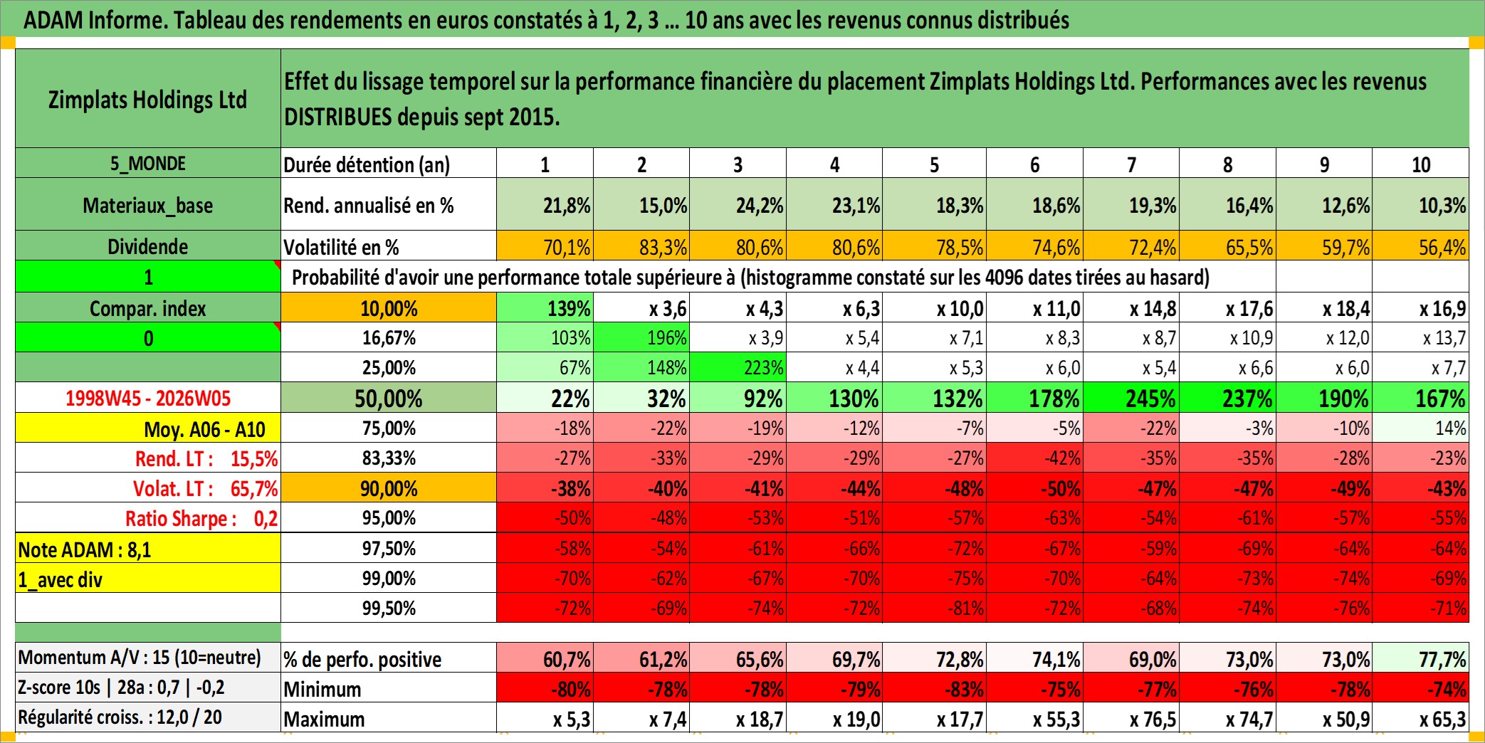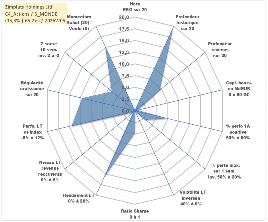 Site dédié aux investisseursPage dédiée sur site financeAnalyse des valorisations hebdomadaires de l'action Zimplats Holdings Ltd. Cet actif est cote en AUD. Les valorisations sont en contrevaleur EURO et couvrent les semaines 1998W45 a 2026W05. Les revenus de cet actif financier sont pris en compte depuis la semaine 2015W37. La note ESG de cet actif n'est pas connue.