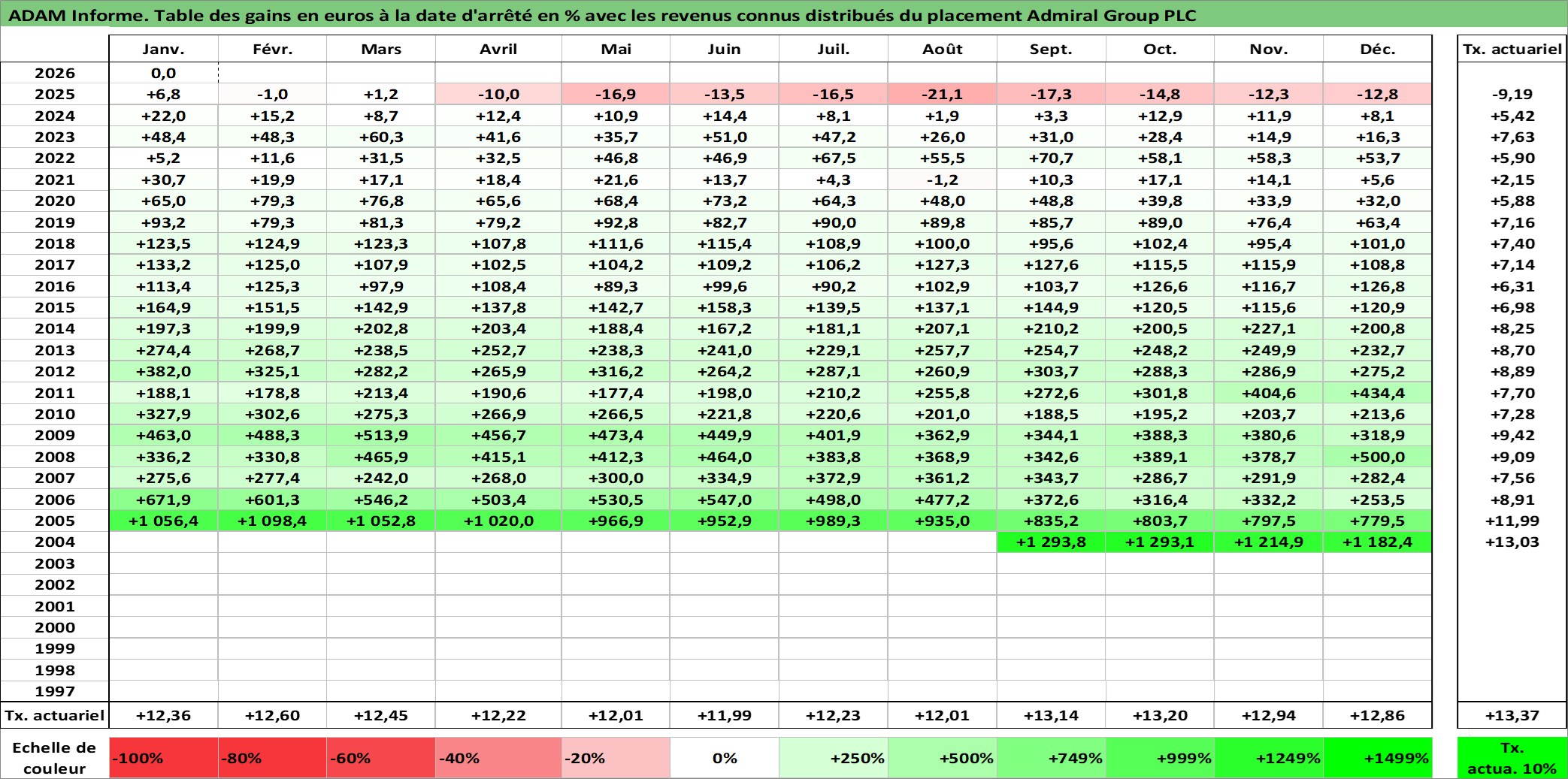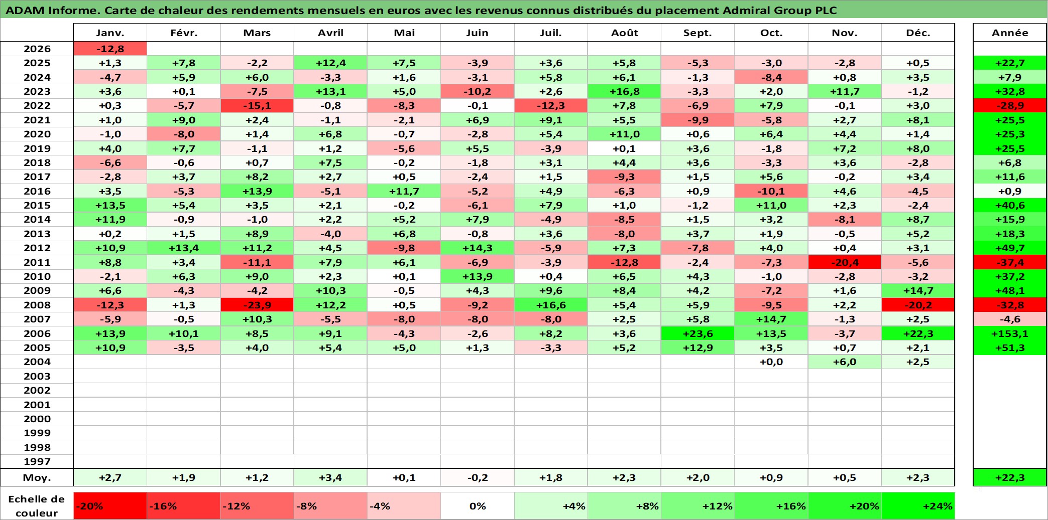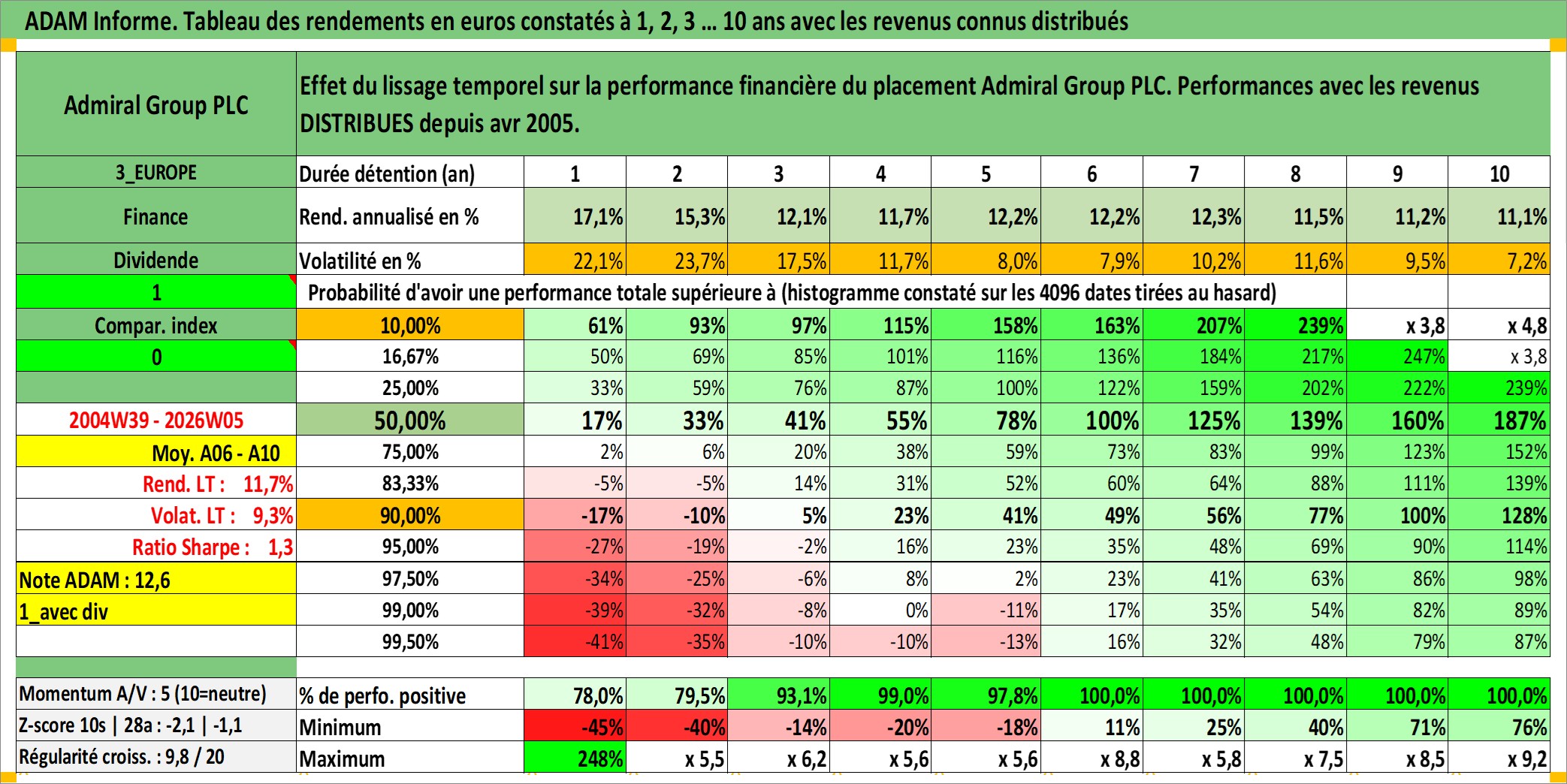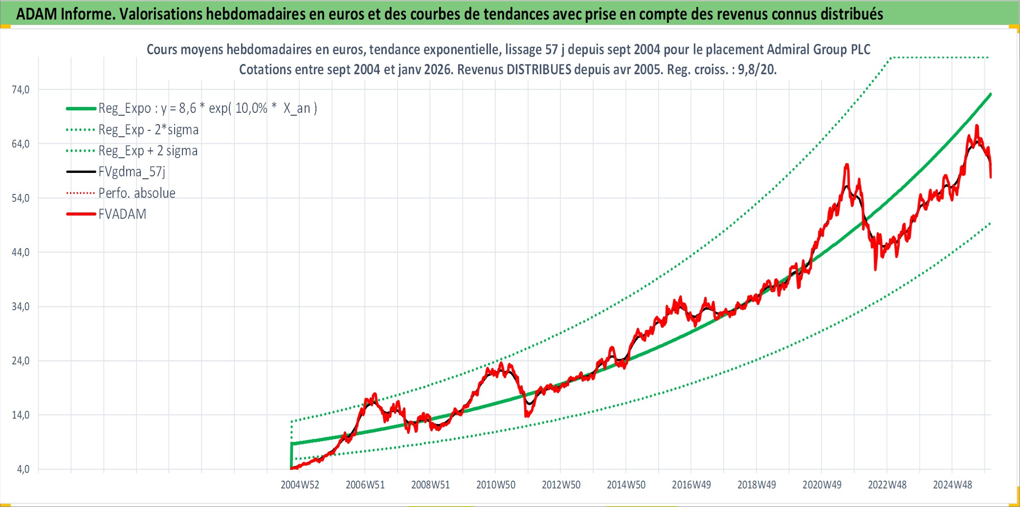 Site dédié aux investisseursPage dédiée sur site financeAnalyse des valorisations hebdomadaires de l'action Admiral Group PLC. Cet actif est cote en GBX. Les valorisations sont en contrevaleur EURO et couvrent les semaines 2004W39 a 2026W05. Les revenus de cet actif financier sont pris en compte depuis la semaine 2005W17. La note globale ESG de cet actif est estimee a 9.0 (apres rebasage entre 0 et 20).