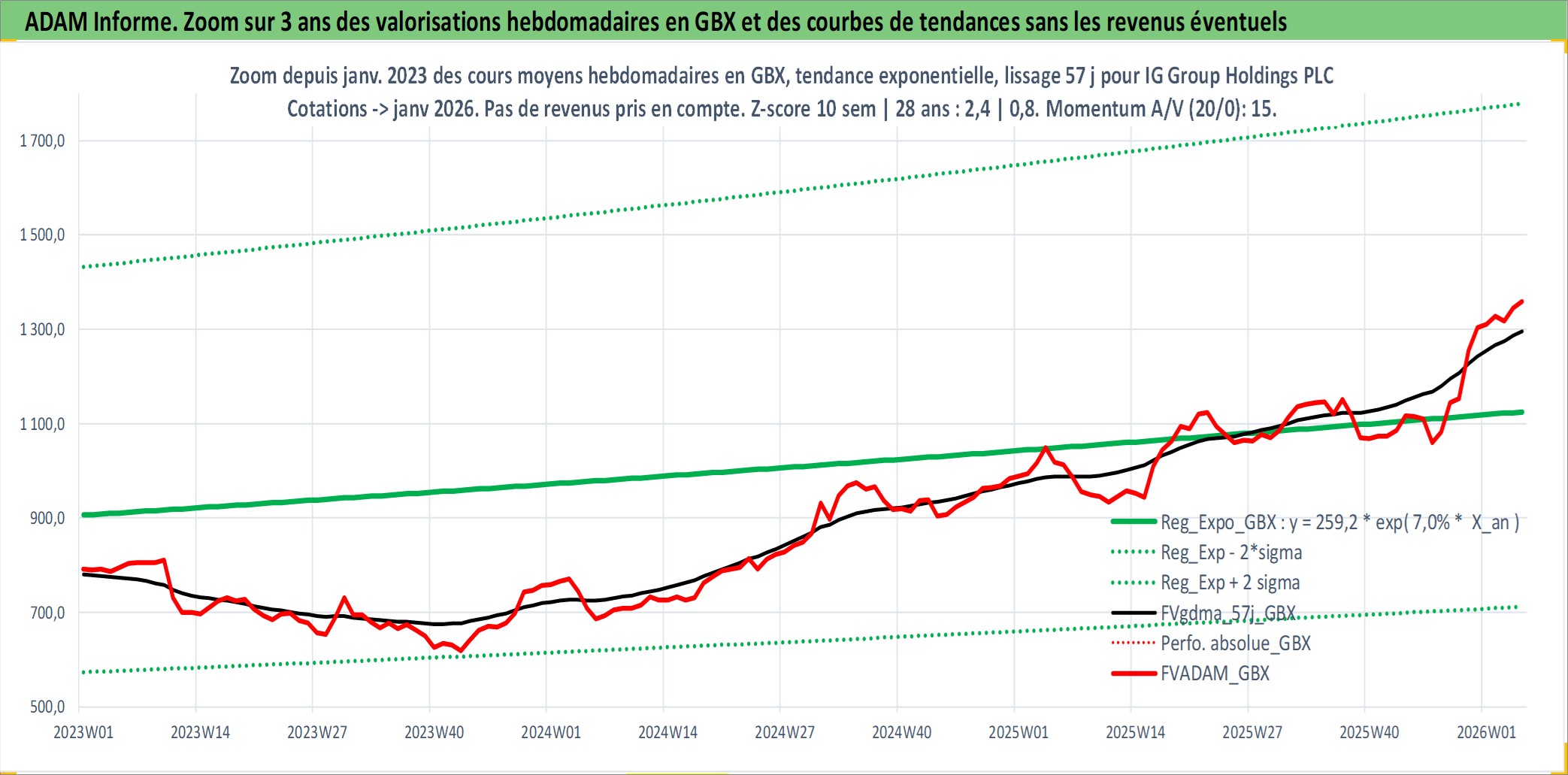 Site dédié aux investisseursPage dédiée sur site financeAnalyse des valorisations hebdomadaires de l'action IG Group Holdings PLC. Cet actif est cote en GBX. Les valorisations sont en contrevaleur EURO et couvrent les semaines 2005W17 a 2026W05. Les revenus de cet actif financier sont pris en compte depuis la semaine 2006W05. La note ESG de cet actif n'est pas connue.