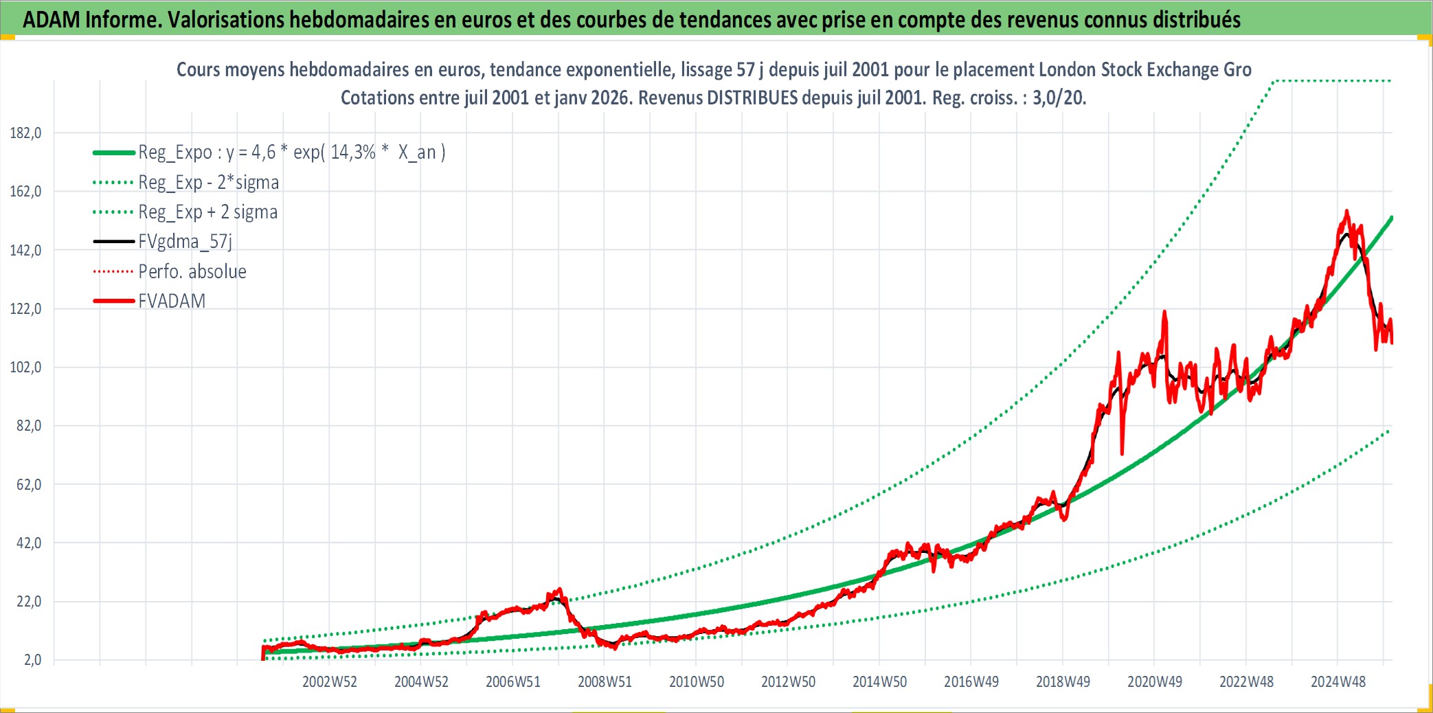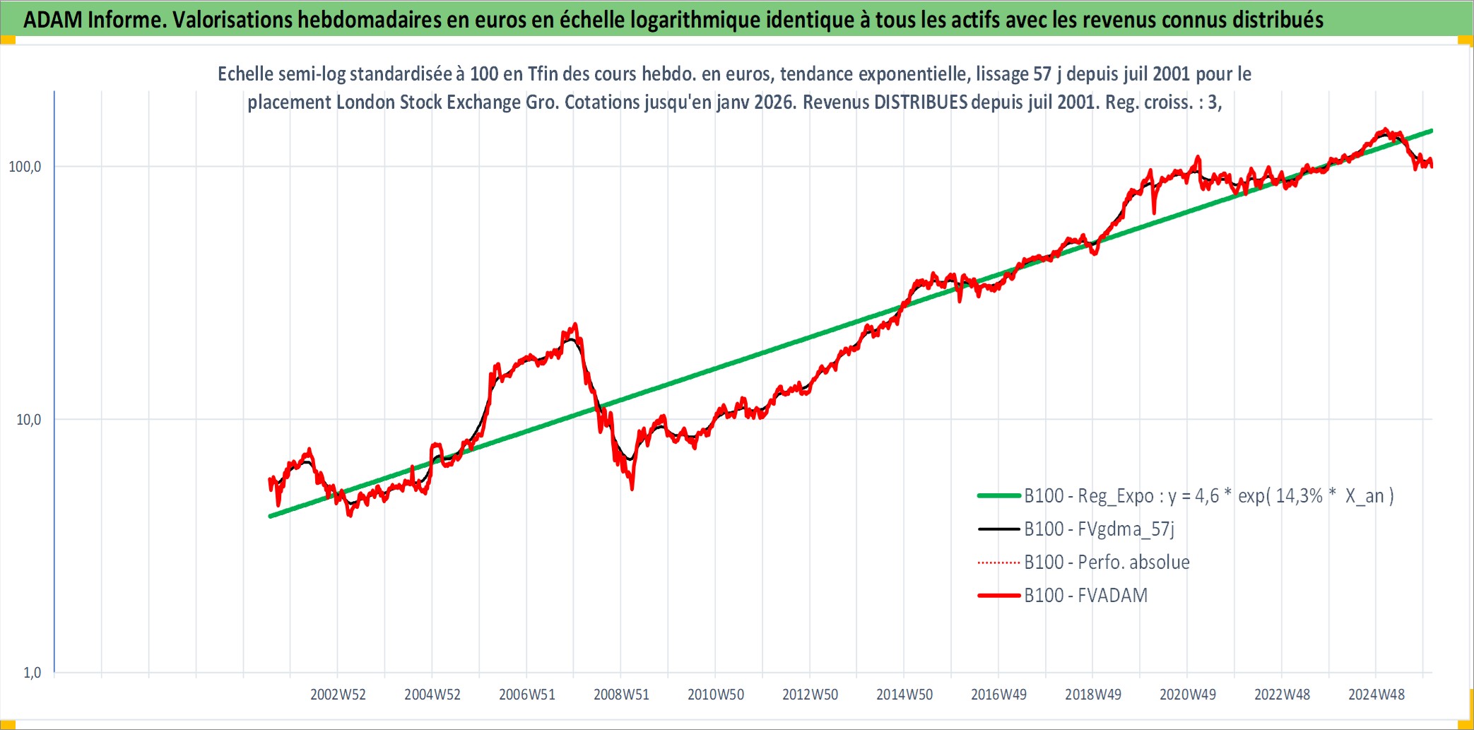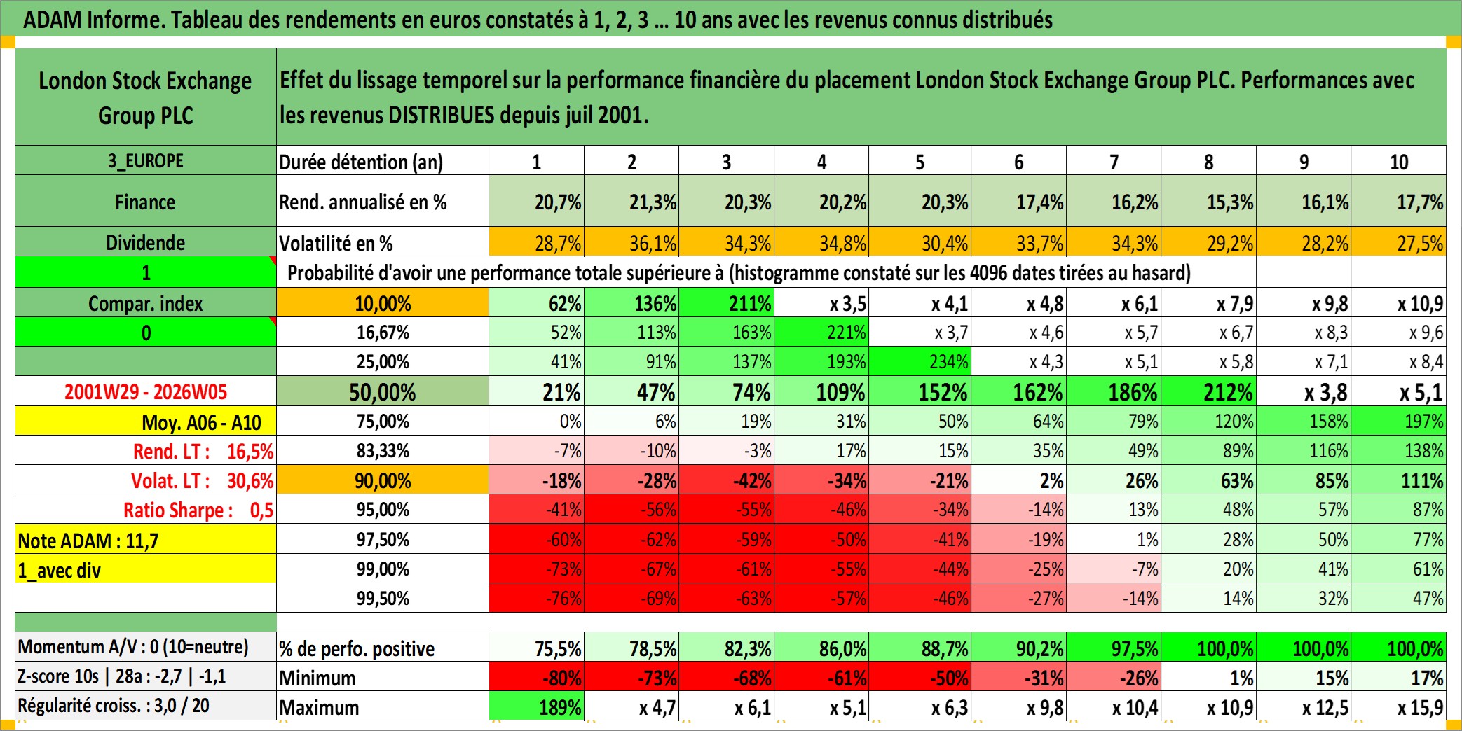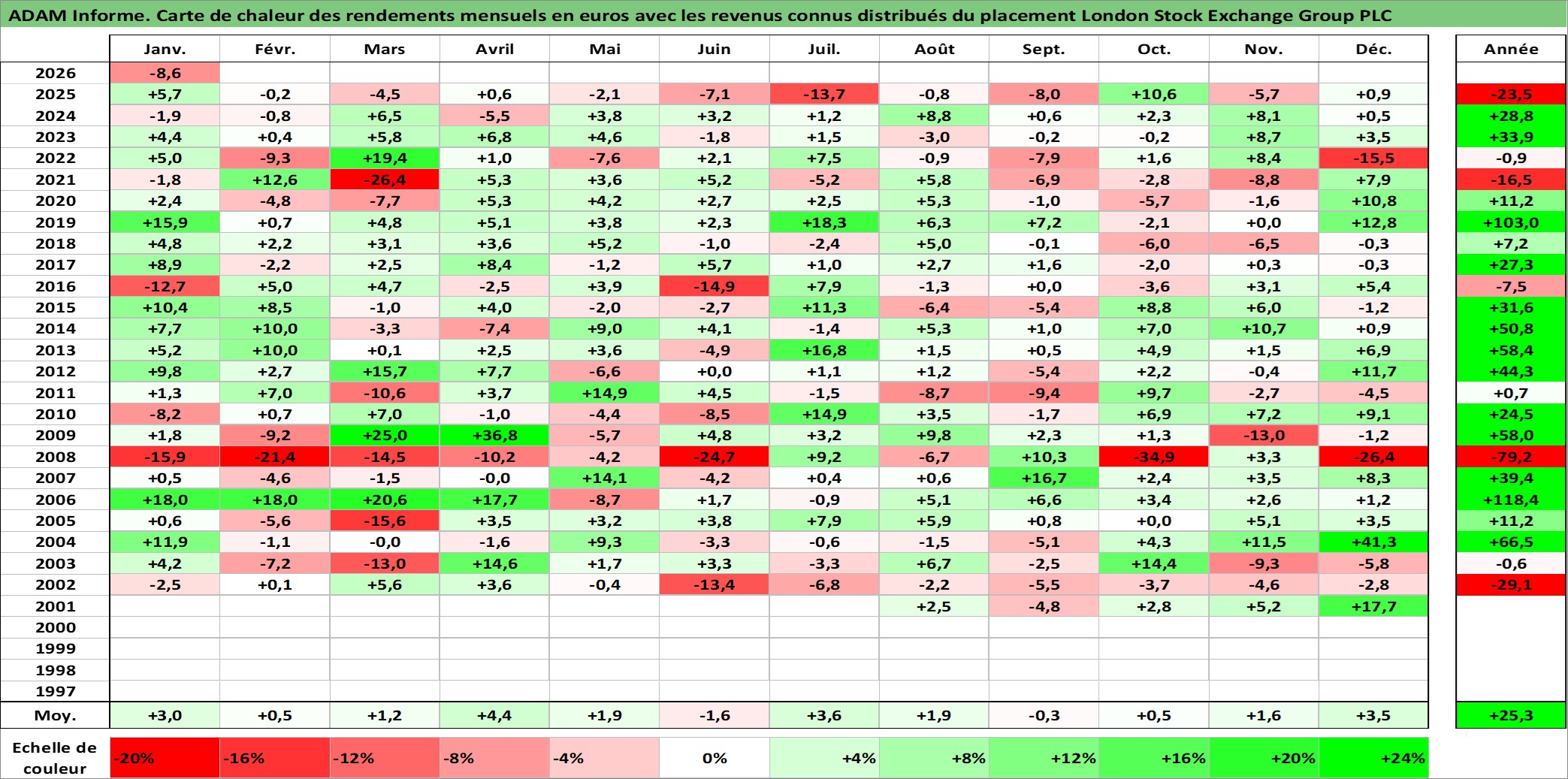 Site dédié aux investisseursPage dédiée sur site financeAnalyse des valorisations hebdomadaires de l'action London Stock Exchange Group PLC. Cet actif est cote en GBX. Les valorisations sont en contrevaleur EURO et couvrent les semaines 2001W29 a 2026W05. Les revenus de cet actif financier sont pris en compte depuis la semaine 2001W31. La note globale ESG de cet actif est estimee a 11.0 (apres rebasage entre 0 et 20).